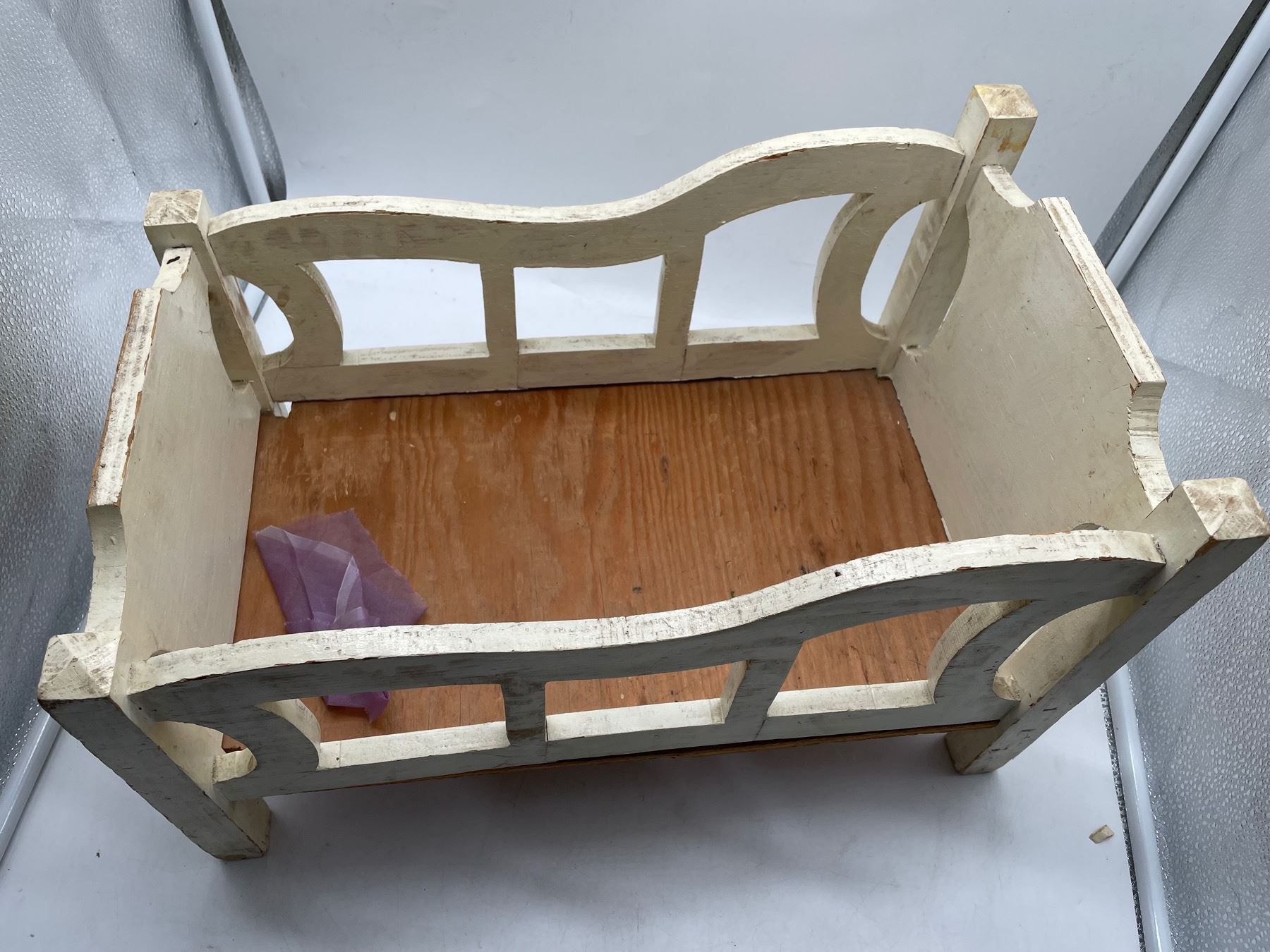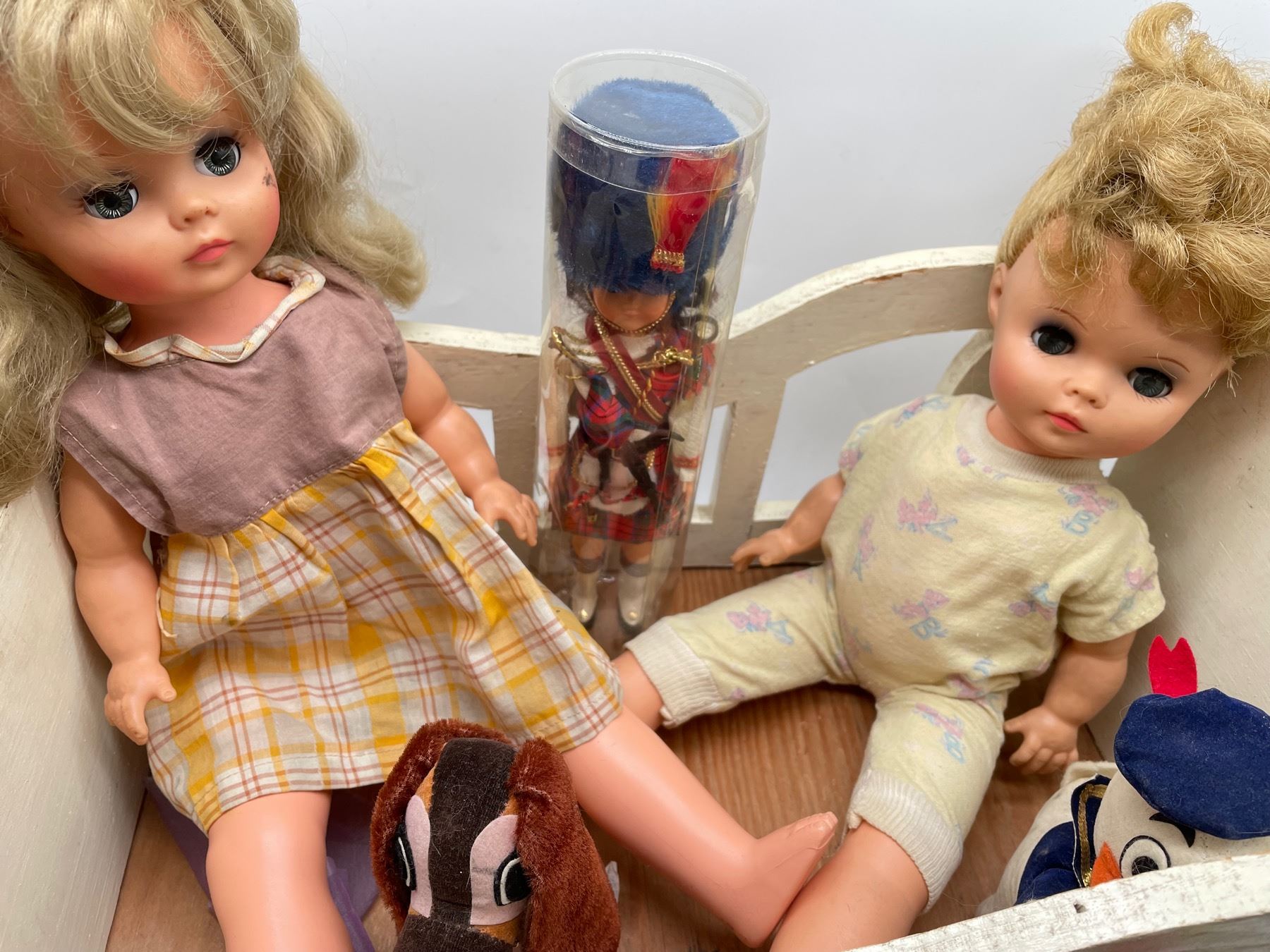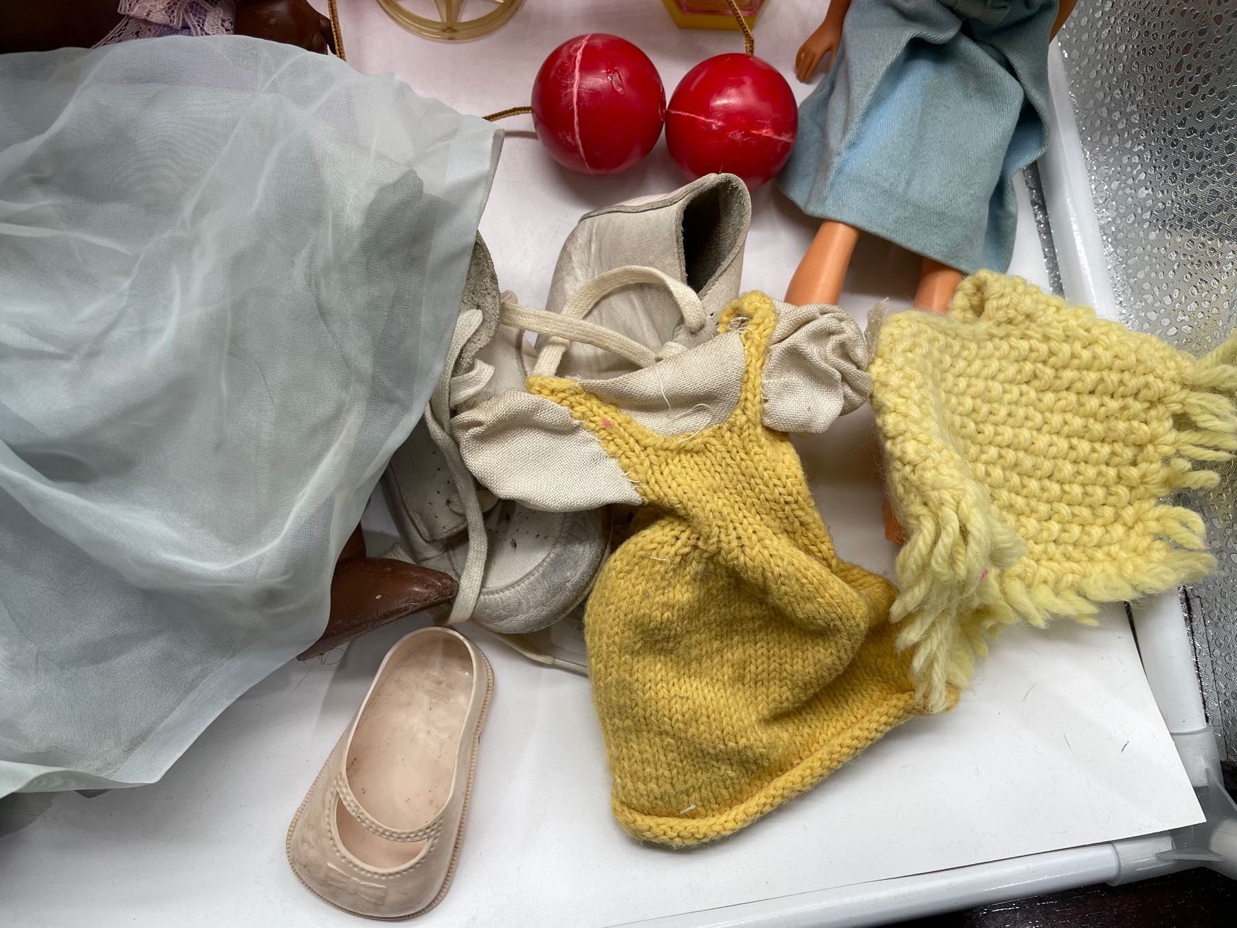 Vintage dolls in worn and played with condition. Lot includes some retro homemade Barbie clothes with vintage Barbie, as well as a crib and stool.