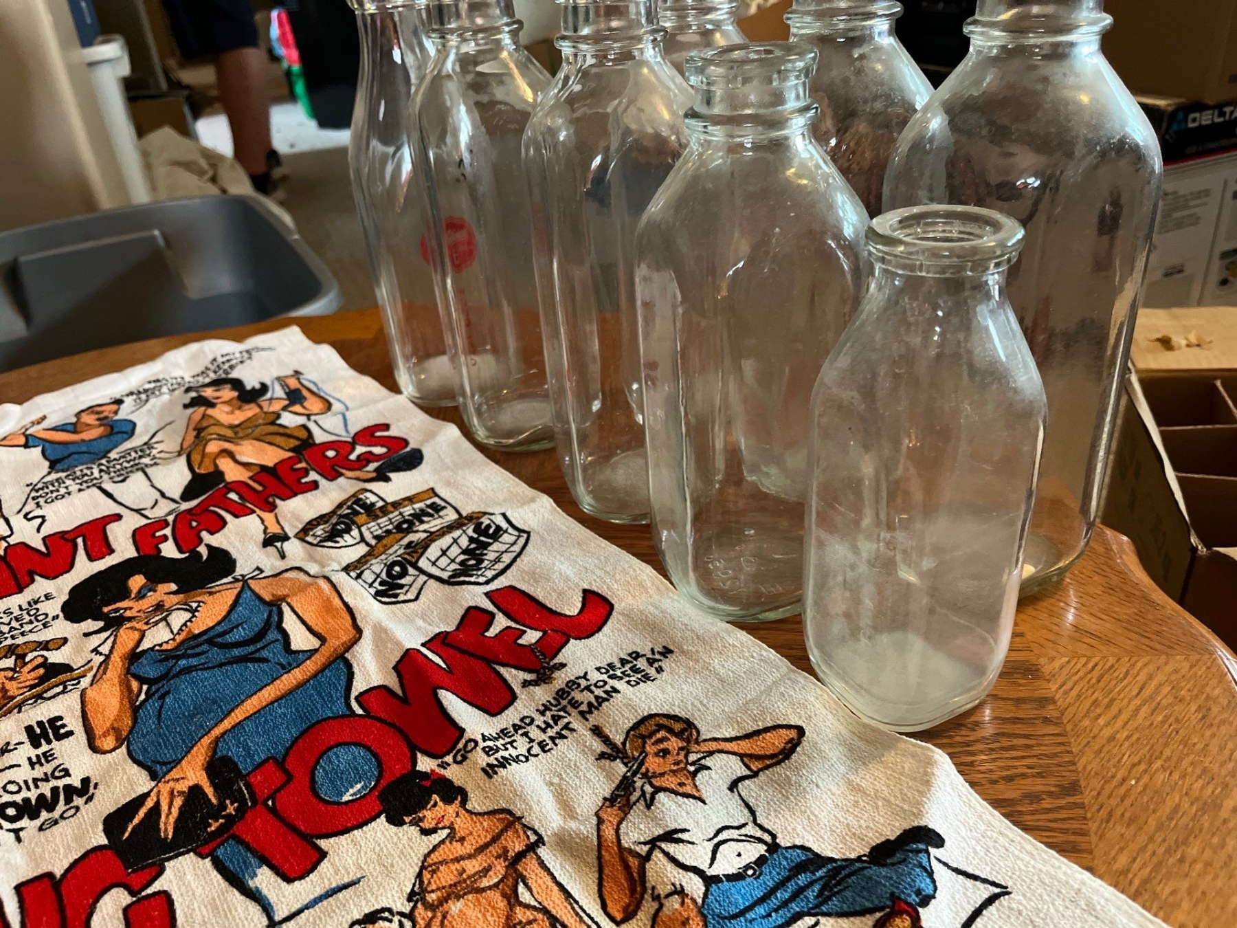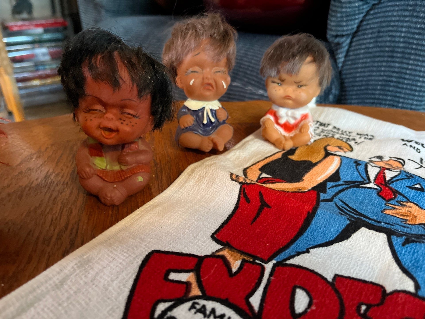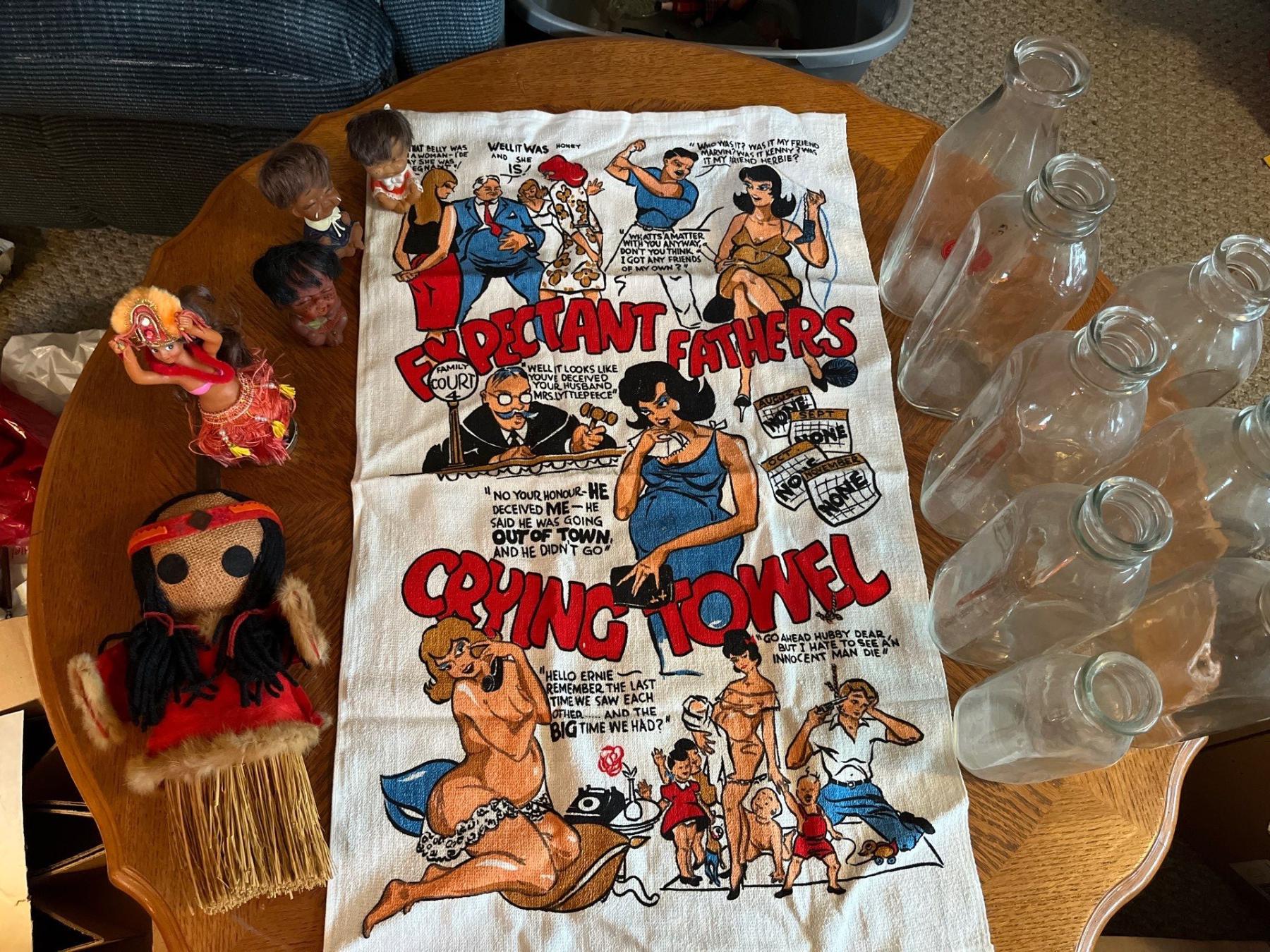 Vintage expecting father’s crying towel and collection of vintage milk jugs?279 collection of antique marionette‘s and other dolls from around the world