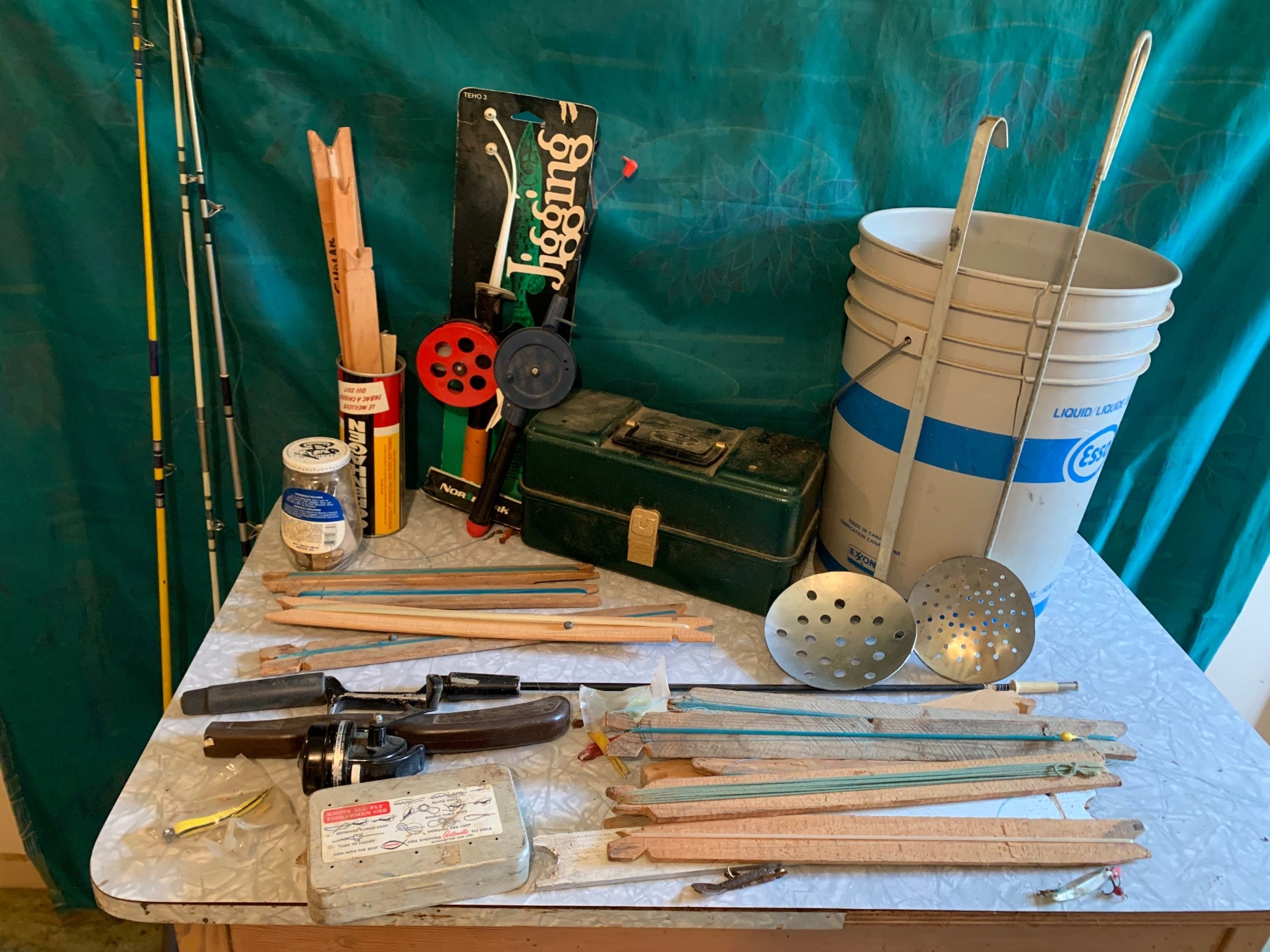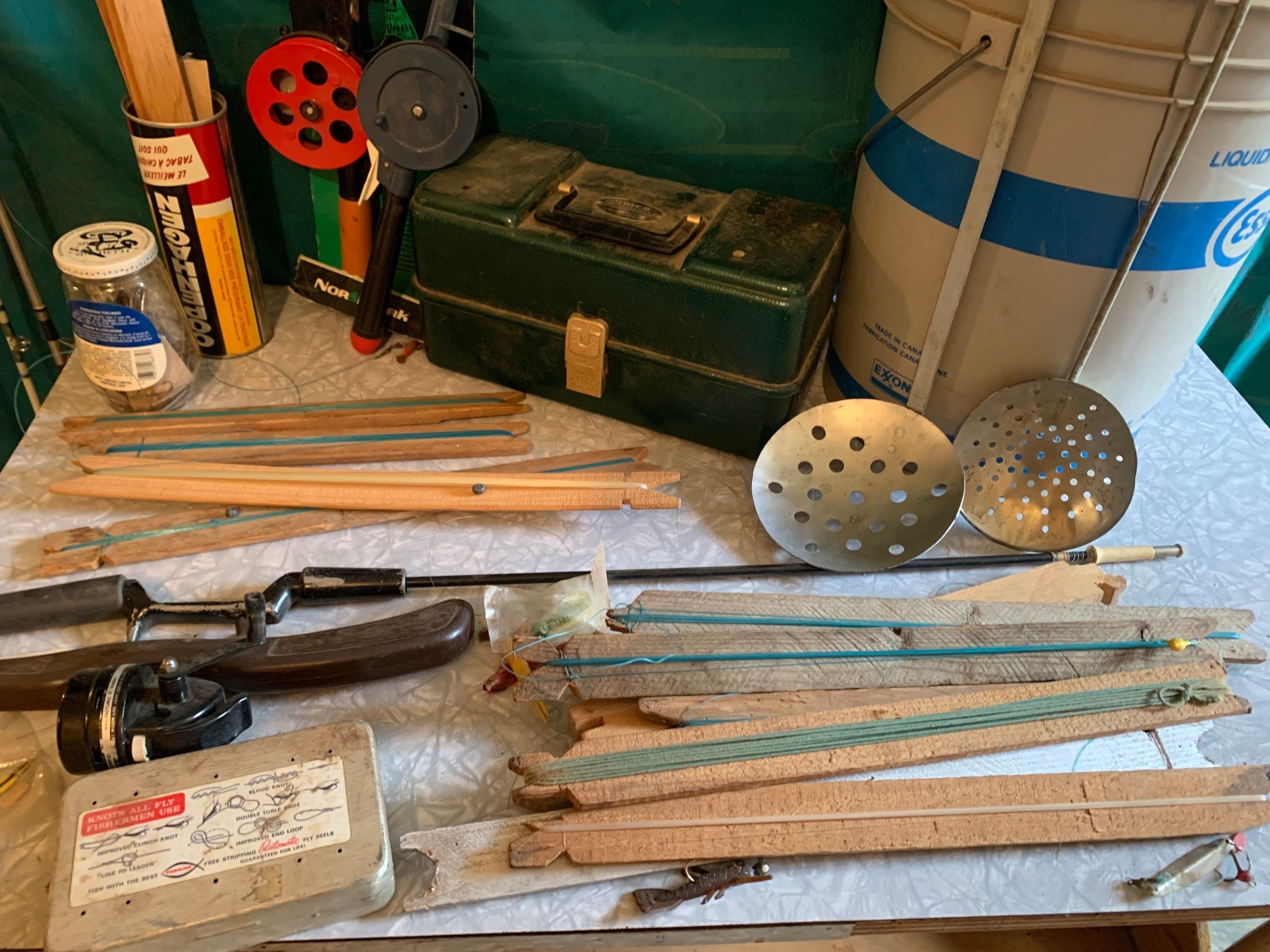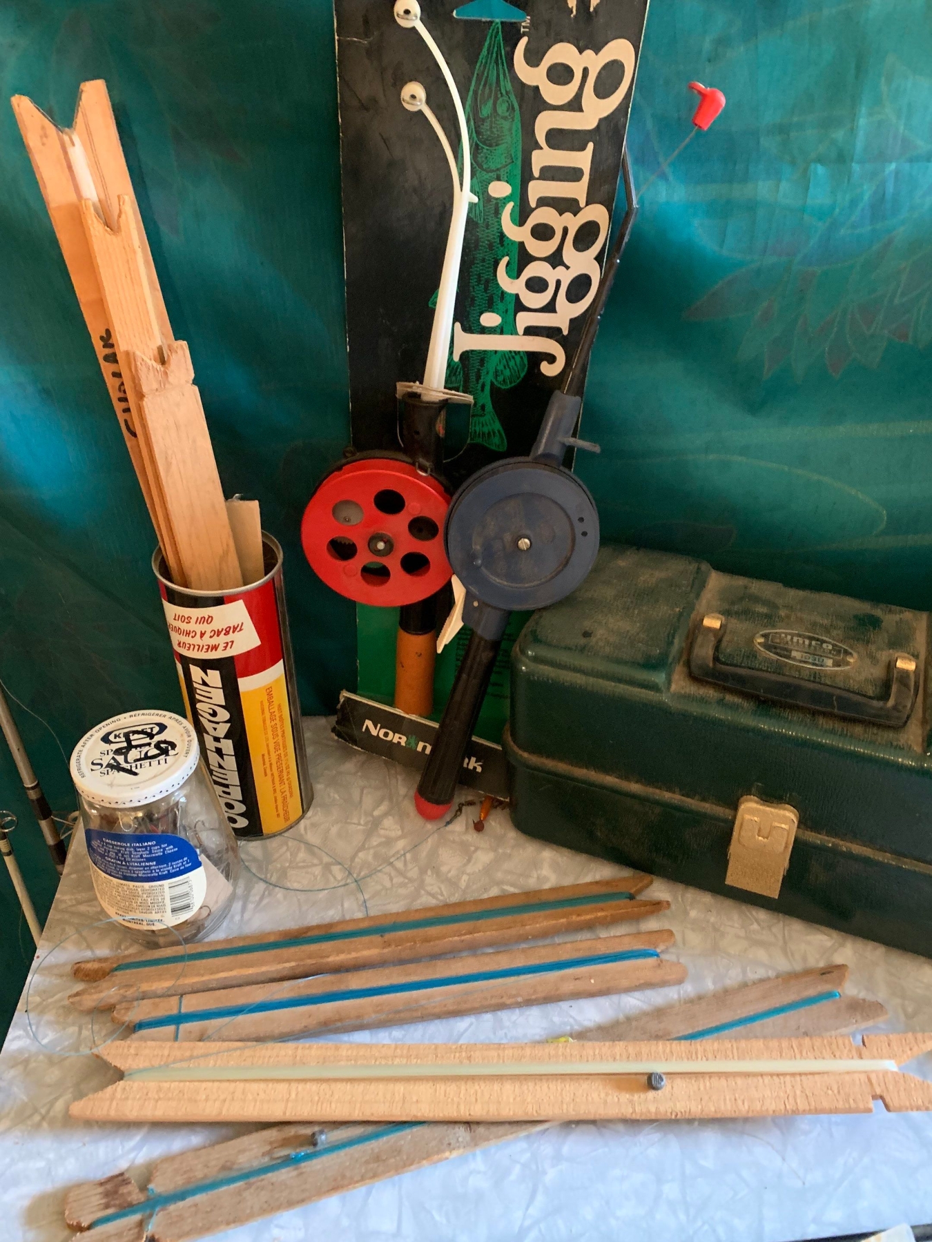 Vintage fishing lot, homemade ice fishing rods, new rods, hooks, scoops, tackle box and vintage rod