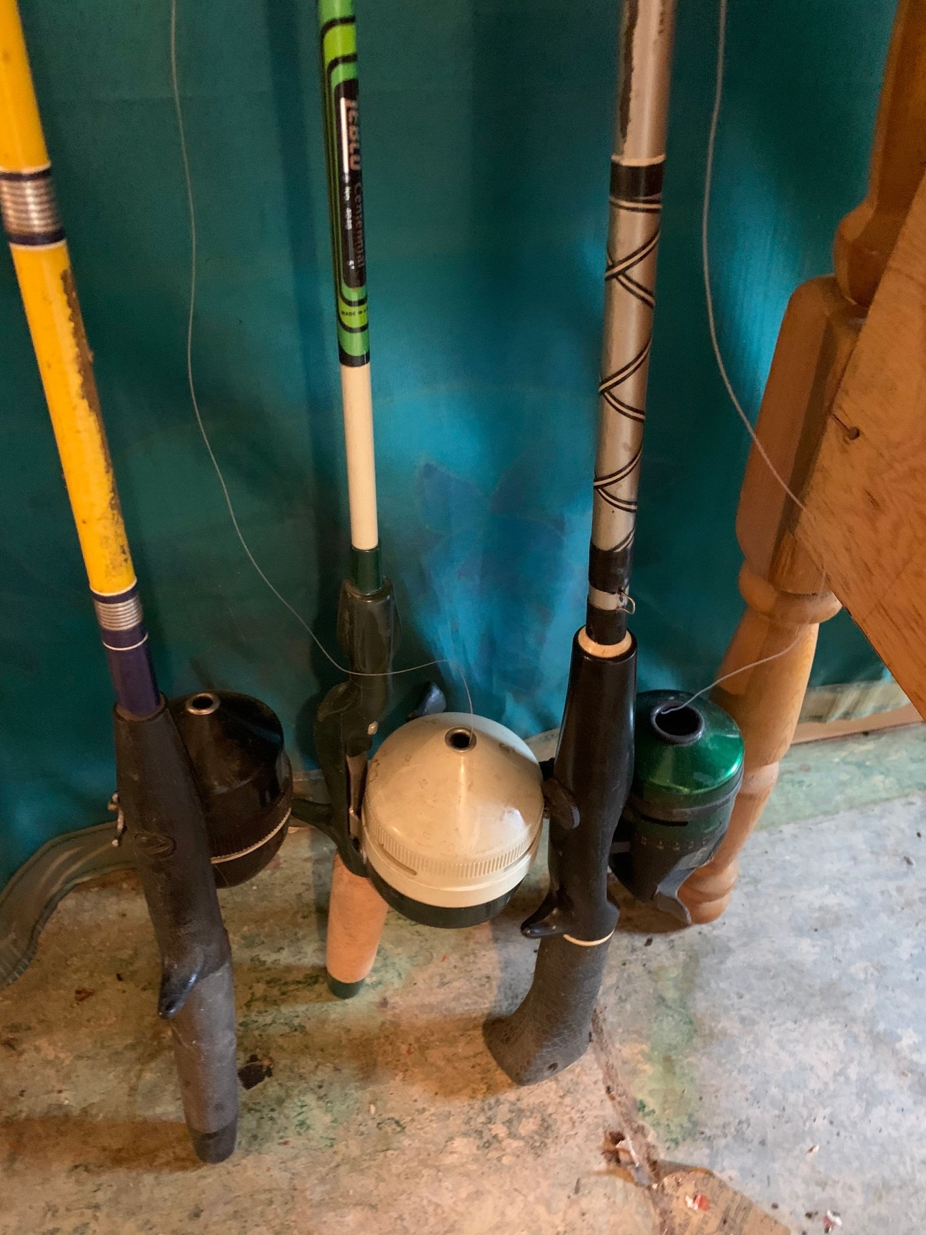 Vintage fishing lot, homemade ice fishing rods, new rods, hooks, scoops, tackle box and vintage rods