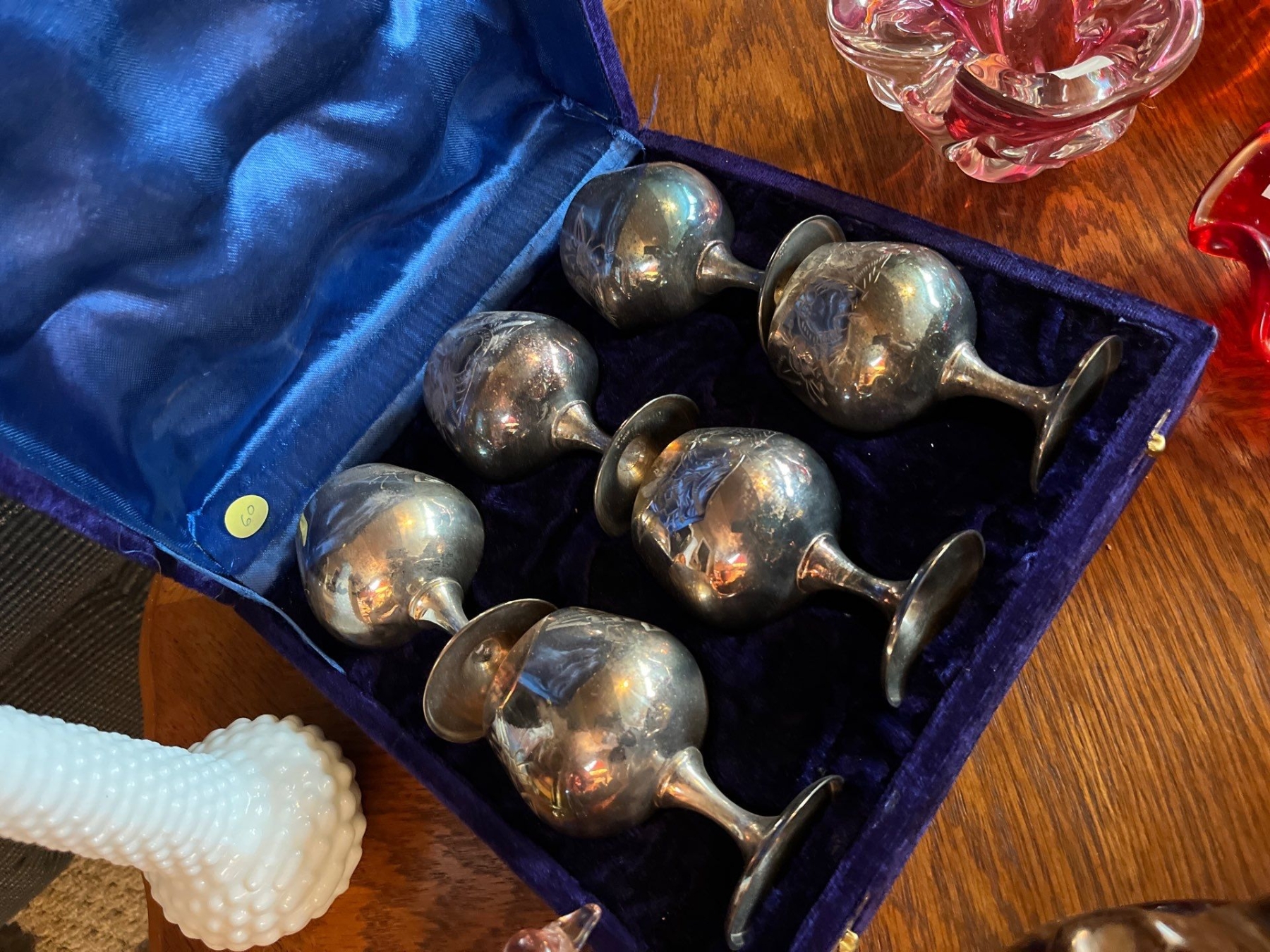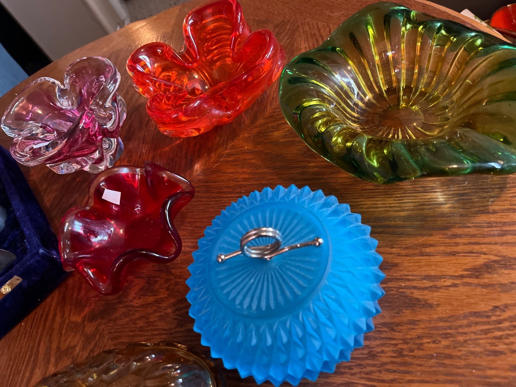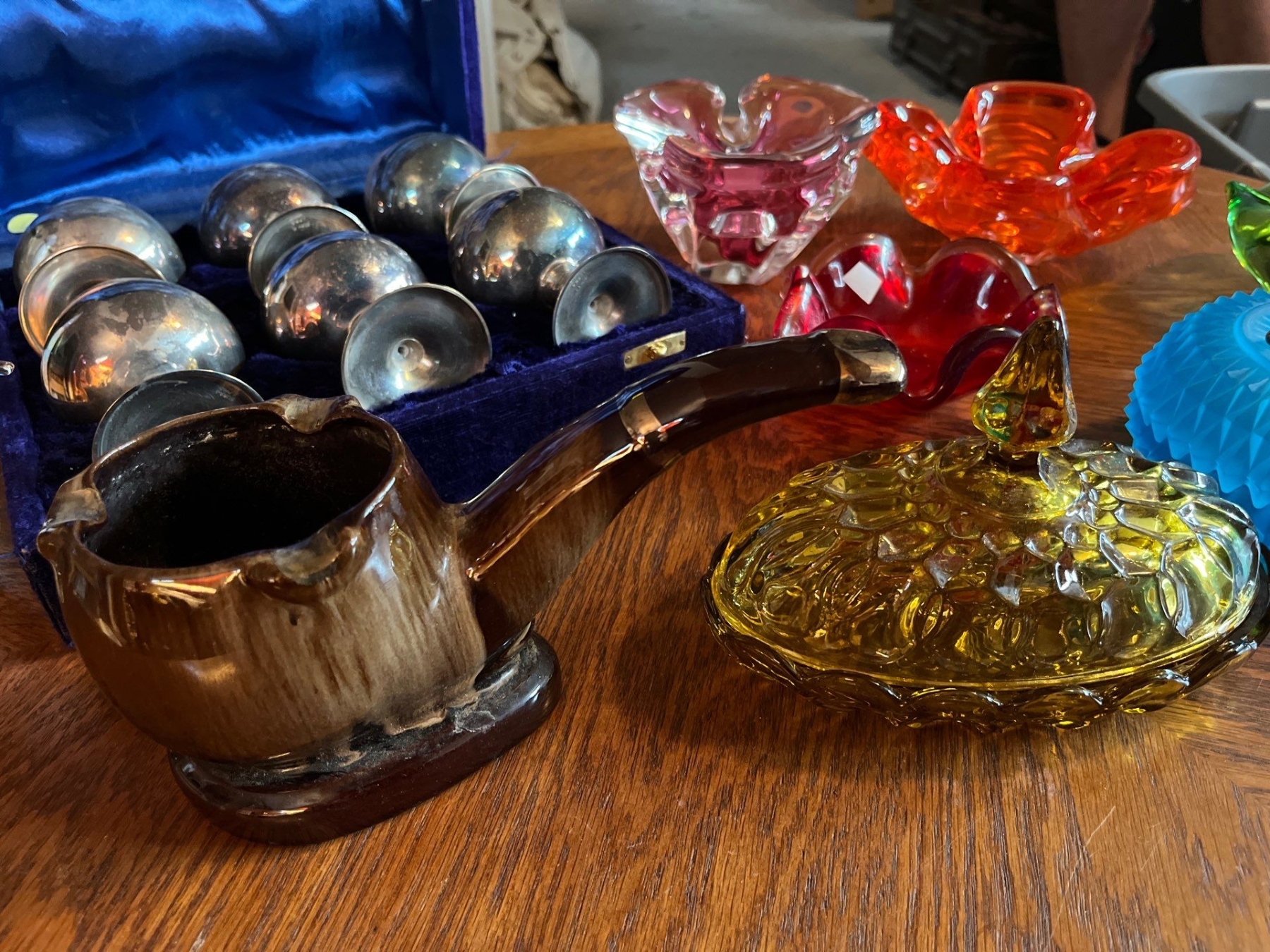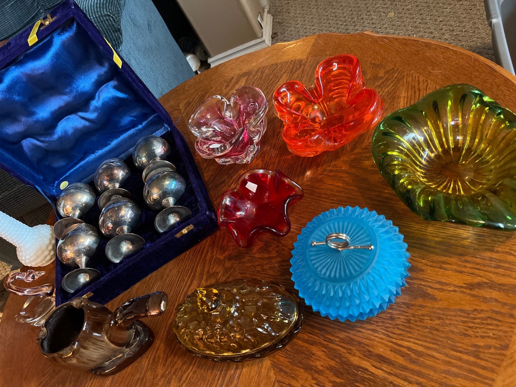 Vintage hand blown art deco glass, along with a Indiana frosted blue dish with a pipe ashtray and a set of six silver pleated glasses