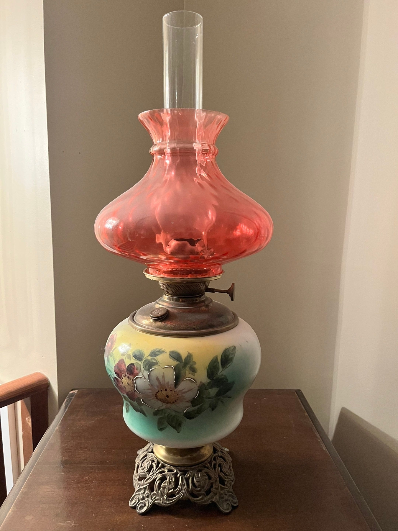 Vintage kerosene oil lamp, characterized by its hand-painted glass base featuring floral motifs, a brass burner, and a pink glass chimney.
