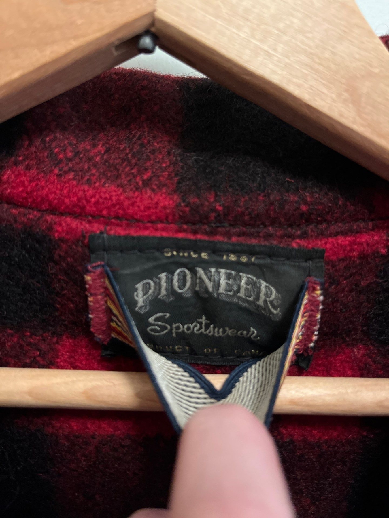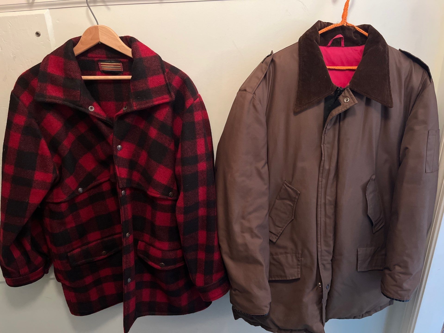 Vintage red and black plaid heavy gauge wool jacket Pioneer sportswear made in Canada with three-quarter length downfield parka 44R