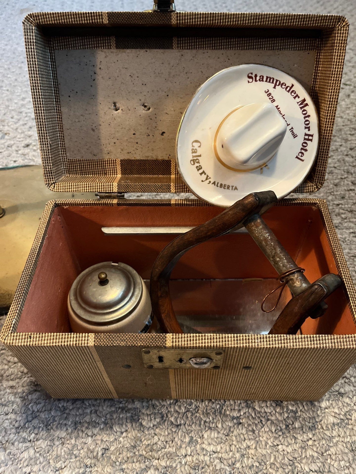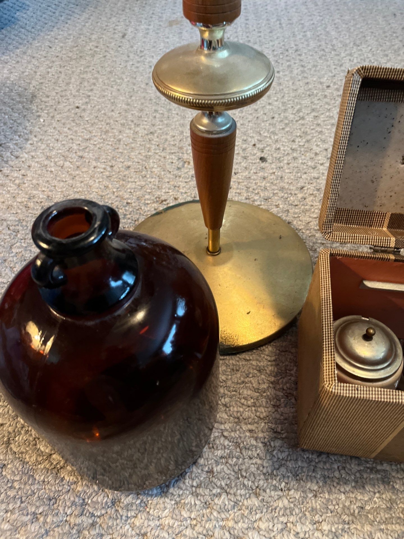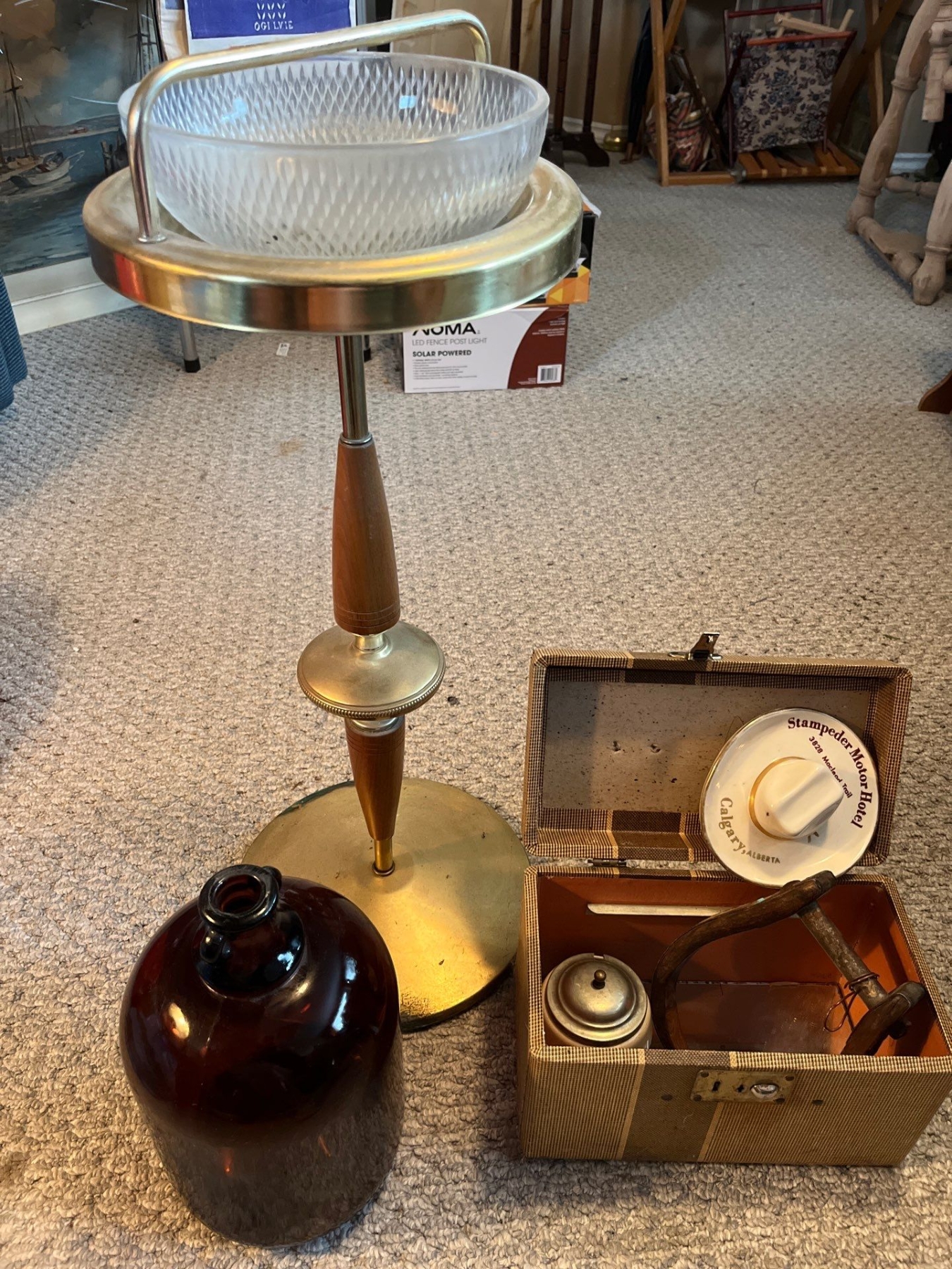Vintage retro wood and brass ashtray with a brown gallon jug and vintage cowboy art