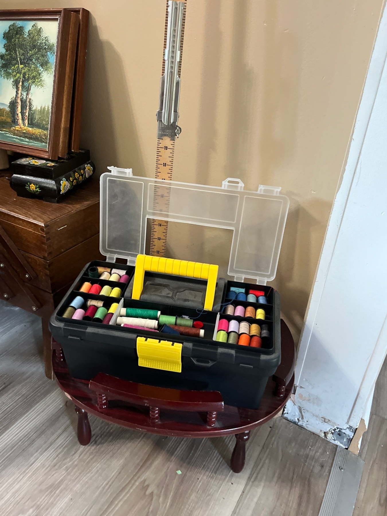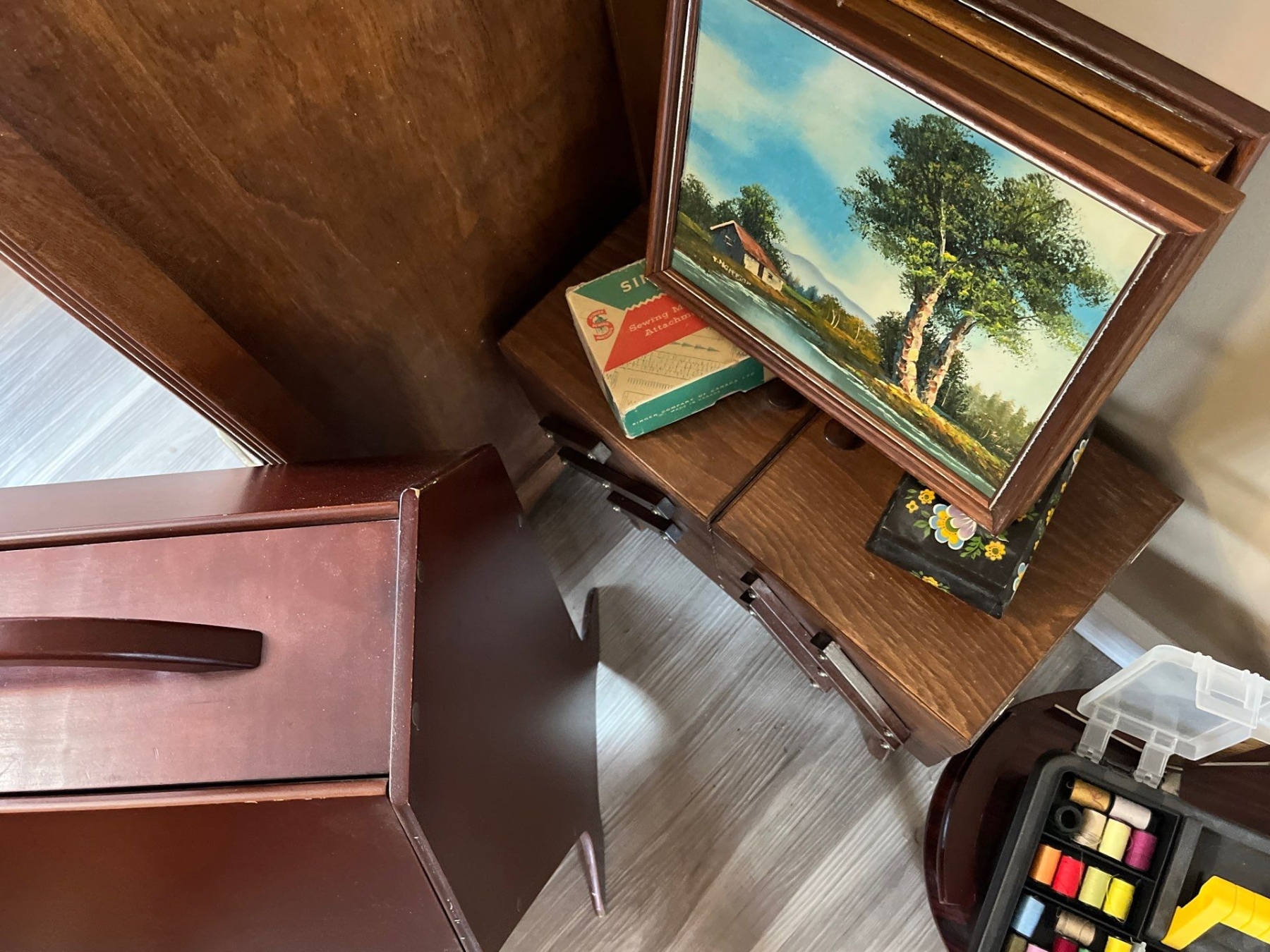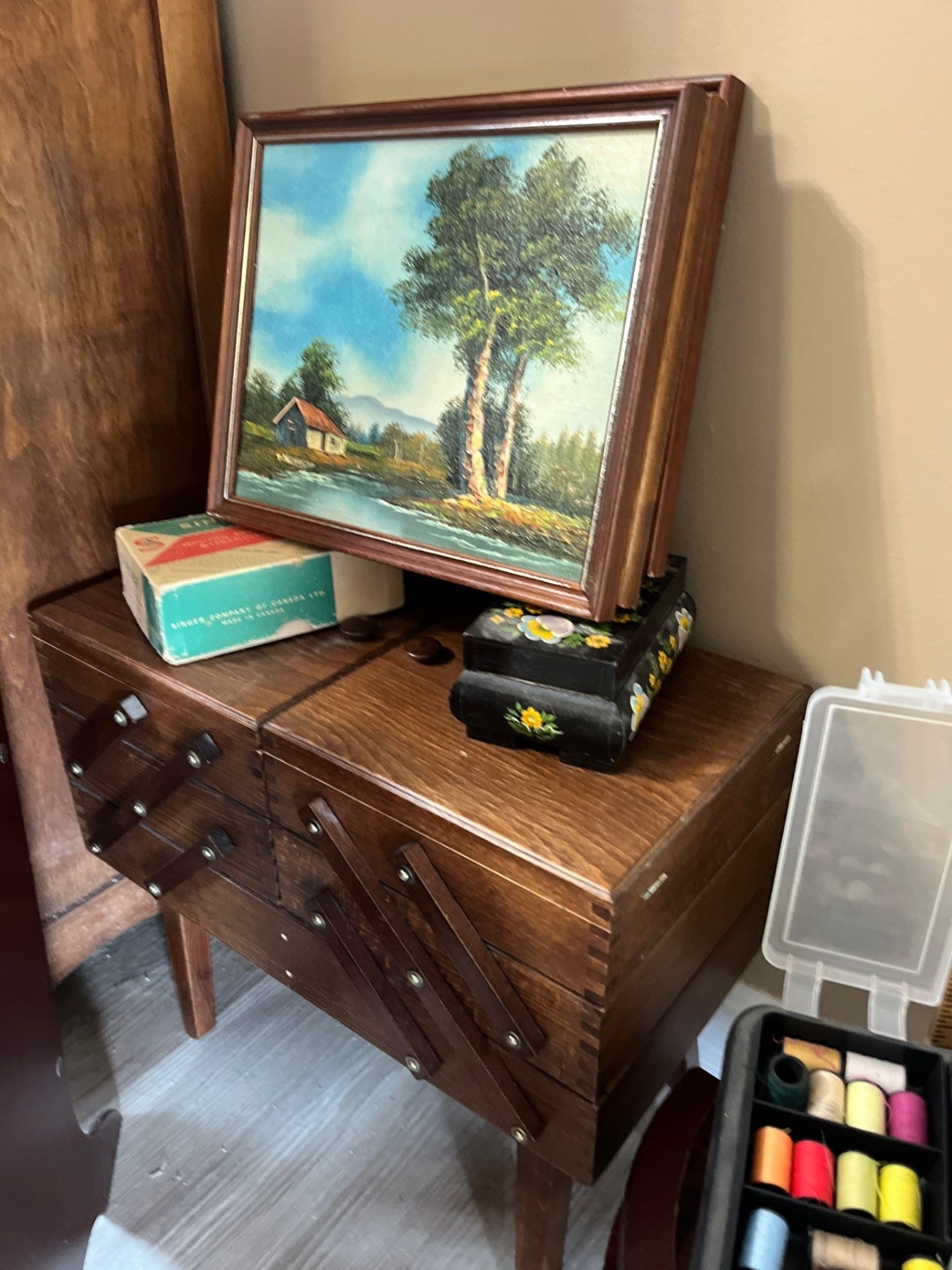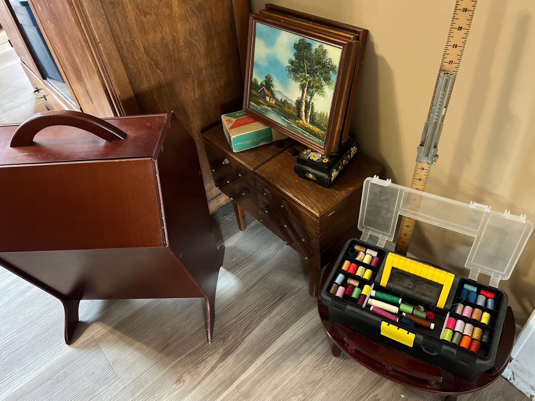 Vintage sewing storage system magazine rack 4 four paintings, a small decorative shelf and a tool kit full thread spools