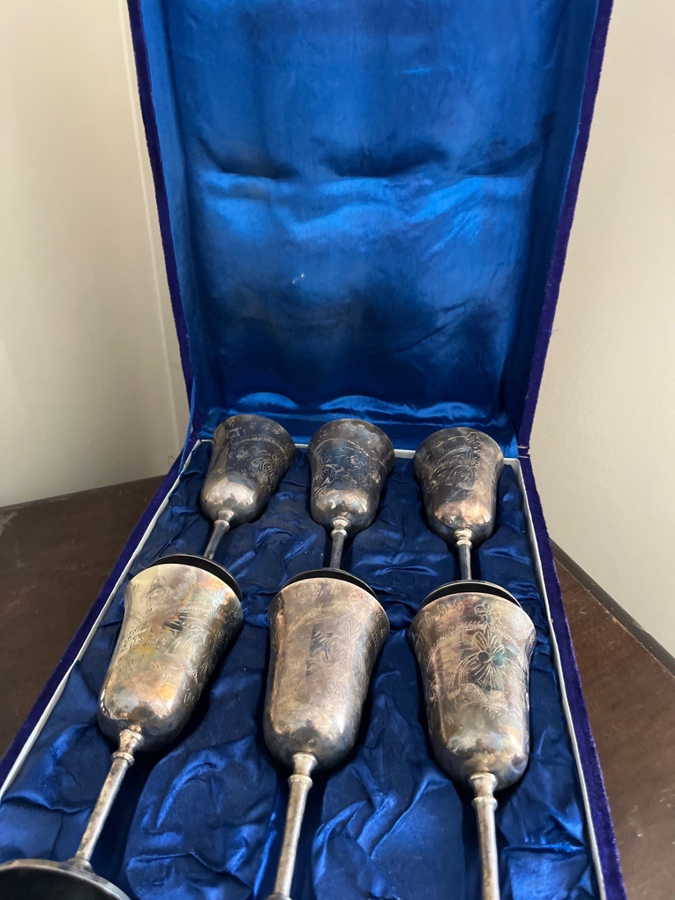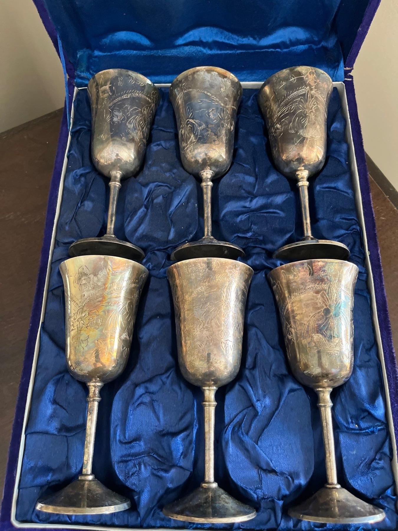 Vintage silver plated goblets 6 early 1900s in a beautiful purple velvet case
