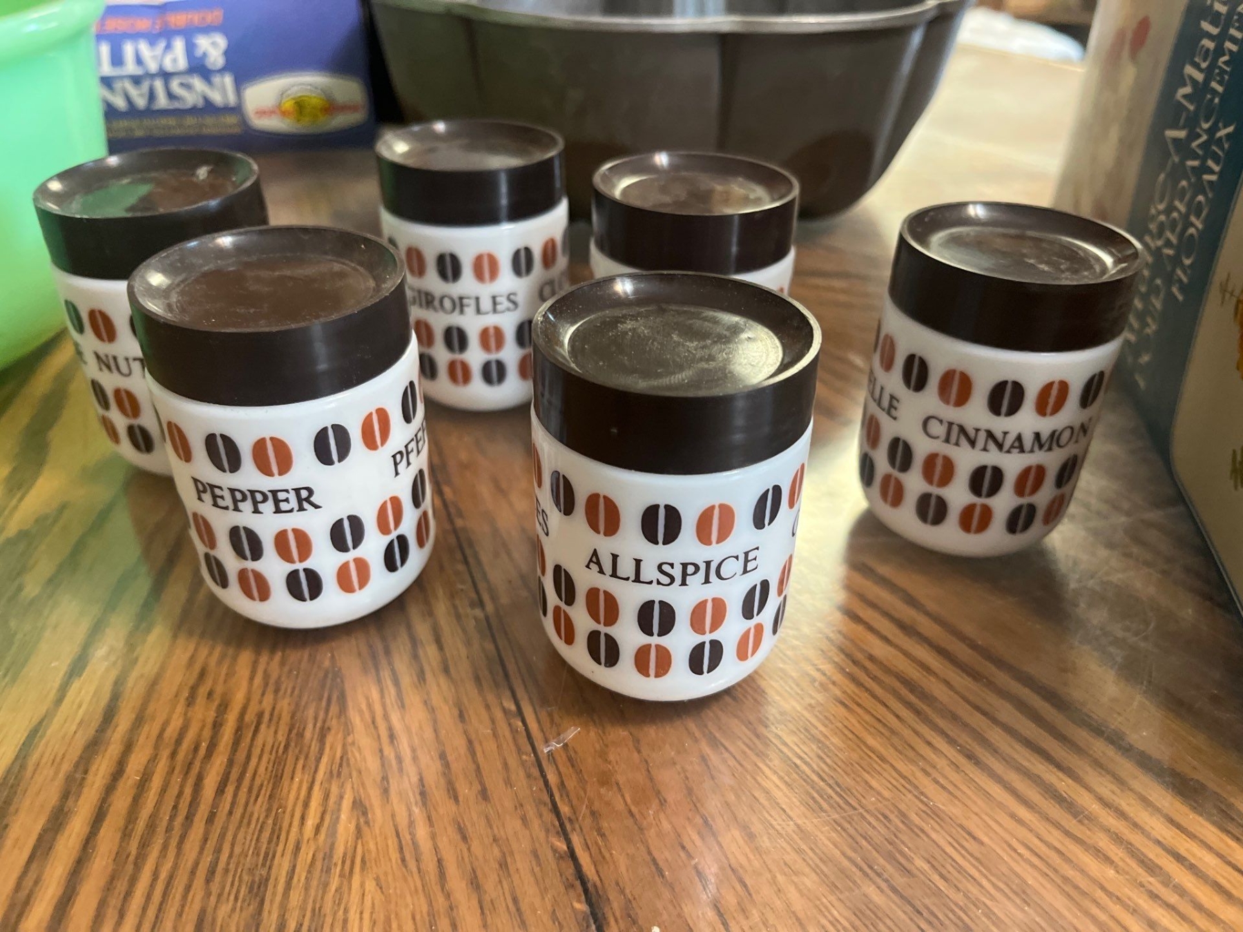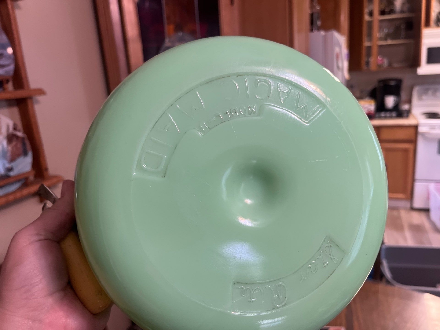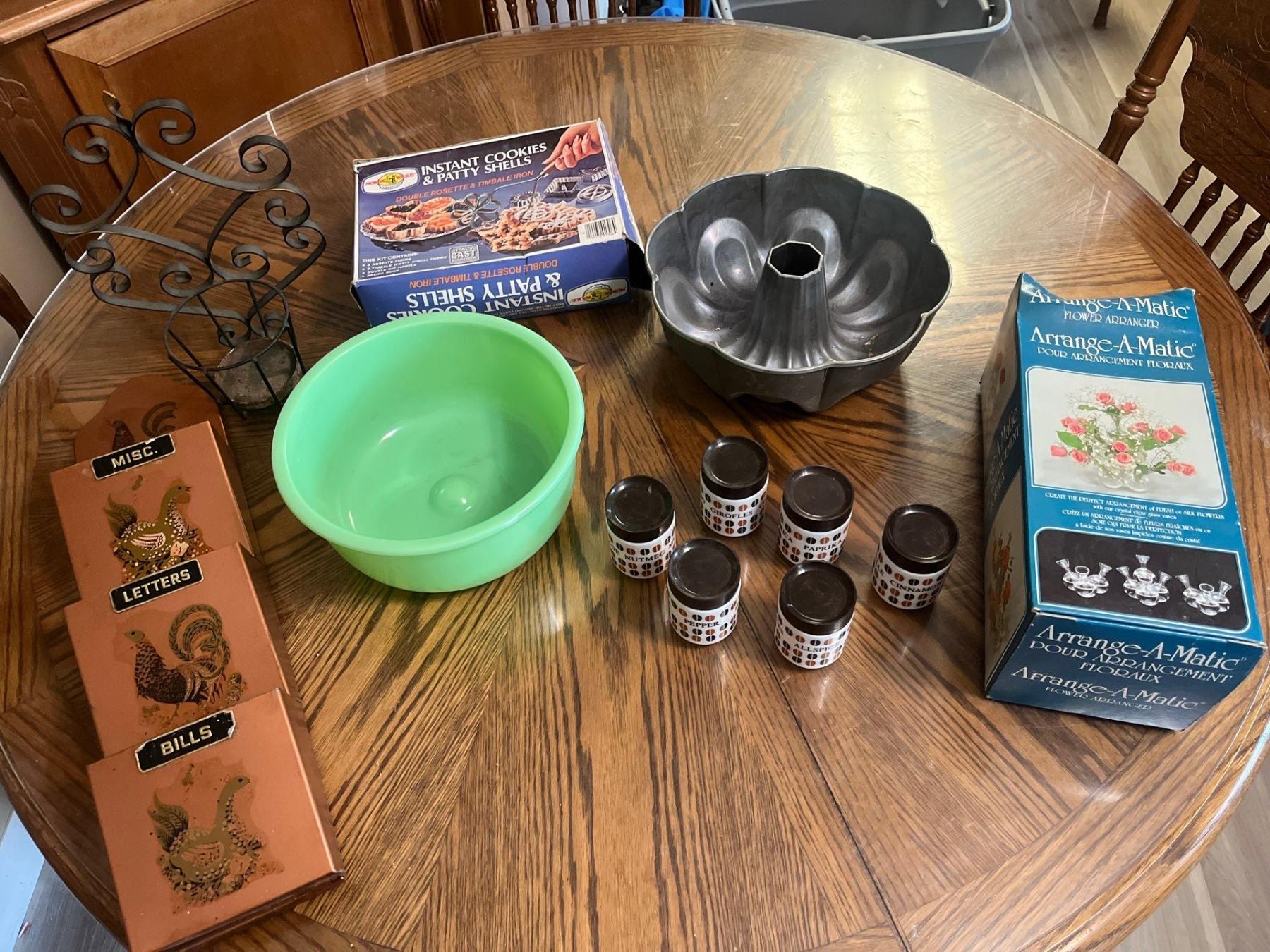 Vintage star right model two magic made mint green dish with other cooking utensils and while hanging copper letter holder and several vintage Noma glass Christmas Lights all in original packaging