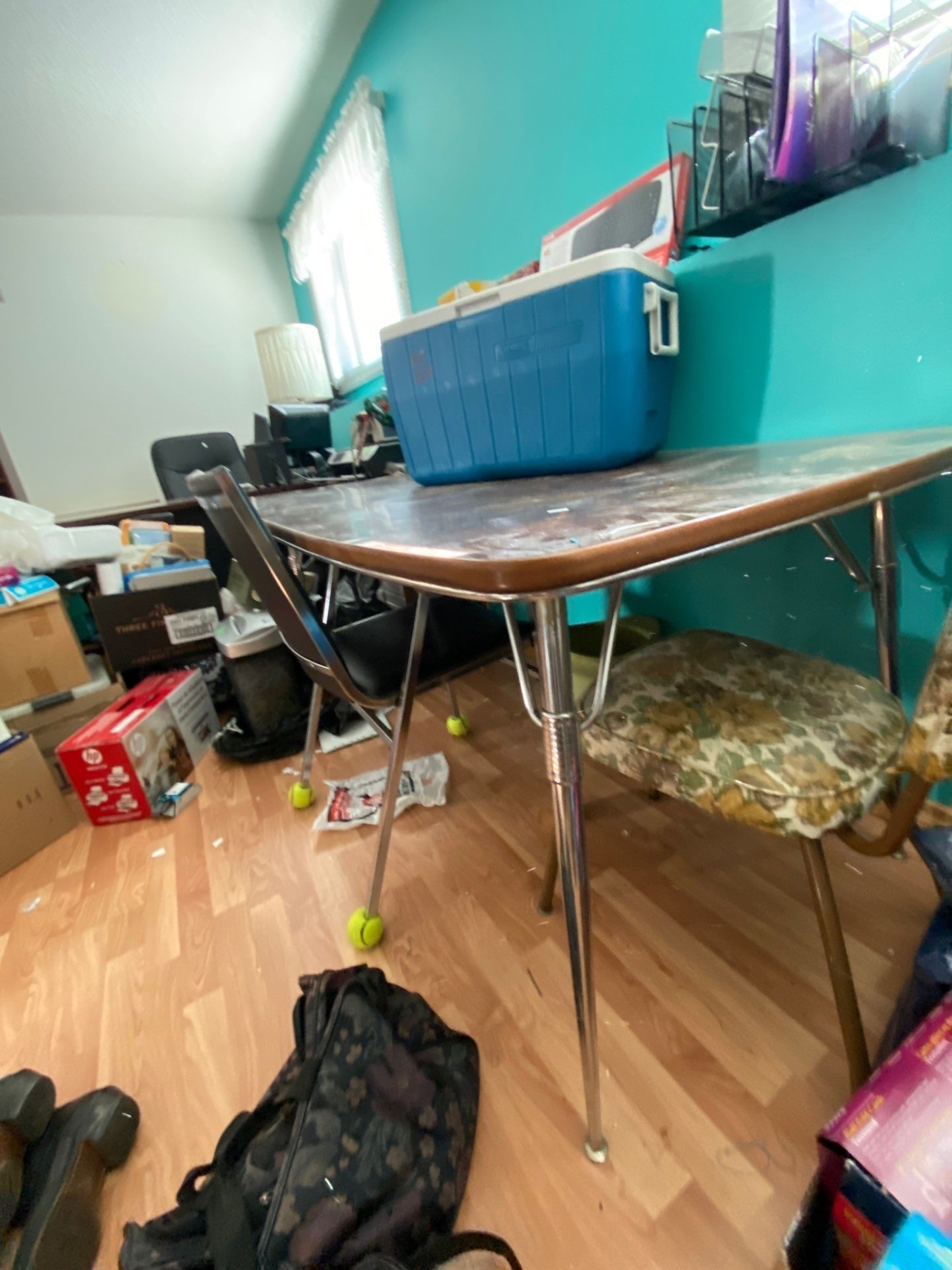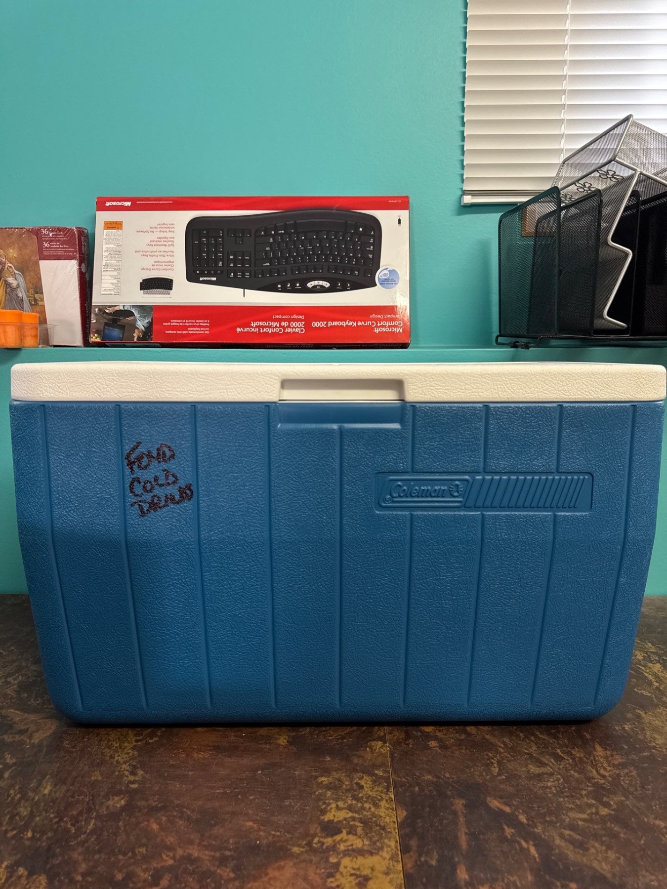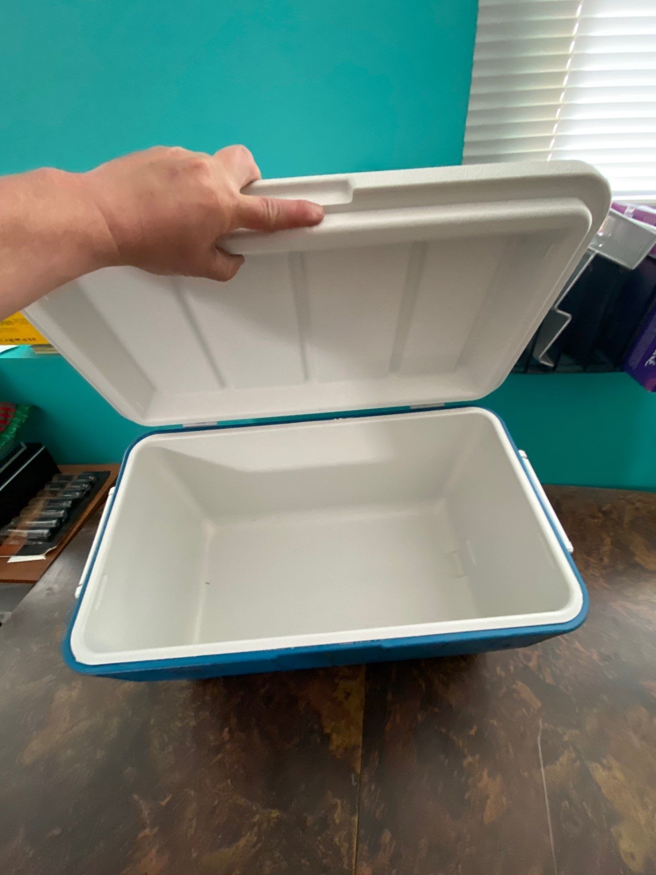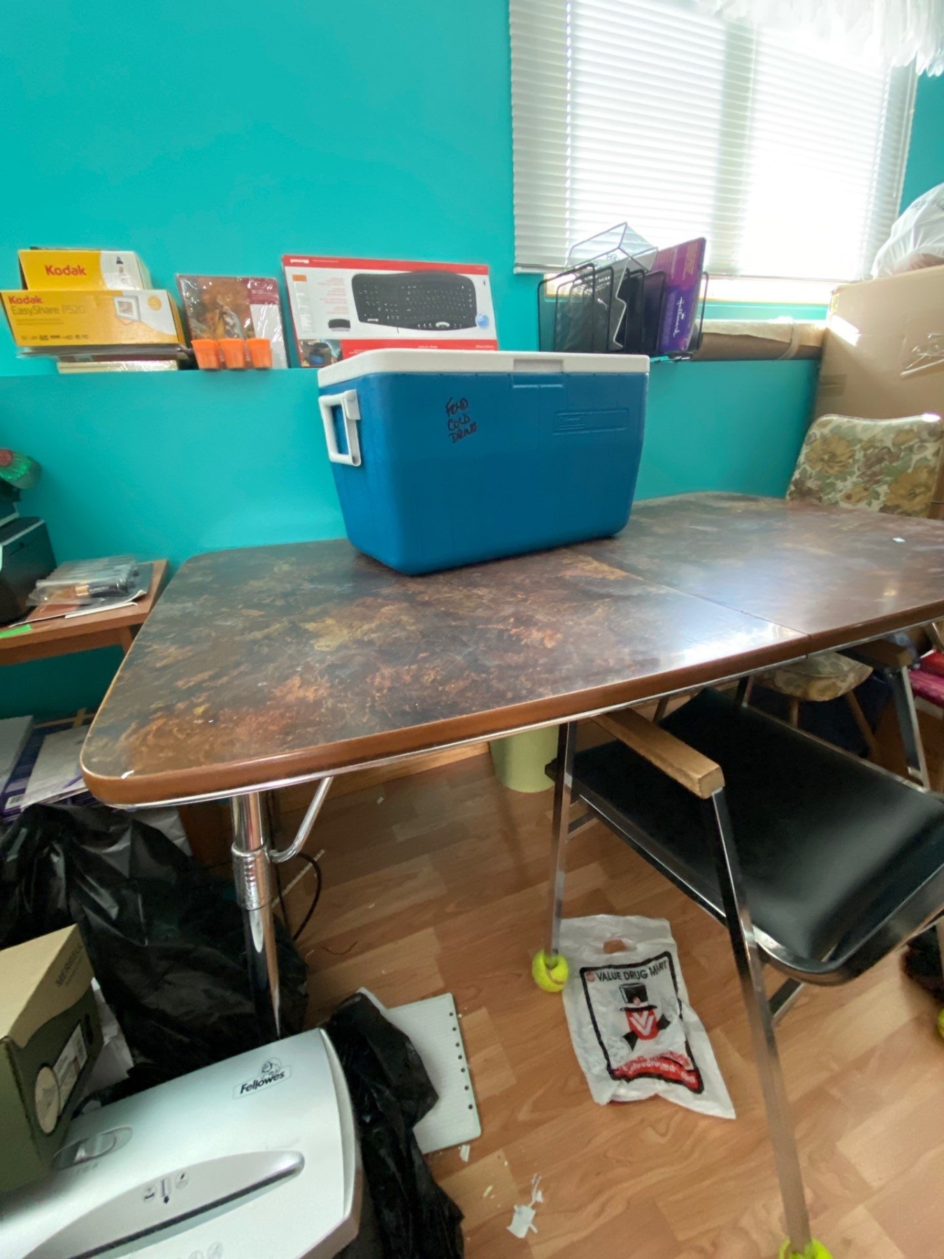 Vintage table and Coleman cooler 59 inches long by 35 1/2 inches wide by 30 inches