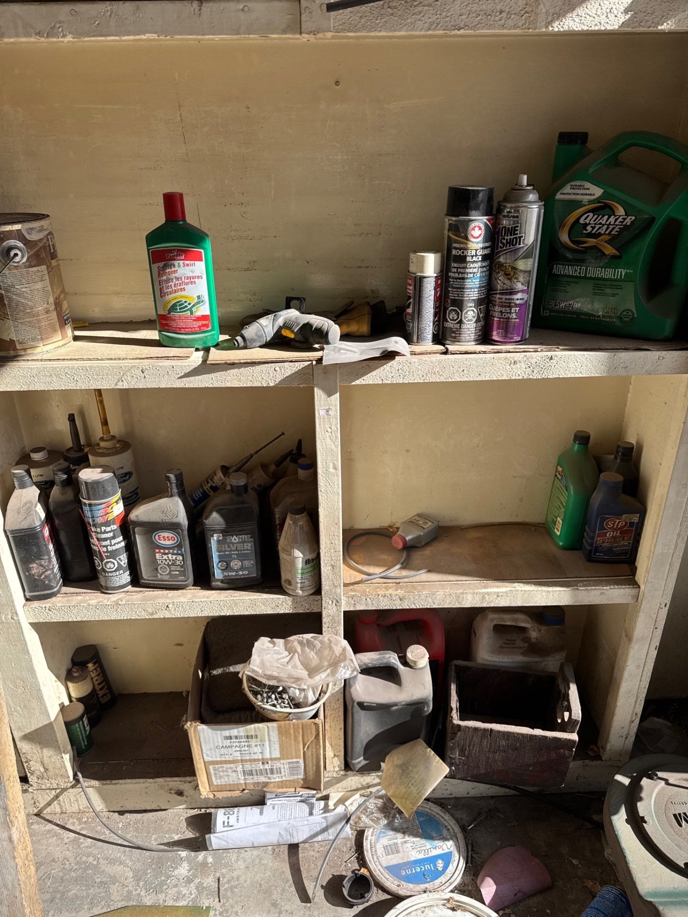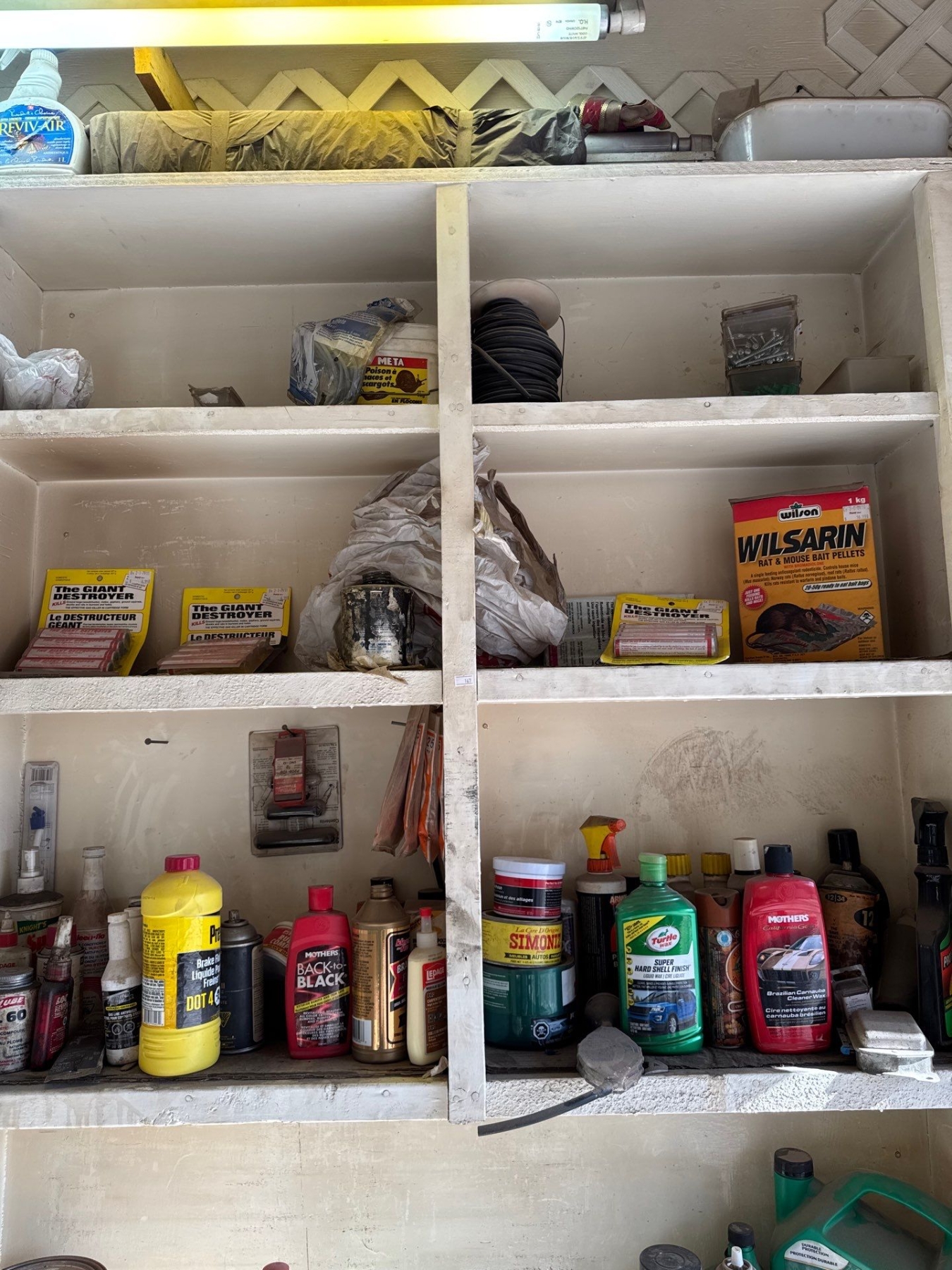 Viper screwdriver, electric, various aerosol, cans of rocker guard and various car detailing items screws, nails pest control items. All items in shelf included.