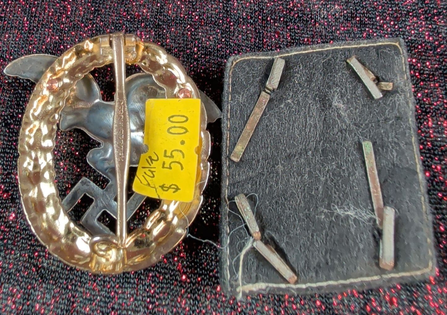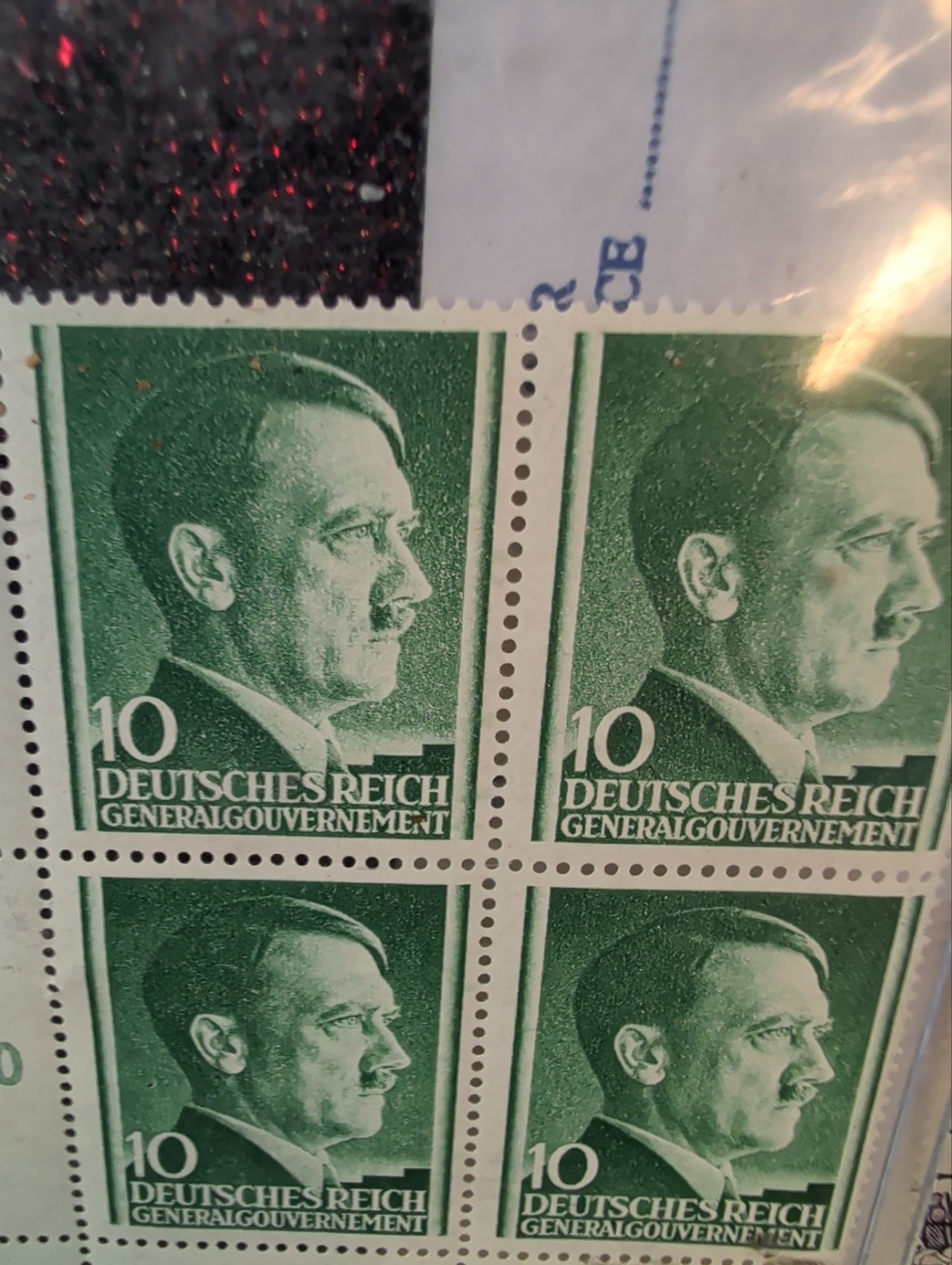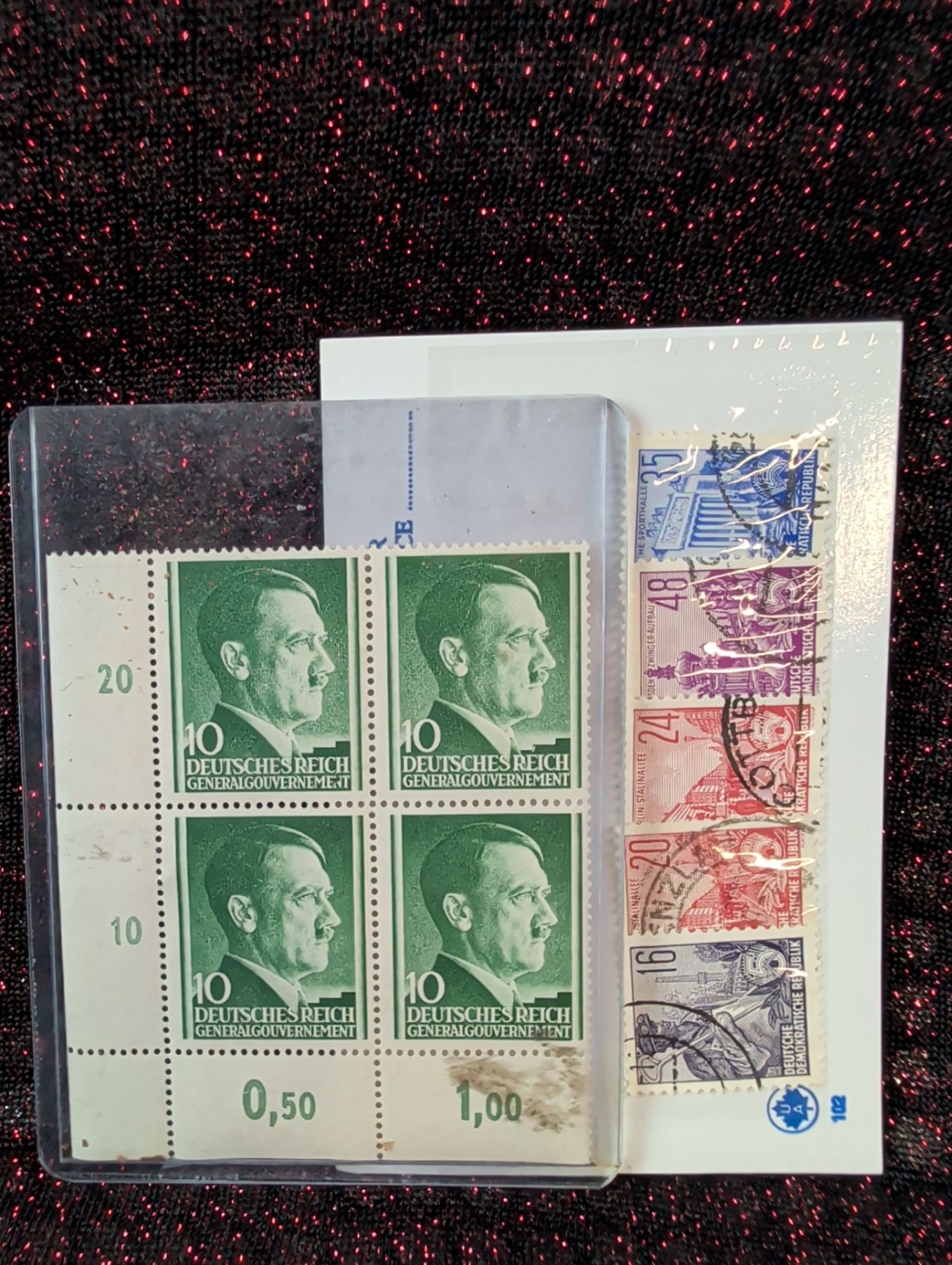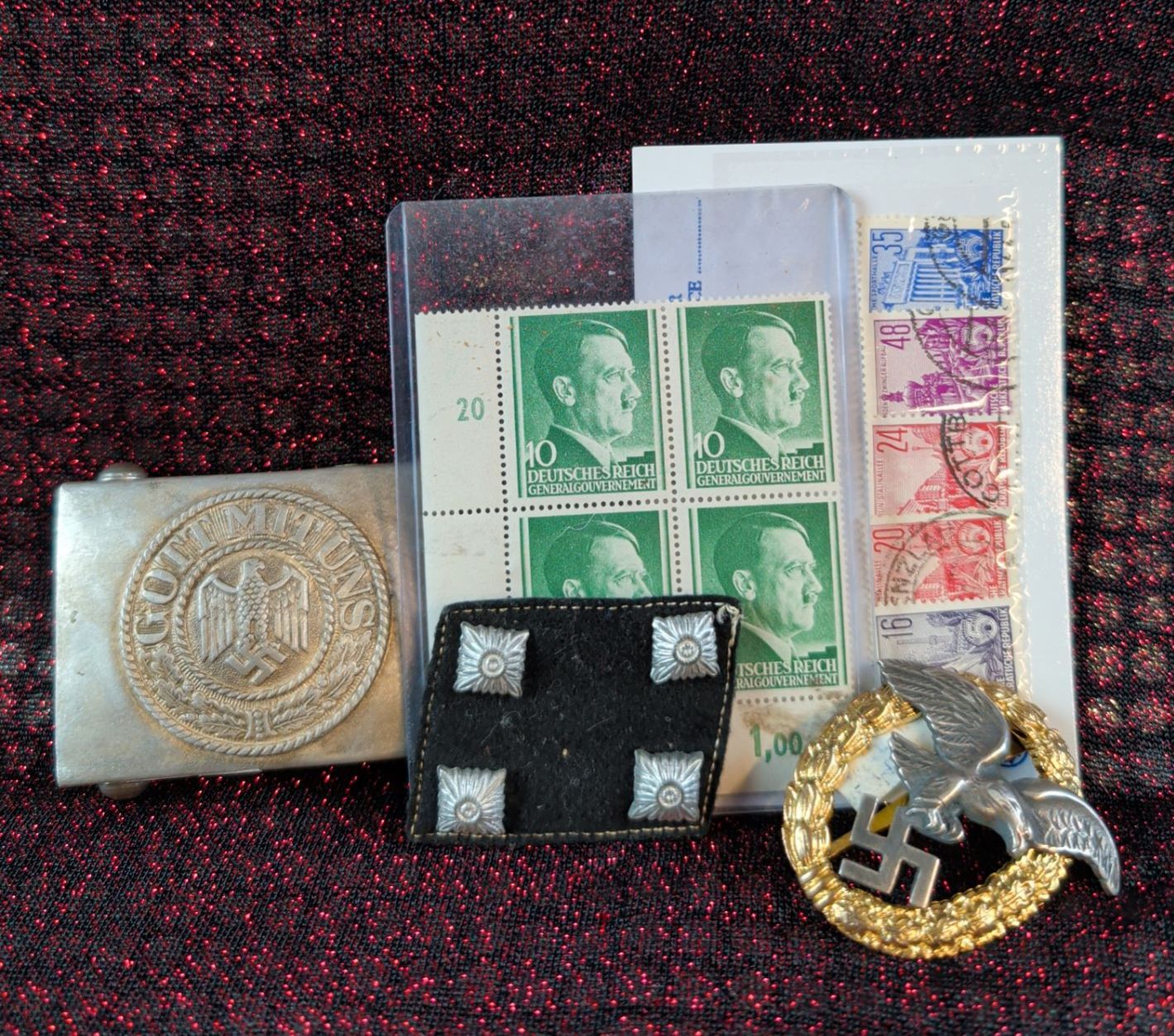 WWII German Stamps, Belt Buckle, Swastika with Nazi Eagle Pin, and More