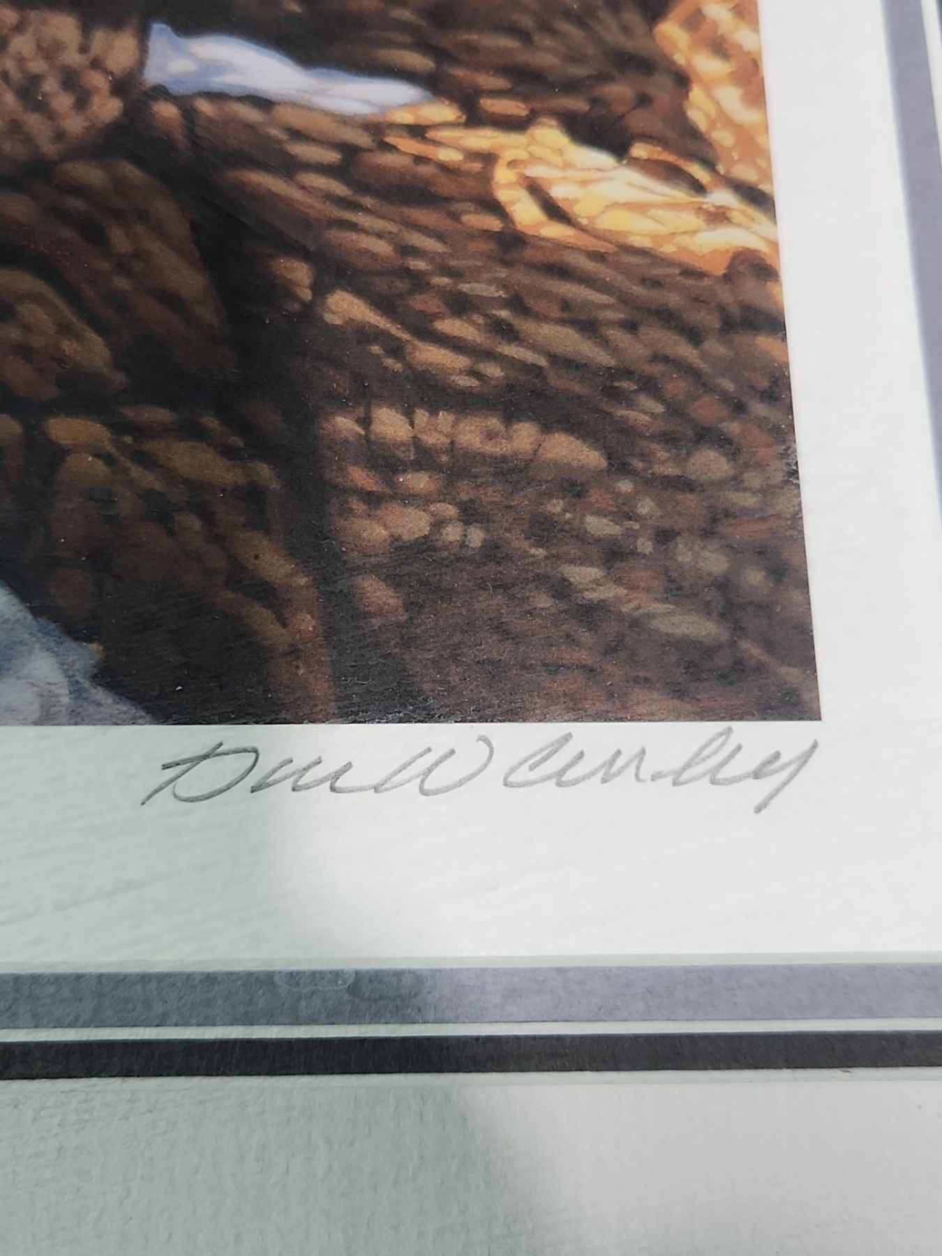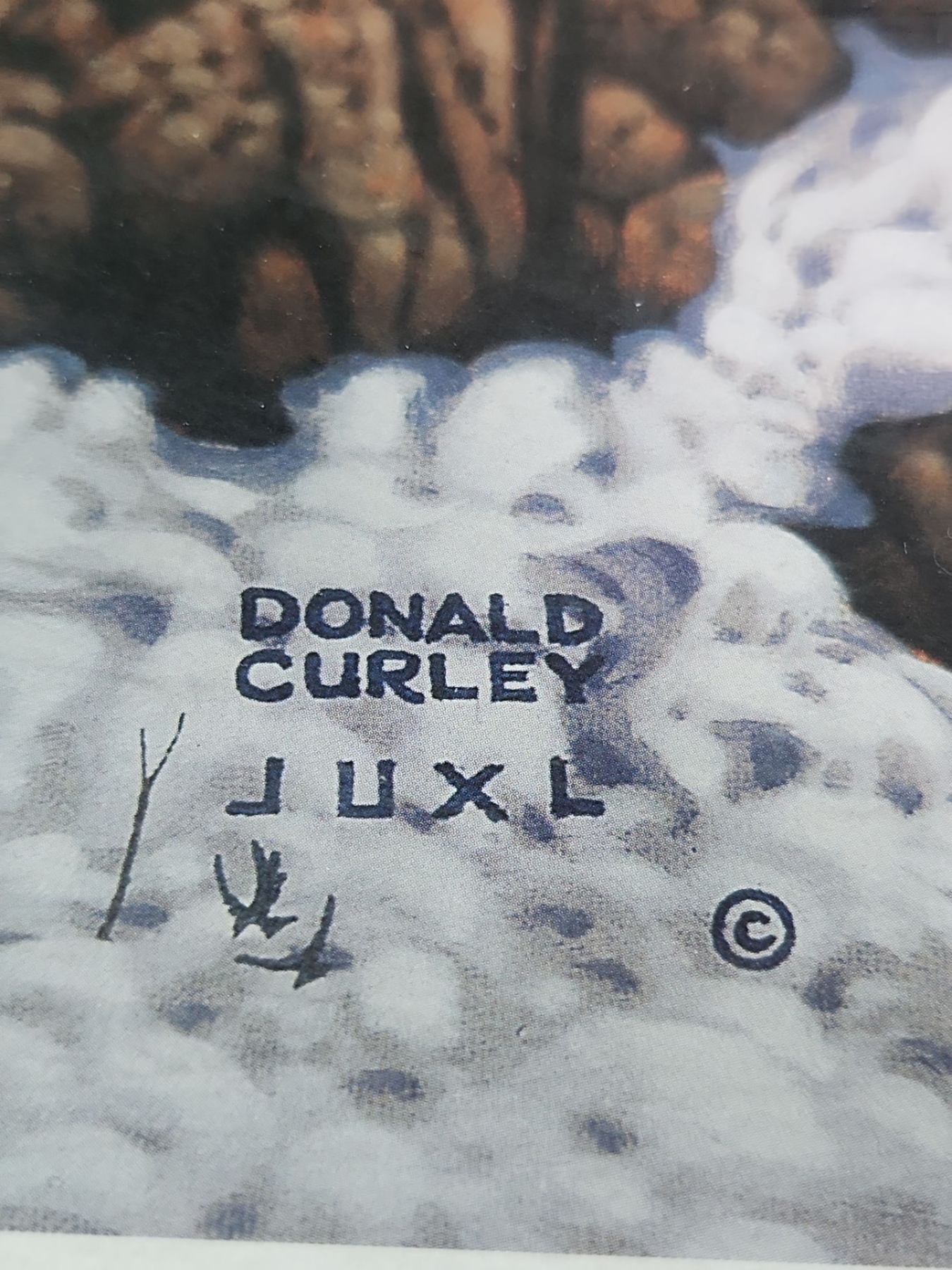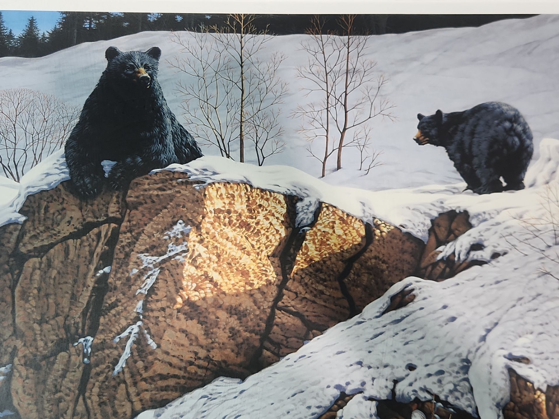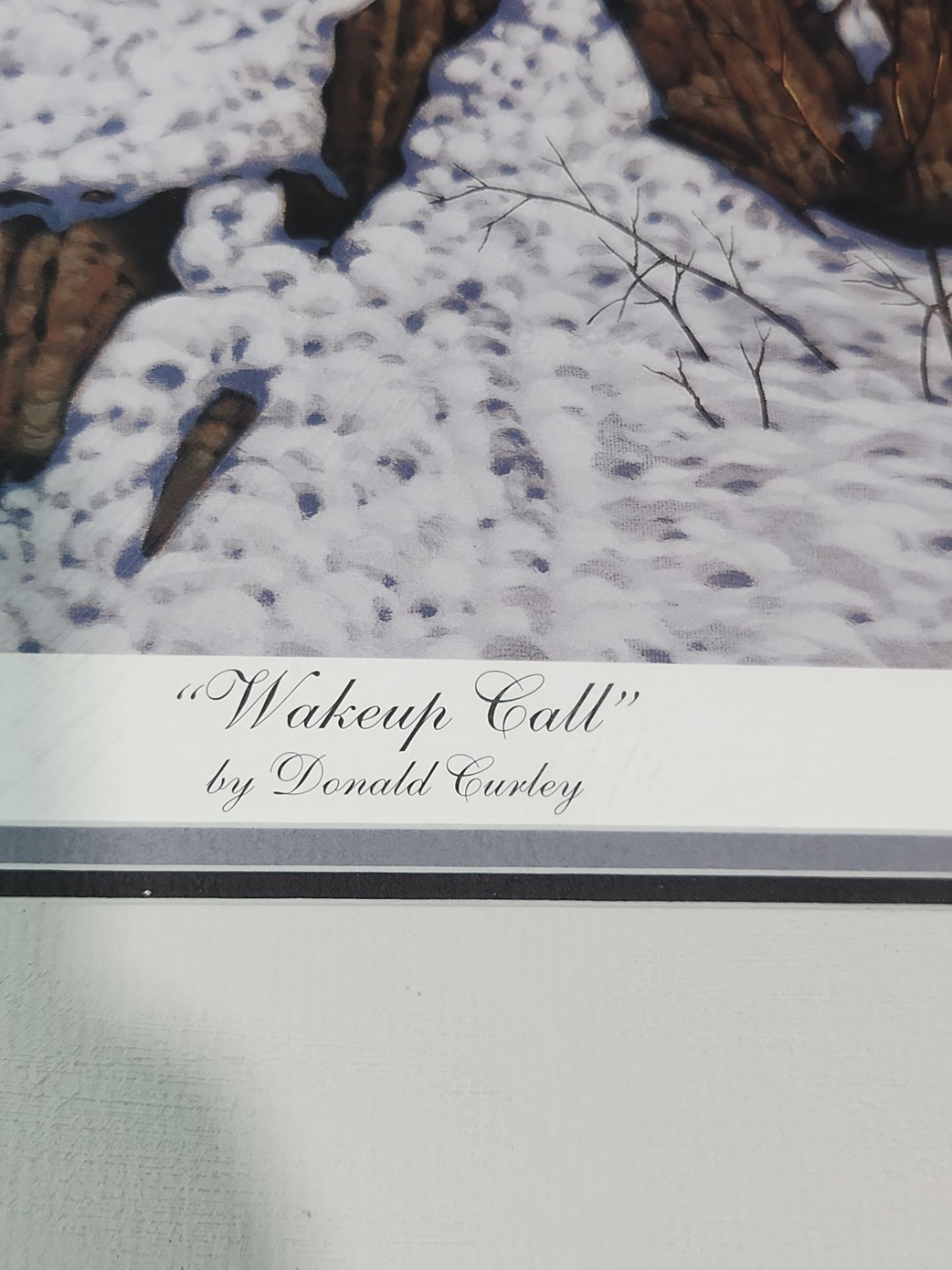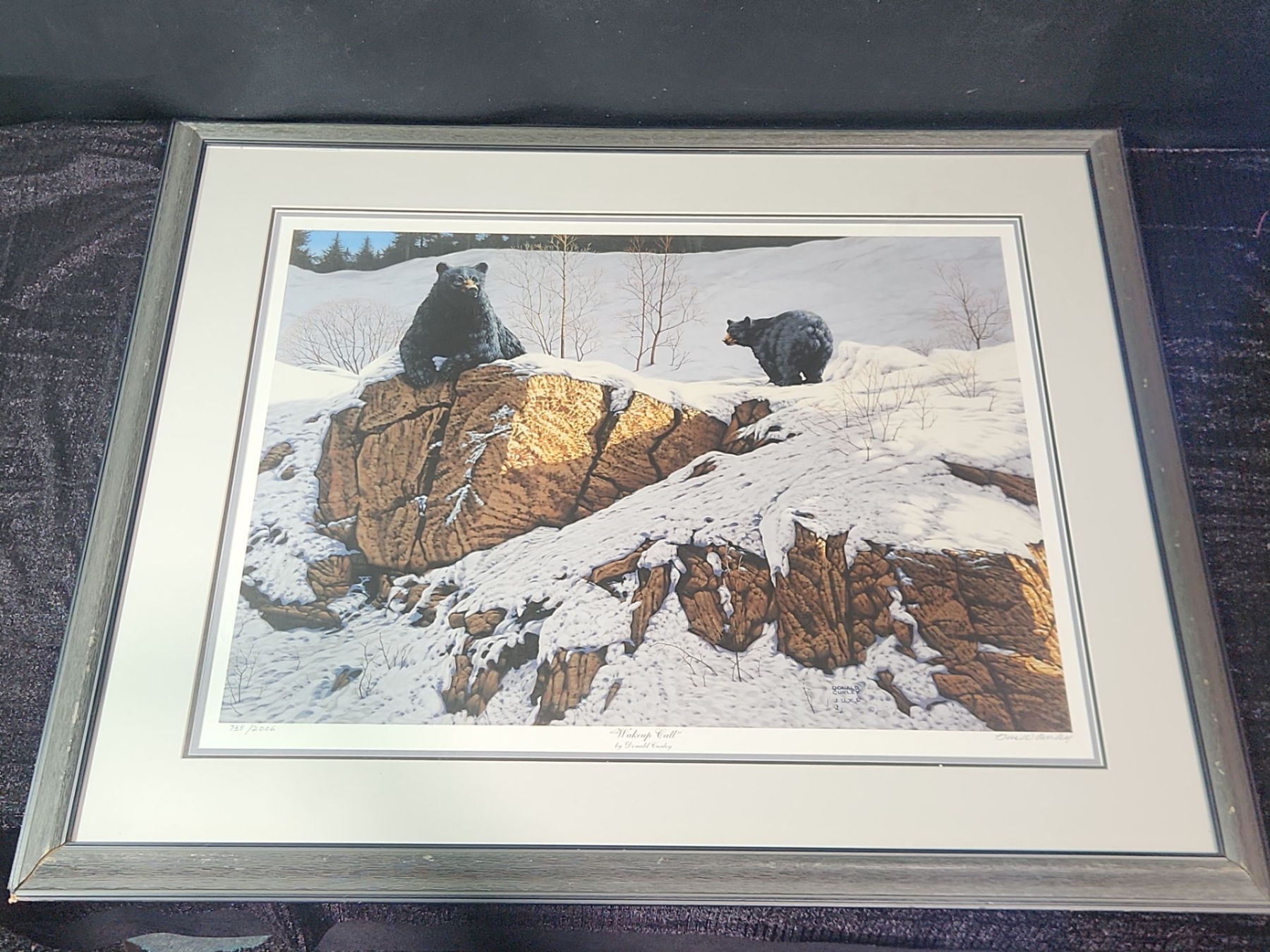 This is framed , signed print of the artwork " Wake Up Call " by artist Donald Curley. This is a limited edition print from 2006 and depicts bears in a snowy landscape