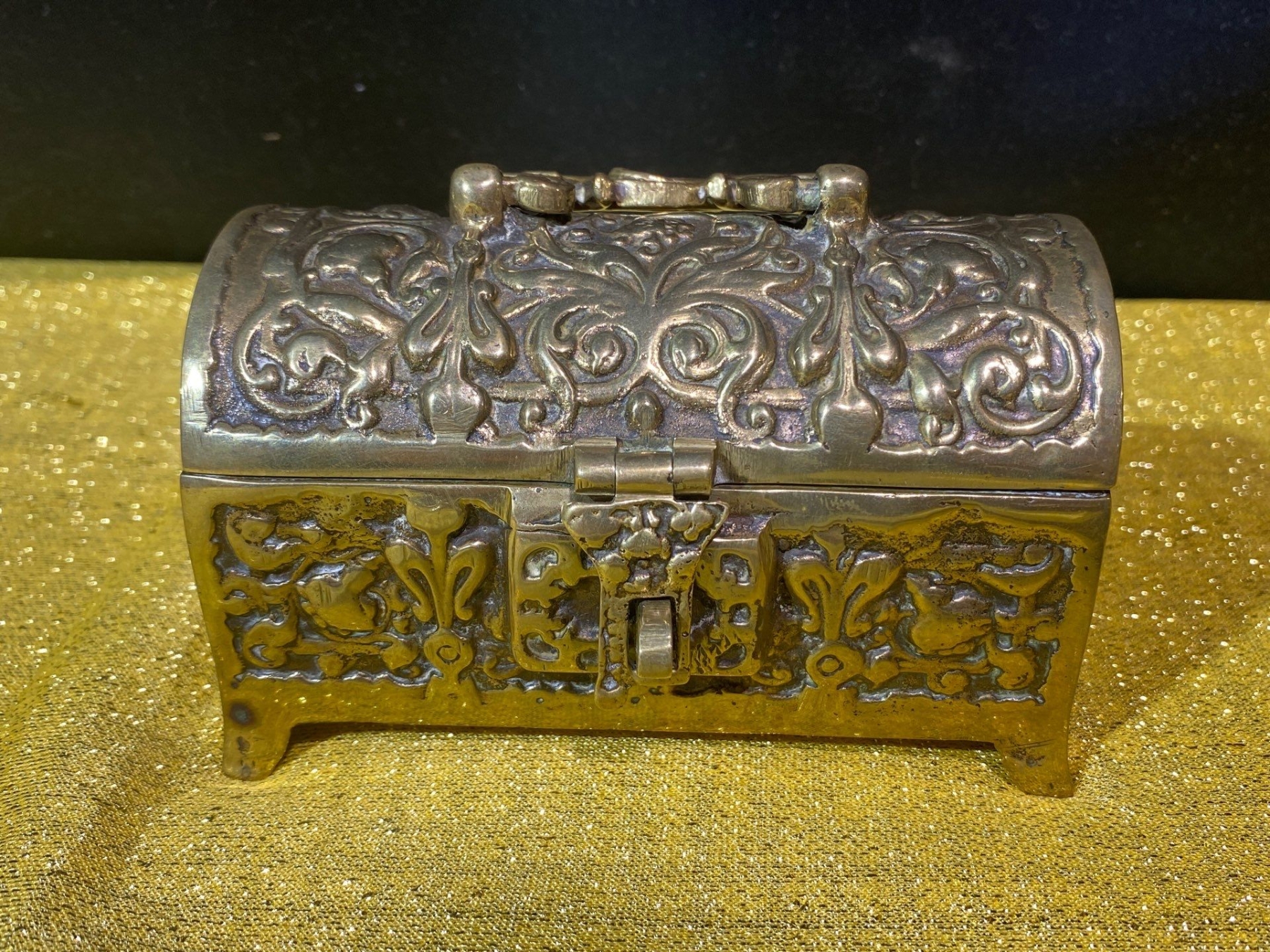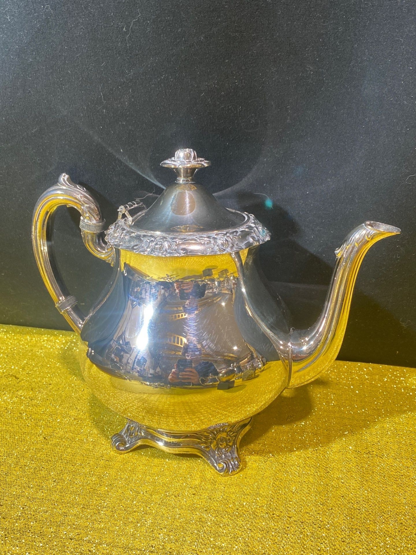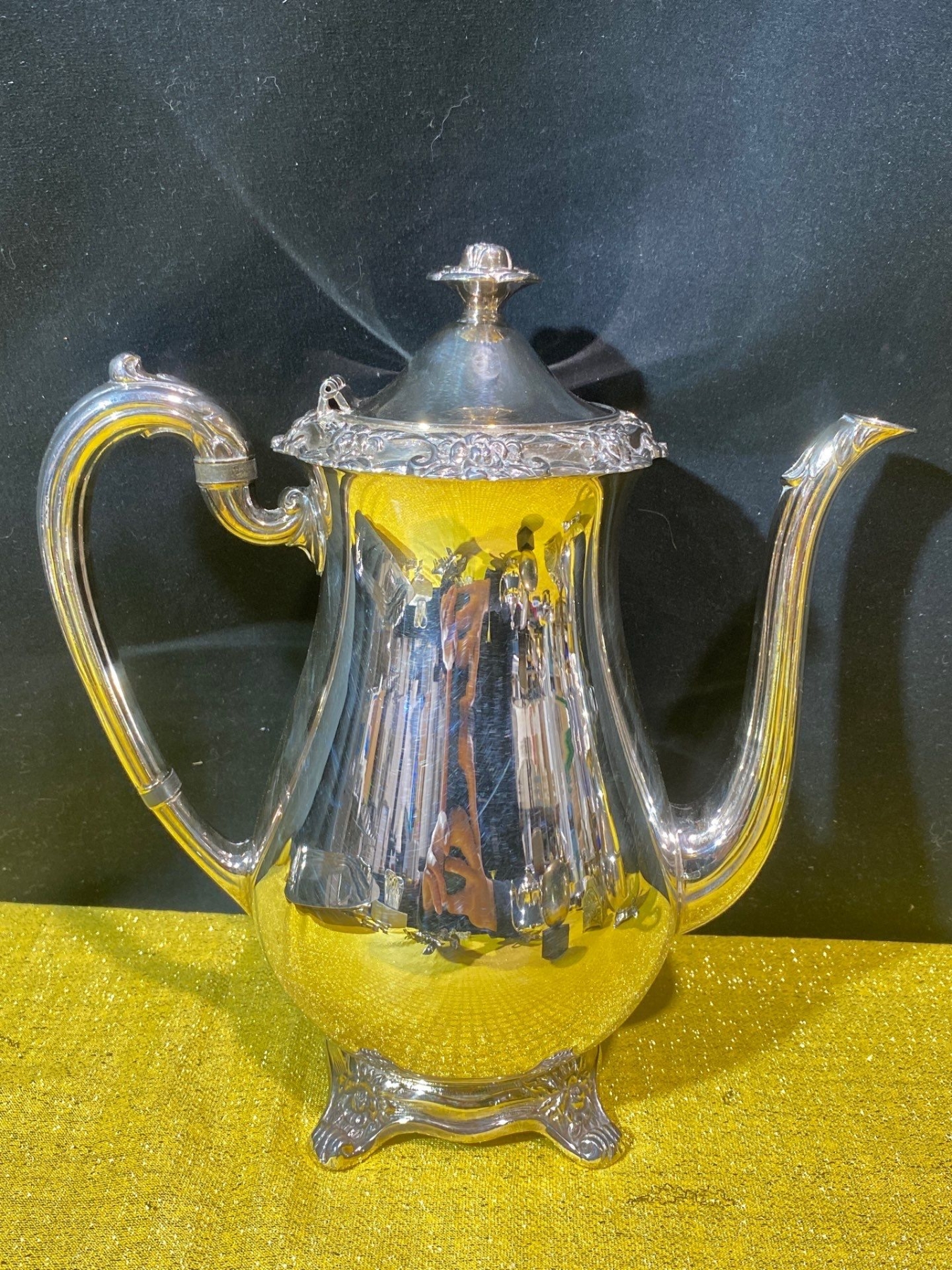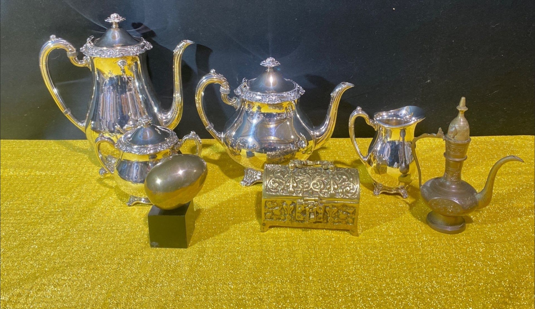 This Wallace Baroque silver-plated coffee set exudes elegance with its classic Baroque styling, featuring ornate detailing and lustrous silver plating. Accompanied by assorted brass decorative pieces, the set combines functional sophistication with timeless decorative appeal.