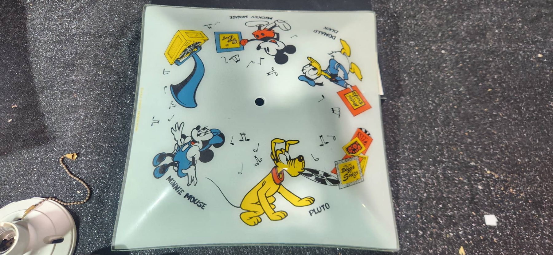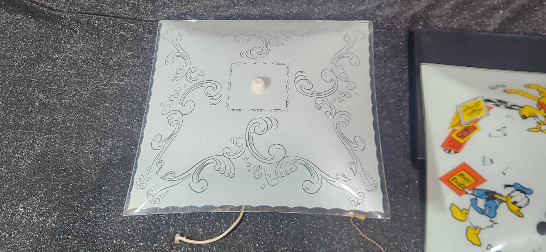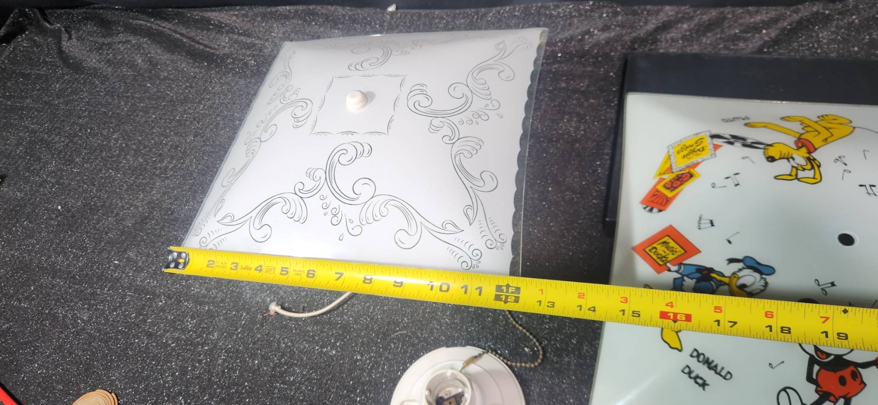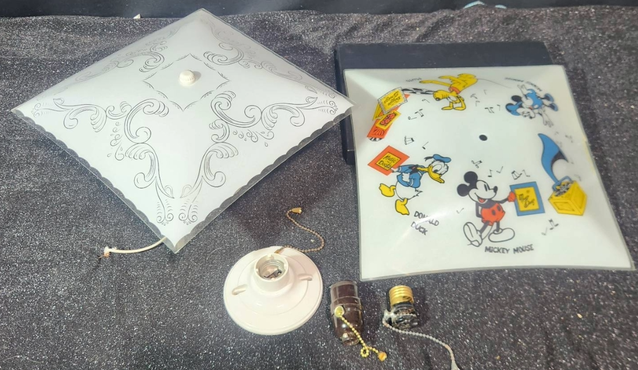 Two square glass ceiling light shades, including one with elegant scrollwork design and one adorned with Mickey Mouse, Donald Duck, Goofy, Pluto, and other classic Disney characters, marked with Walt Disney Productions copyright. Includes additional electrical components such as sockets, pull chains, and mounting hardware. Perfect for Disney enthusiasts or anyone looking to add a touch of charm to their space.
