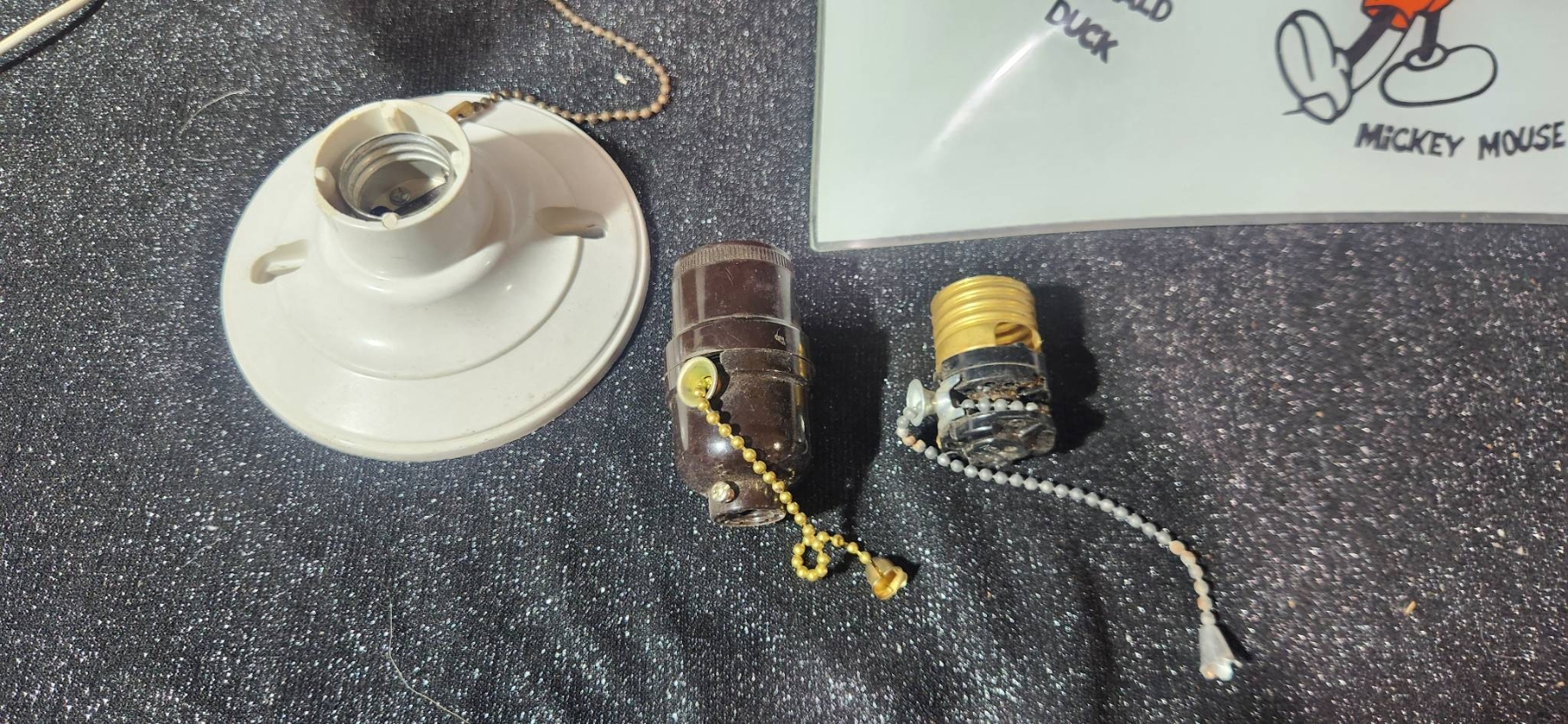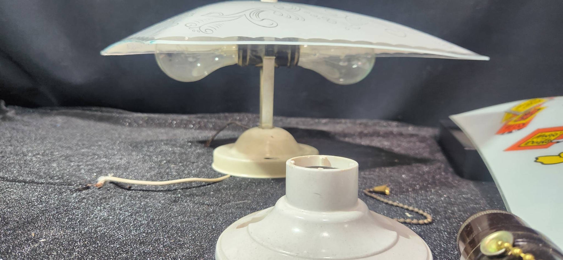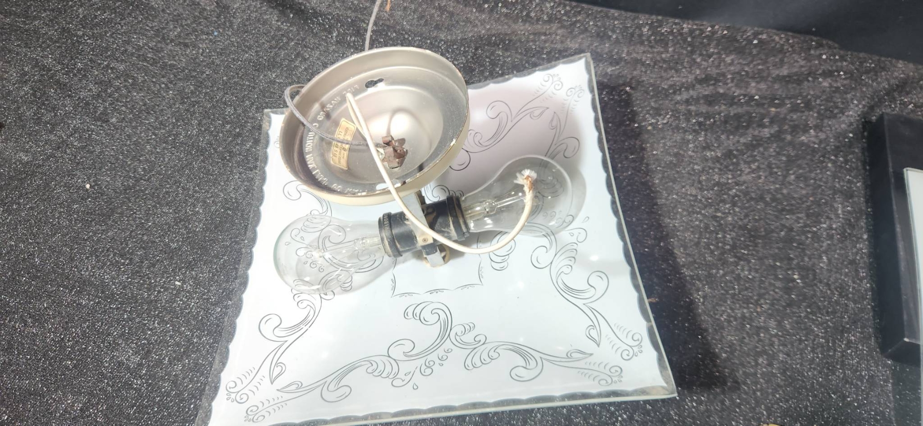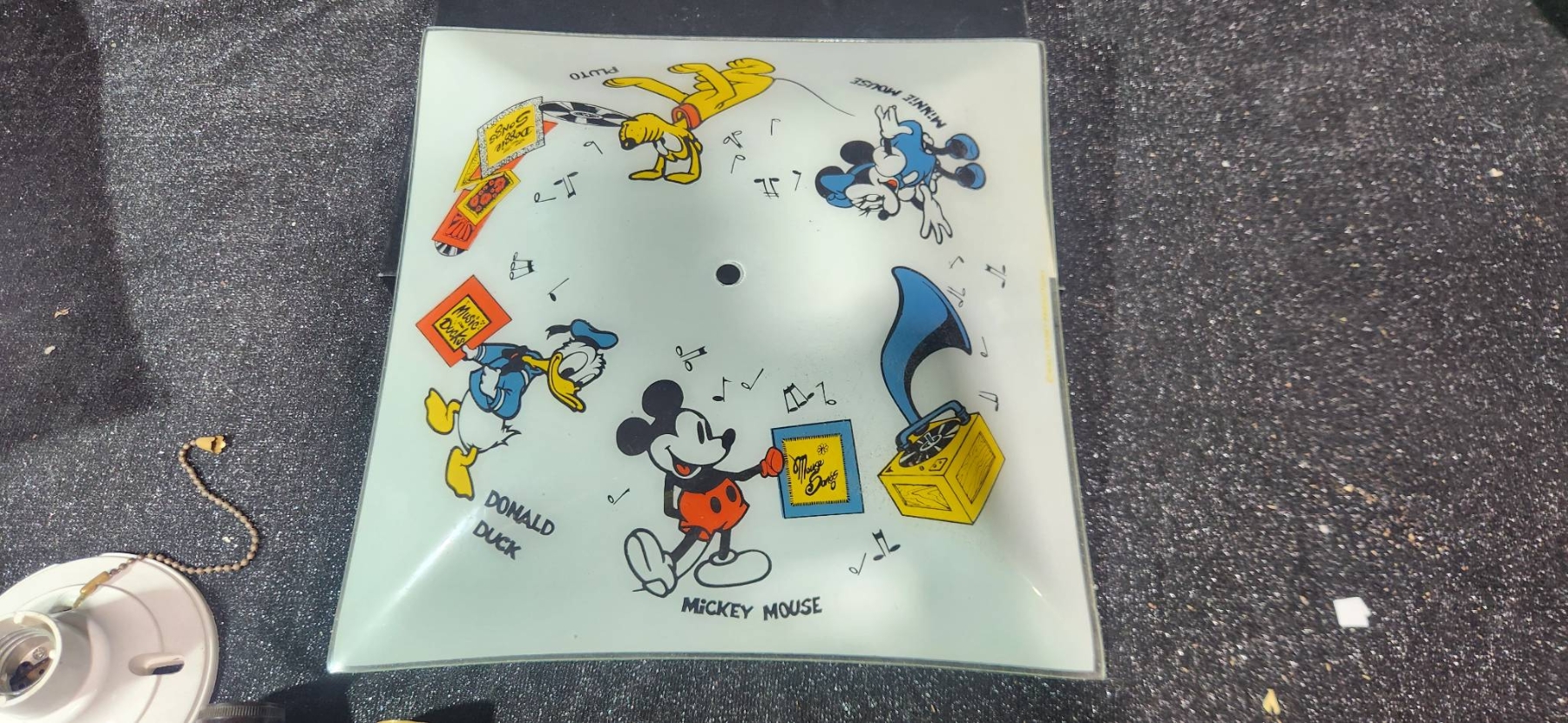 Two square glass ceiling light shades, including one with elegant scrollwork design and one adorned with Mickey Mouse, Donald Duck, Goofy, Pluto, and other classic Disney characters, marked with Walt Disney Productions copyright. Includes additional electrical components such as sockets, pull chains, and mounting hardware. Perfect for Disney enthusiasts or anyone looking to add a touch of charm to their space.