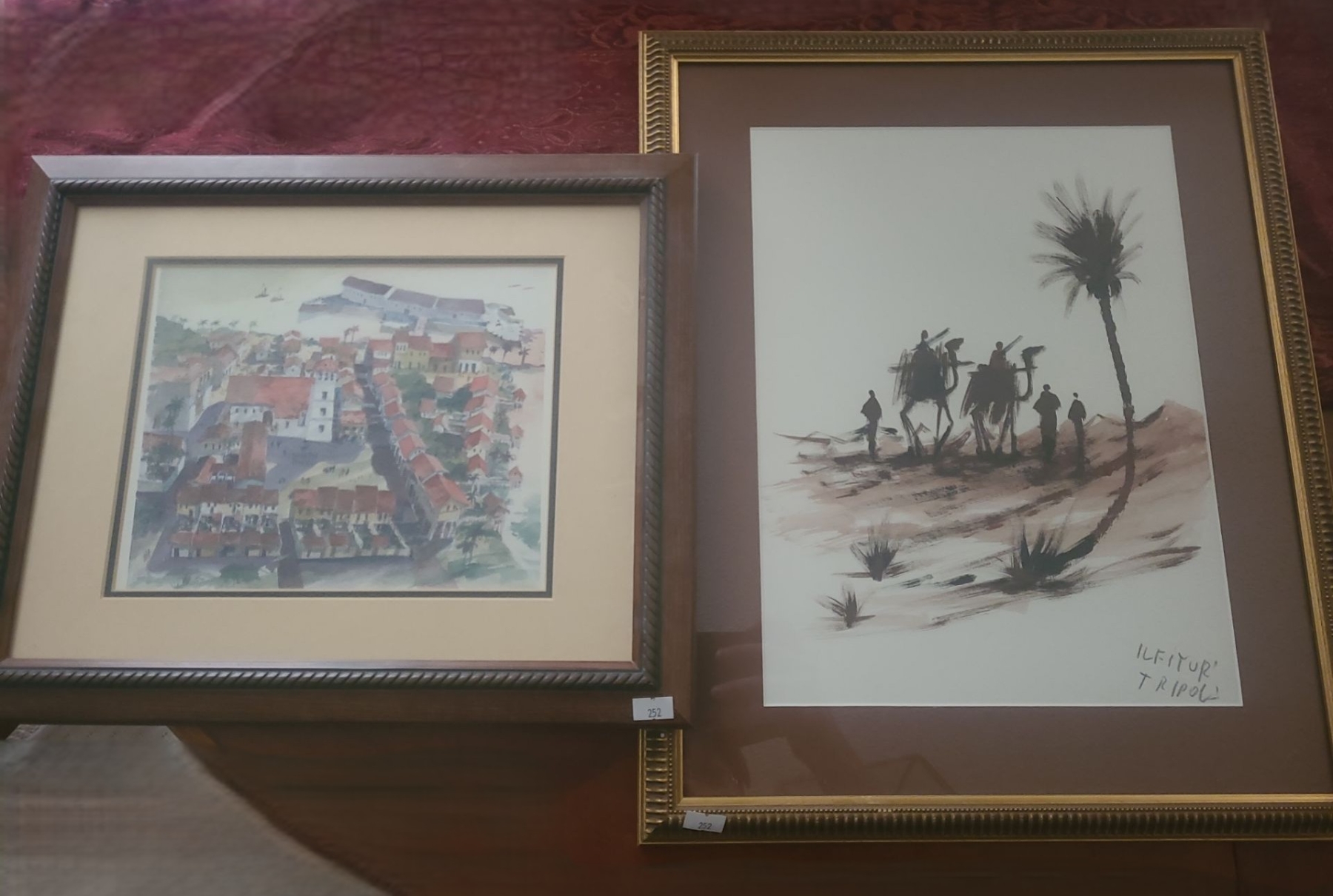 Waterside Town 17 X 13 and Desert Scene 16 X 20 (Artist Illegible)