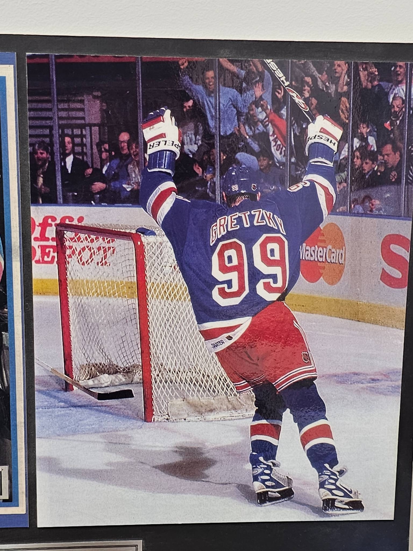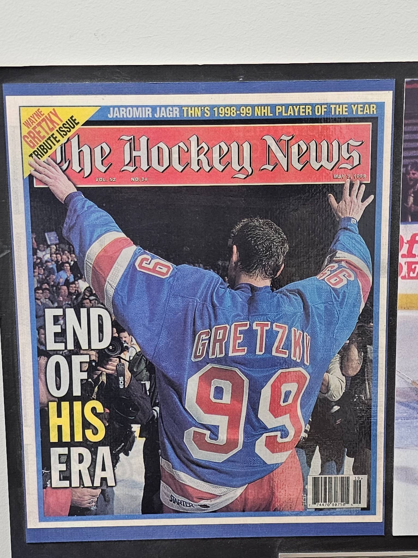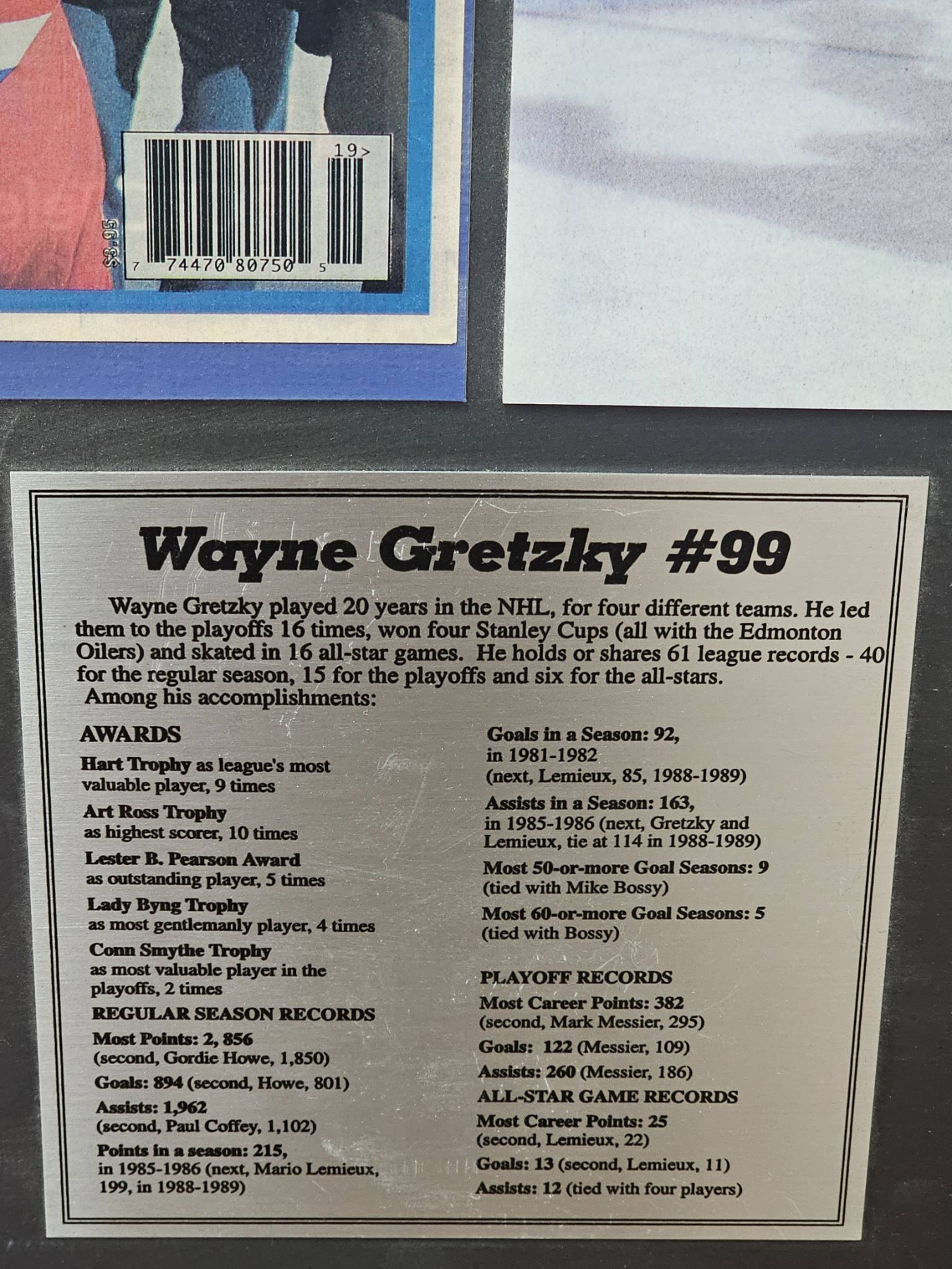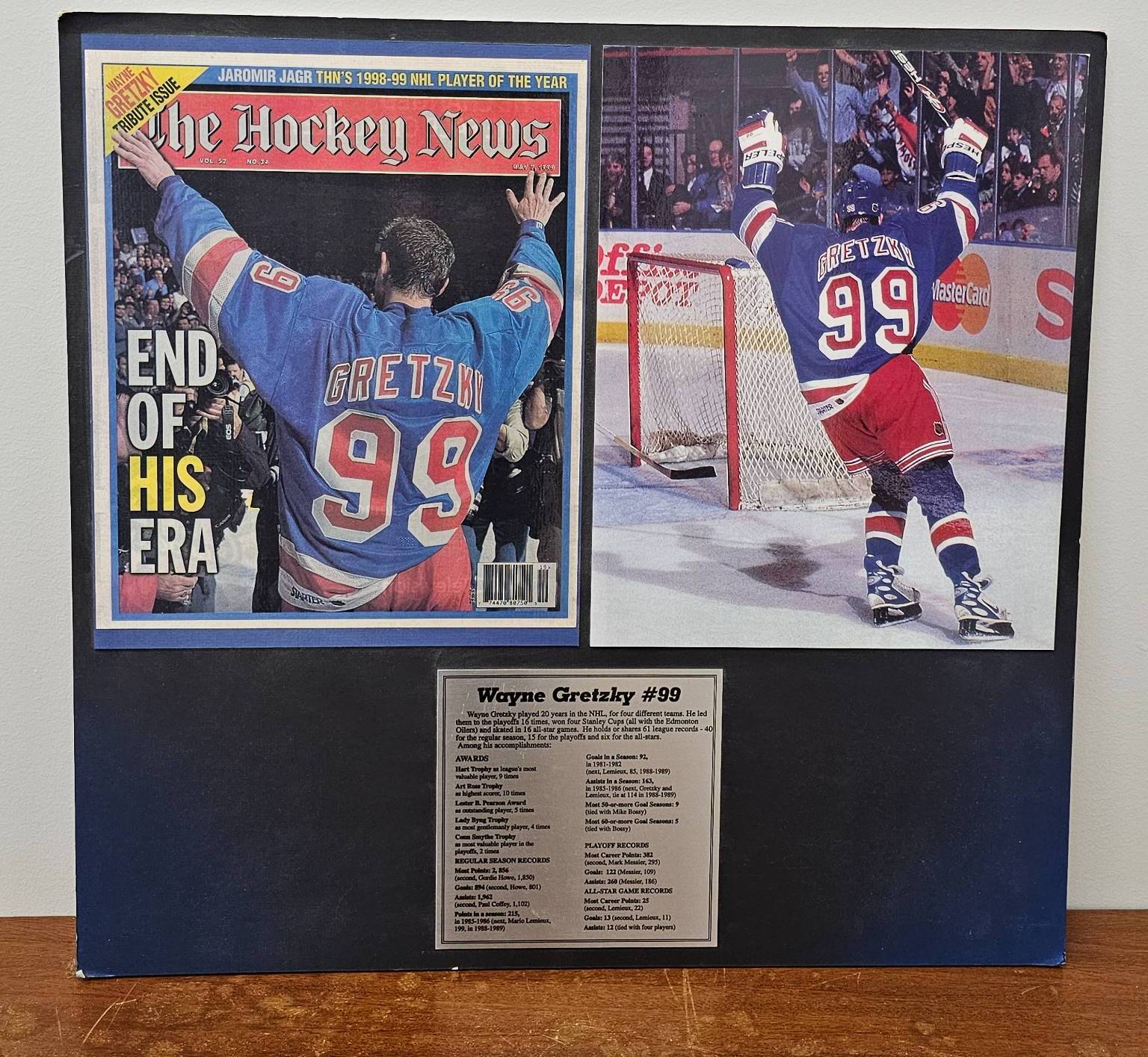 Framed tribute plaque celebrating Wayne Gretzky's iconic NHL career. Features a cover of 'The Hockey News' marking the end of his era, an action photo of Gretzky celebrating, and a detailed plaque summarizing his career achievements, including milestones, awards, and records. Measures approximately 16x16 inches. Suitable for fans and collectors of hockey memorabilia.