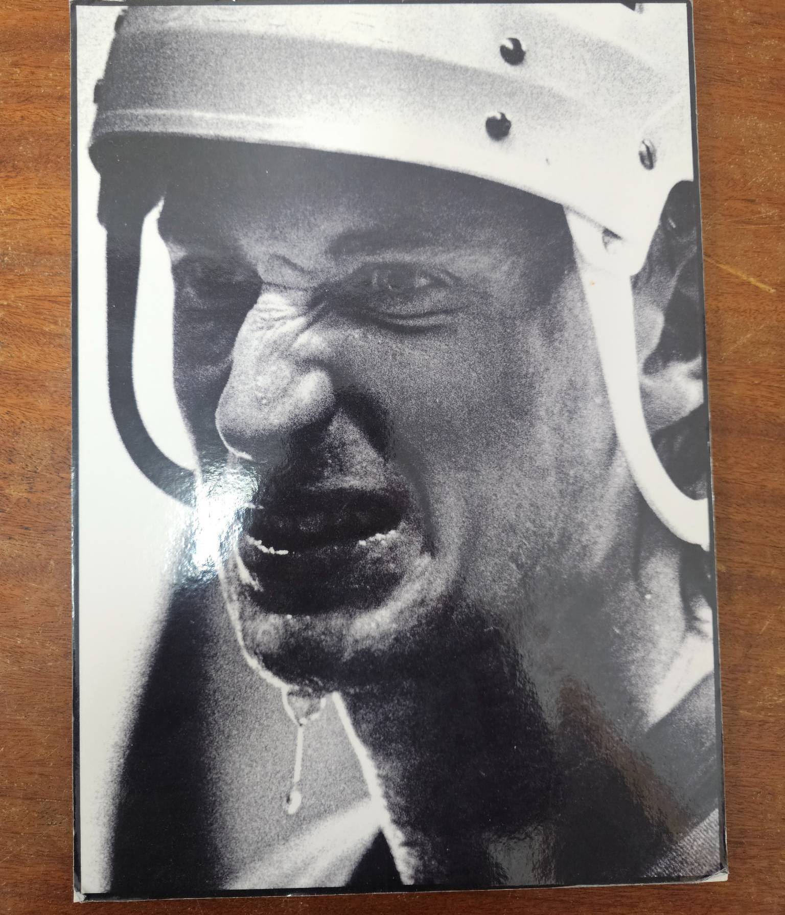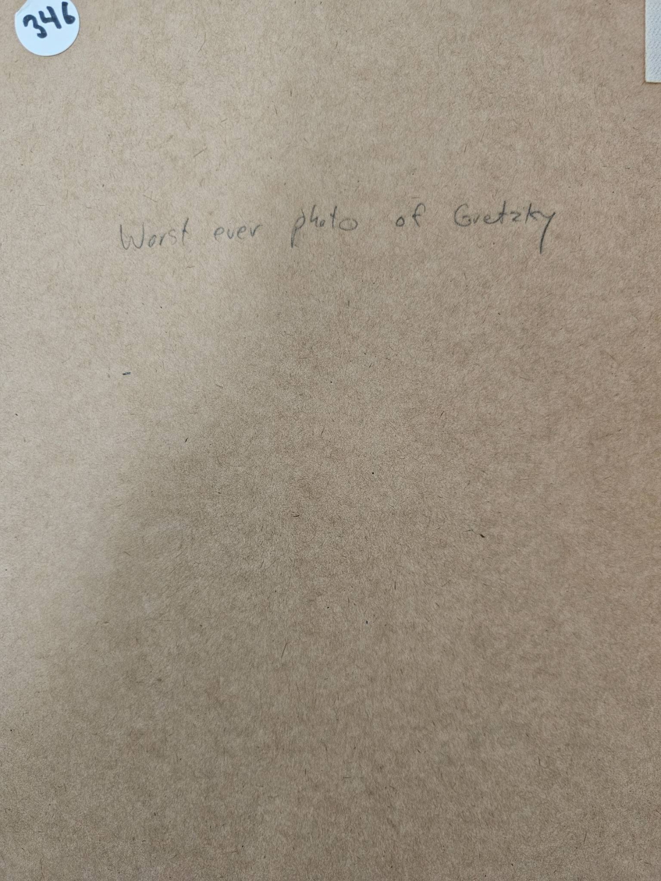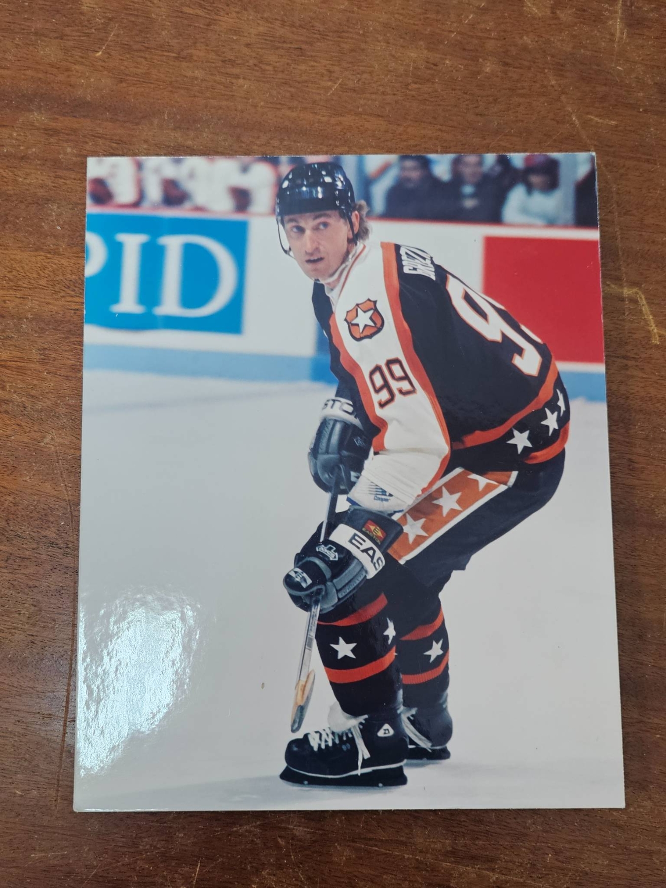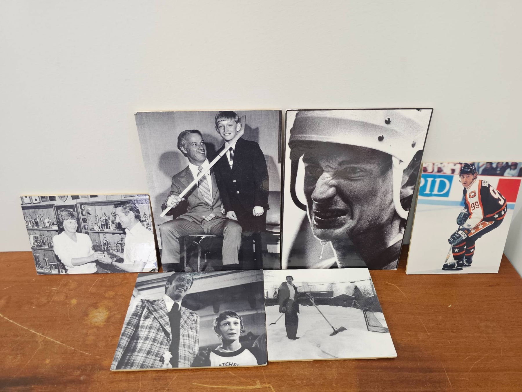 Seven hockey-related photographs, including both black-and-white and color images. The collection highlights hockey players in various settings such as an outdoor rink, trophy room, and during gameplay. Items include one scene depicting a player in a No. 99 jersey, a close-up portrait, and a team celebration. The photographs vary in formats and sizes, with minimal handwritten notations on the back.