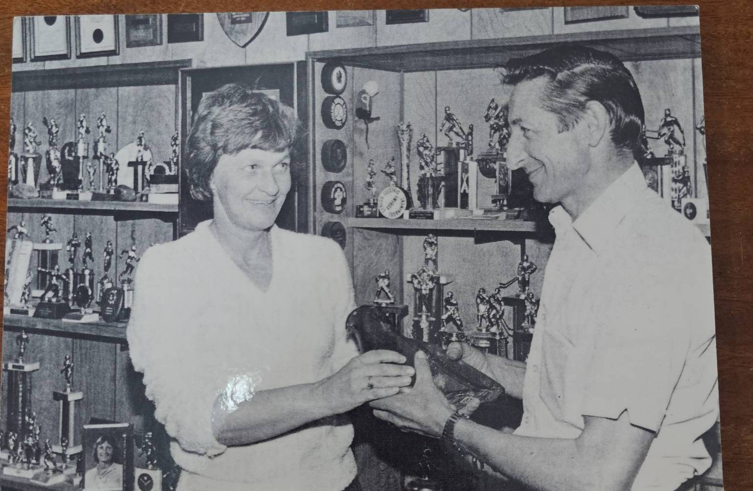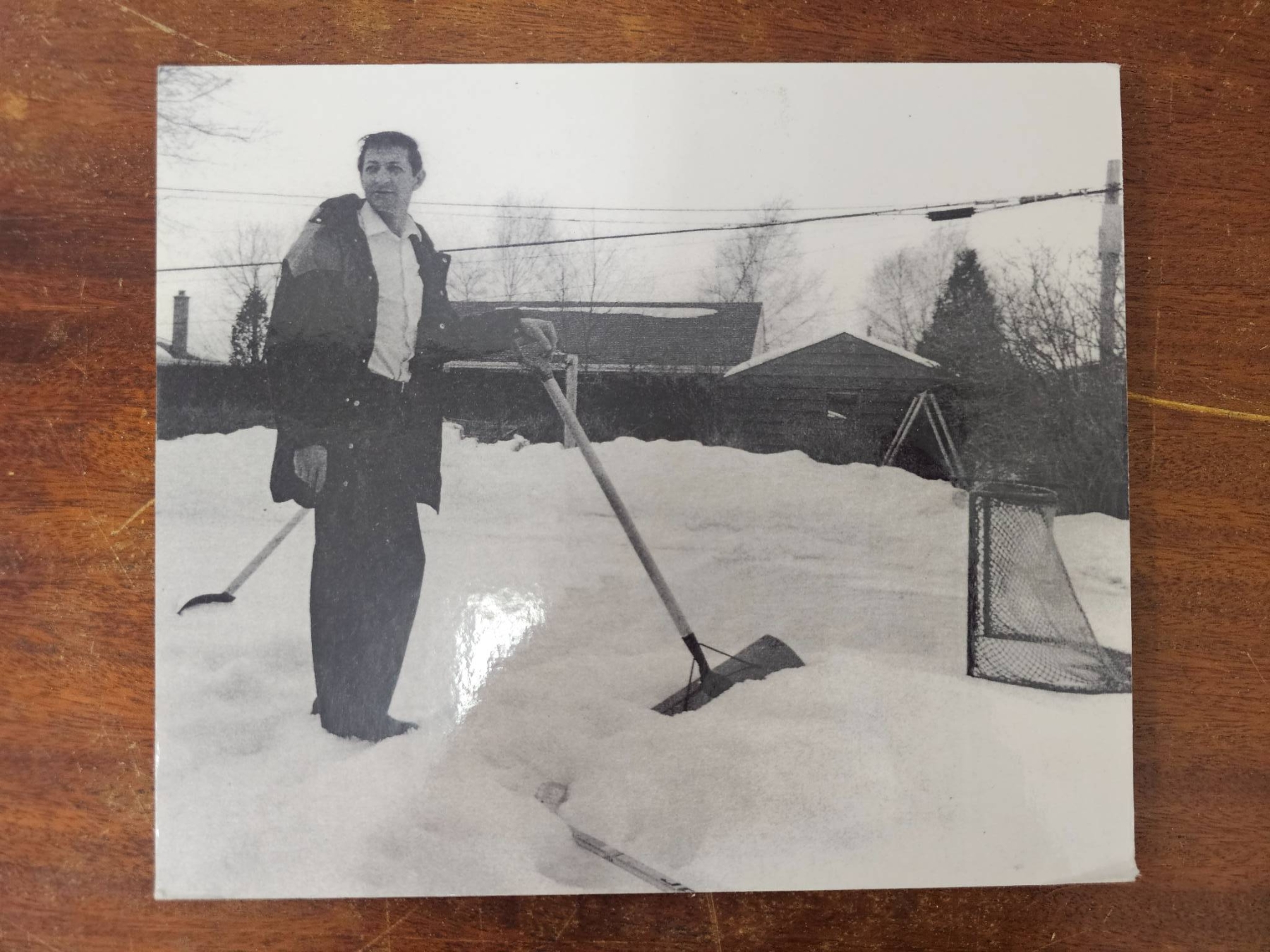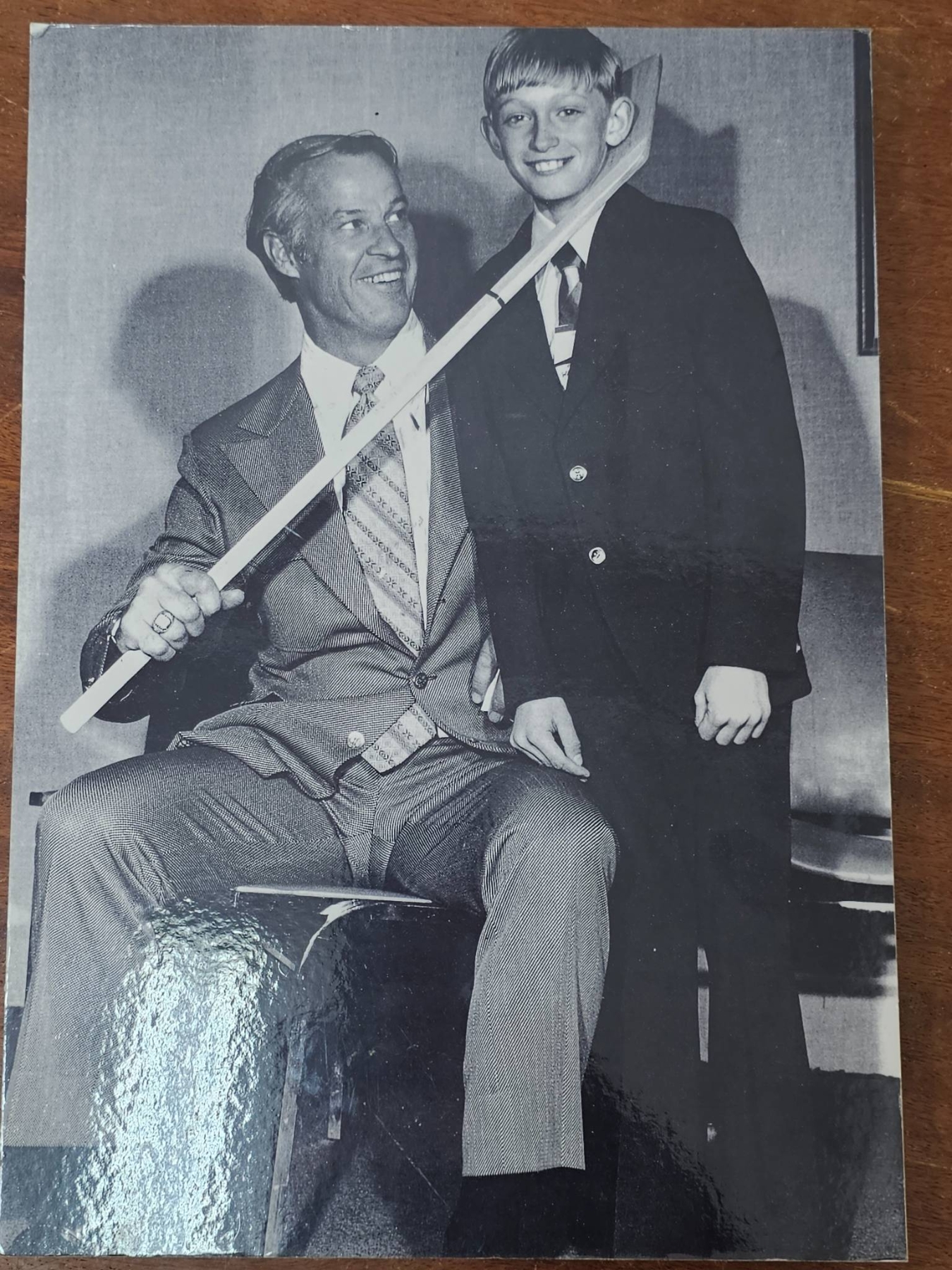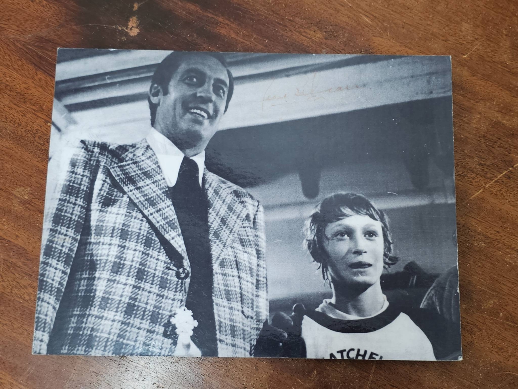 Seven hockey-related photographs, including both black-and-white and color images. The collection highlights hockey players in various settings such as an outdoor rink, trophy room, and during gameplay. Items include one scene depicting a player in a No. 99 jersey, a close-up portrait, and a team celebration. The photographs vary in formats and sizes, with minimal handwritten notations on the back.