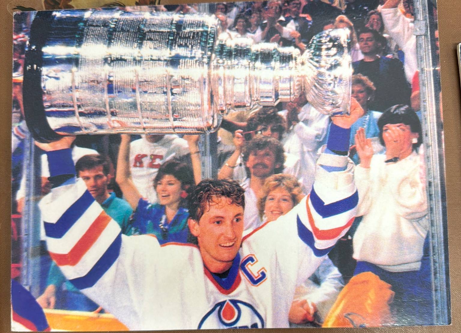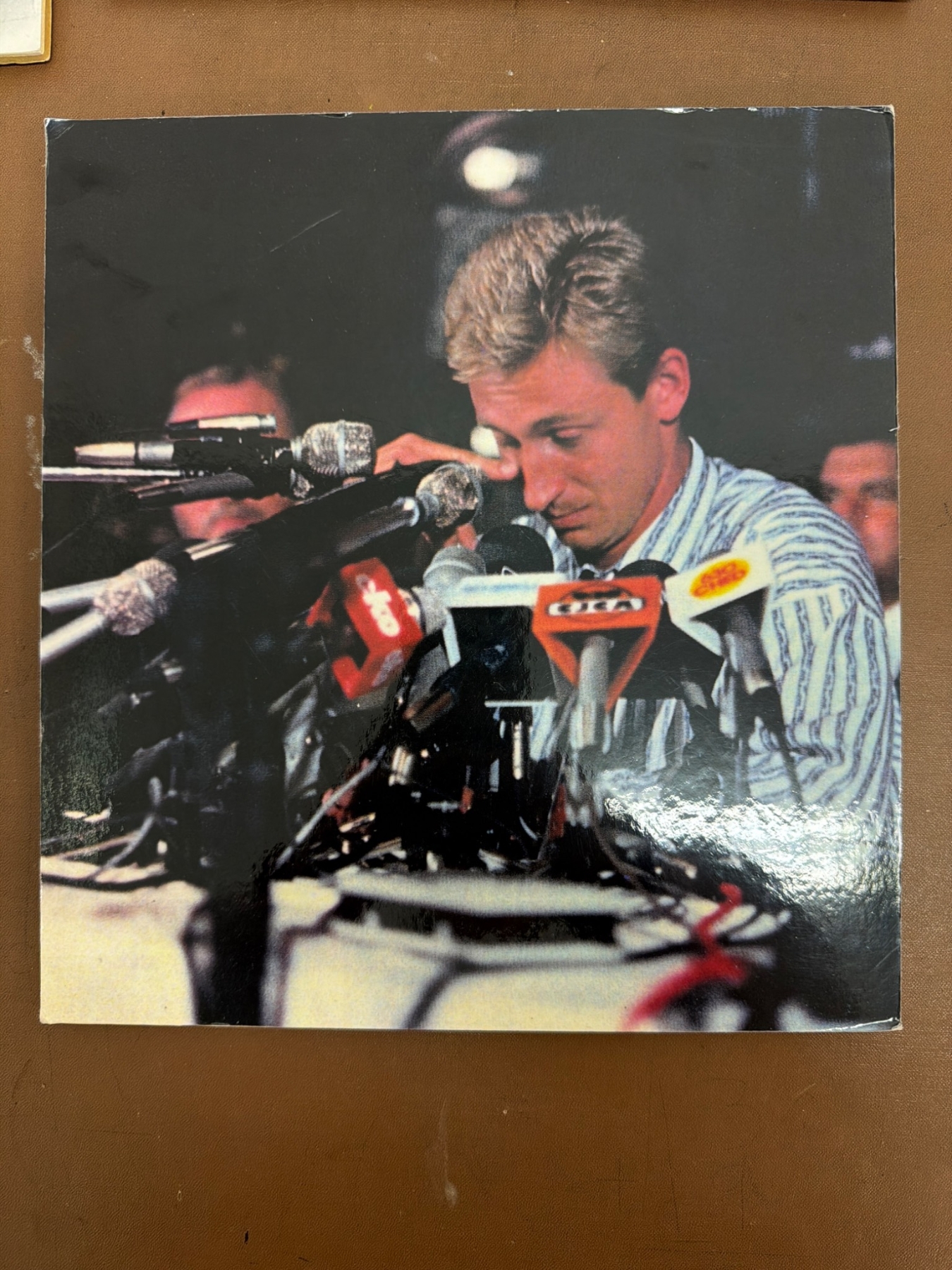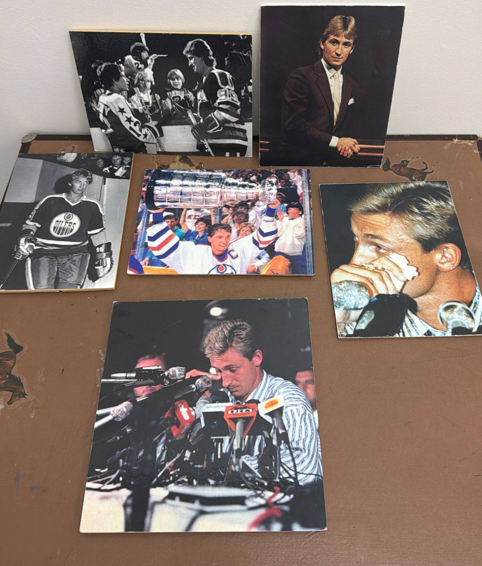 Six photographs featuring Wayne Gretzky during different moments, including gameplay with the Oilers, interactions with other players, Stanley Cup victory, emotional press statements, and a formal portrait. The photographs showcase notable and personal moments tied to Gretzky's career and life. Condition of the photographs appears preserved and is suitable for display or collection.