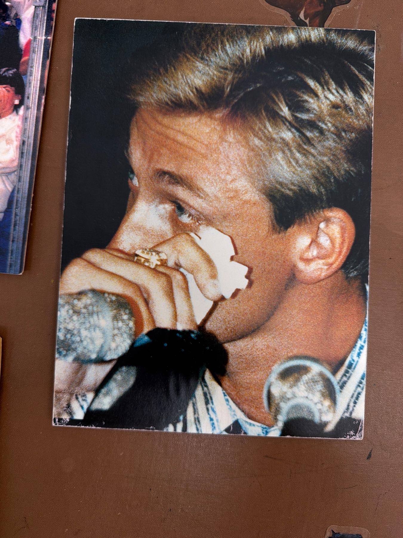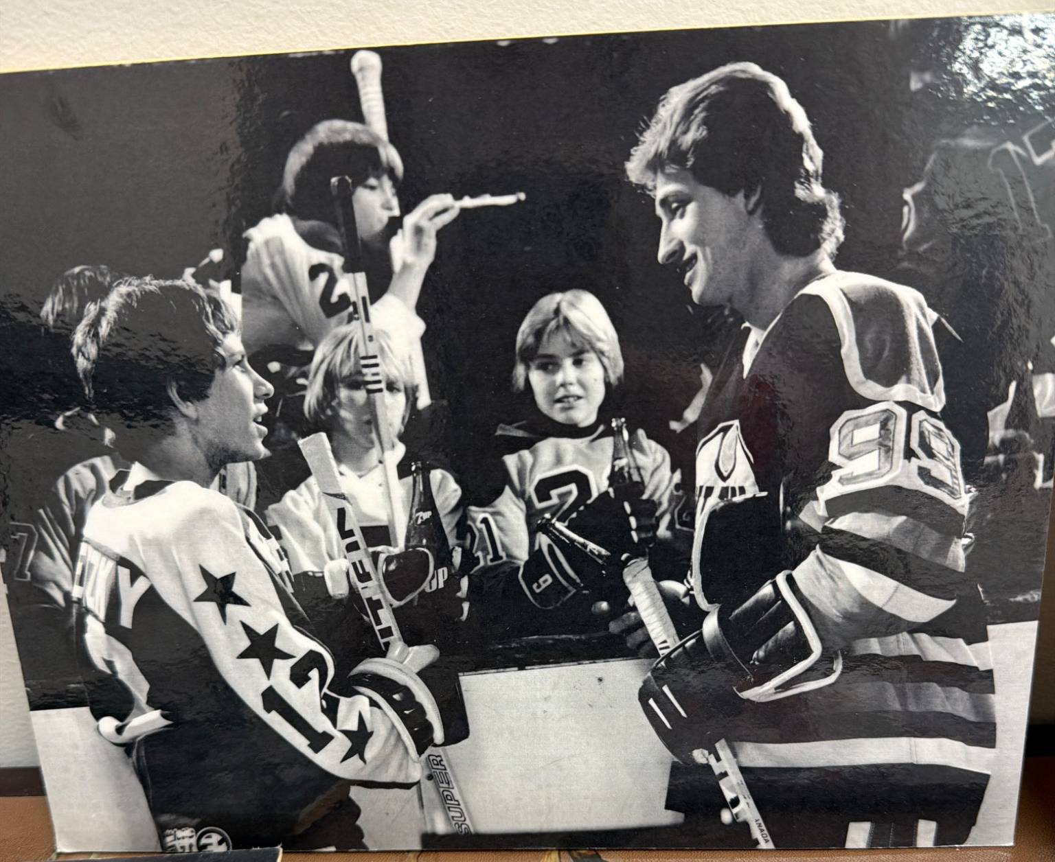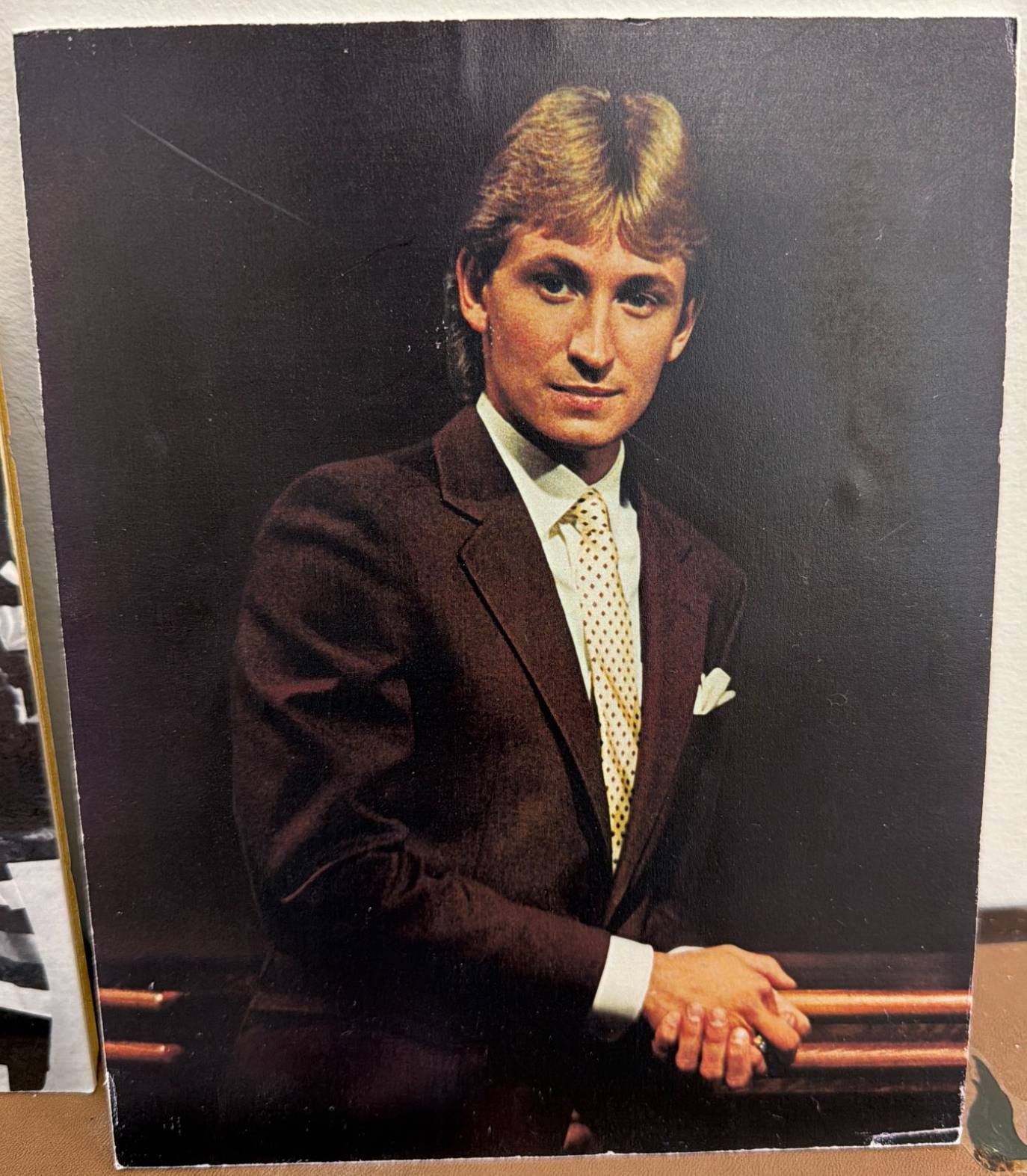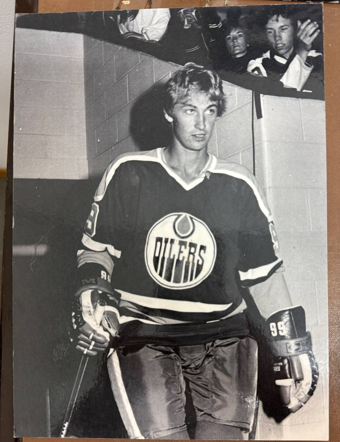 Six photographs featuring Wayne Gretzky during different moments, including gameplay with the Oilers, interactions with other players, Stanley Cup victory, emotional press statements, and a formal portrait. The photographs showcase notable and personal moments tied to Gretzky's career and life. Condition of the photographs appears preserved and is suitable for display or collection.