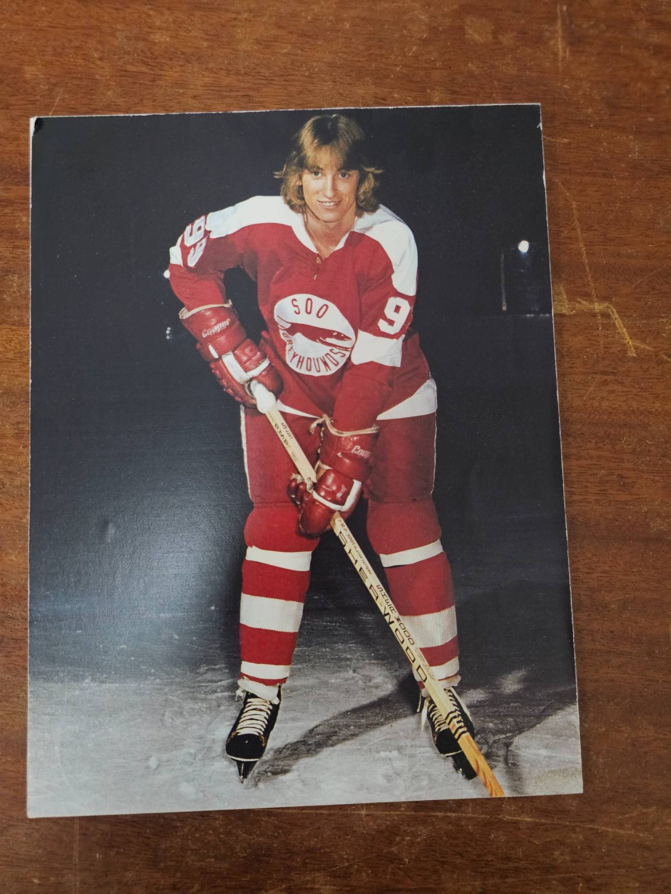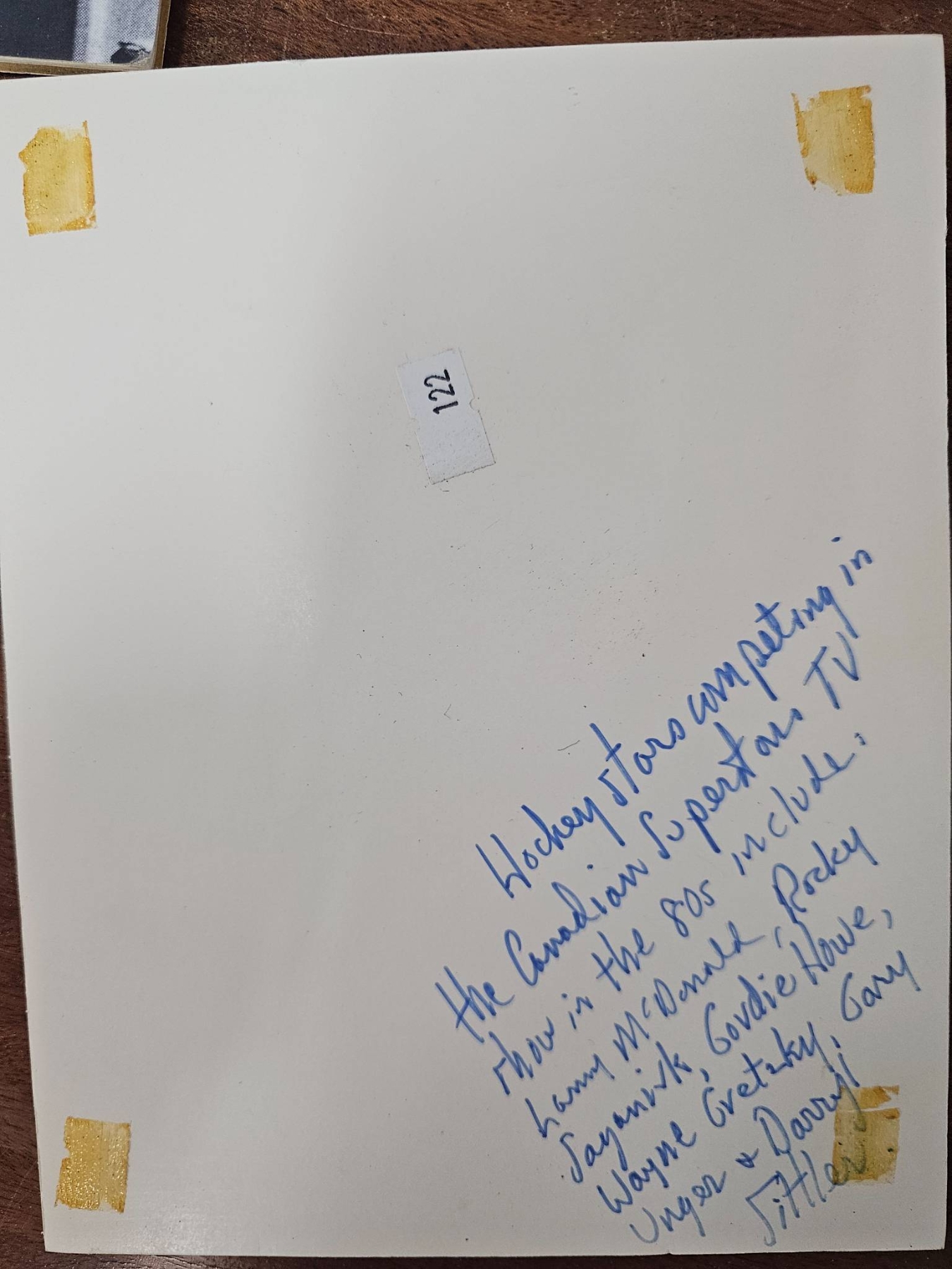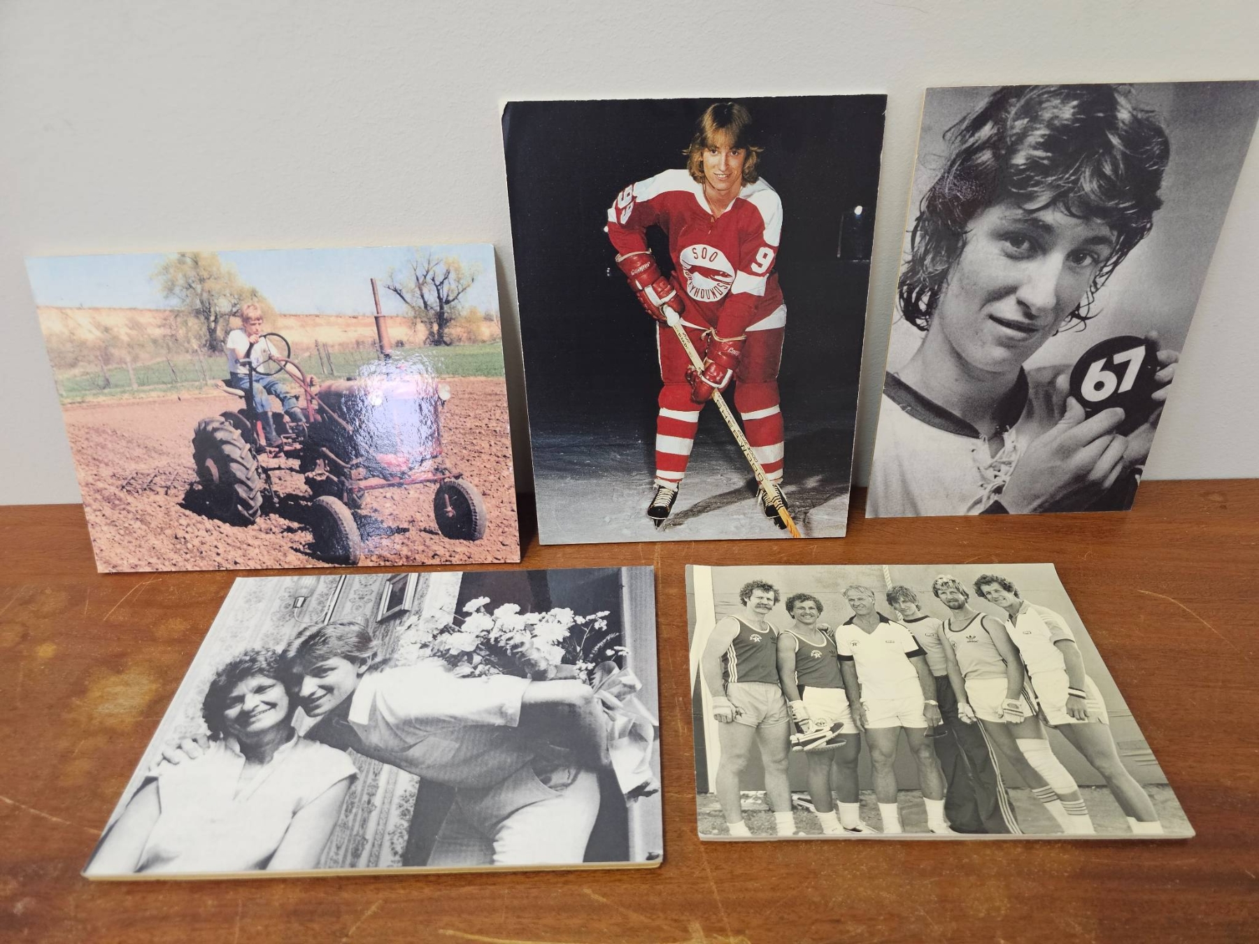 Five photographs, including color and black-and-white prints. The set contains hockey-related images, including a player in Soo Greyhounds attire and a posed headshot holding a puck, alongside non-sports-oriented personal photos, such as one on a tractor and group portraits. A handwritten note on the back references a Canadian sports TV event from the 1980s.