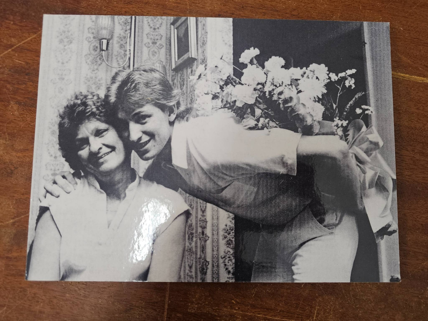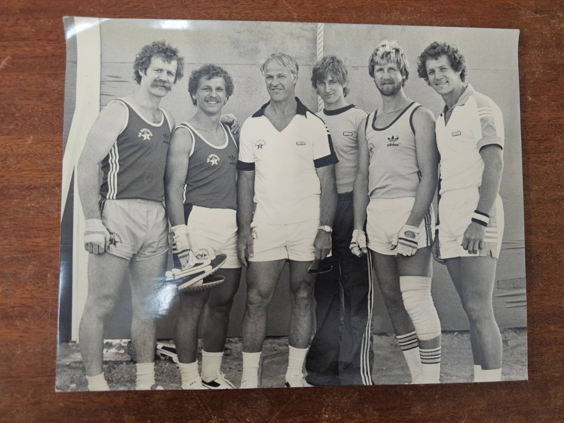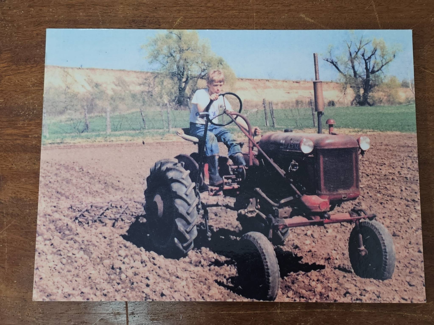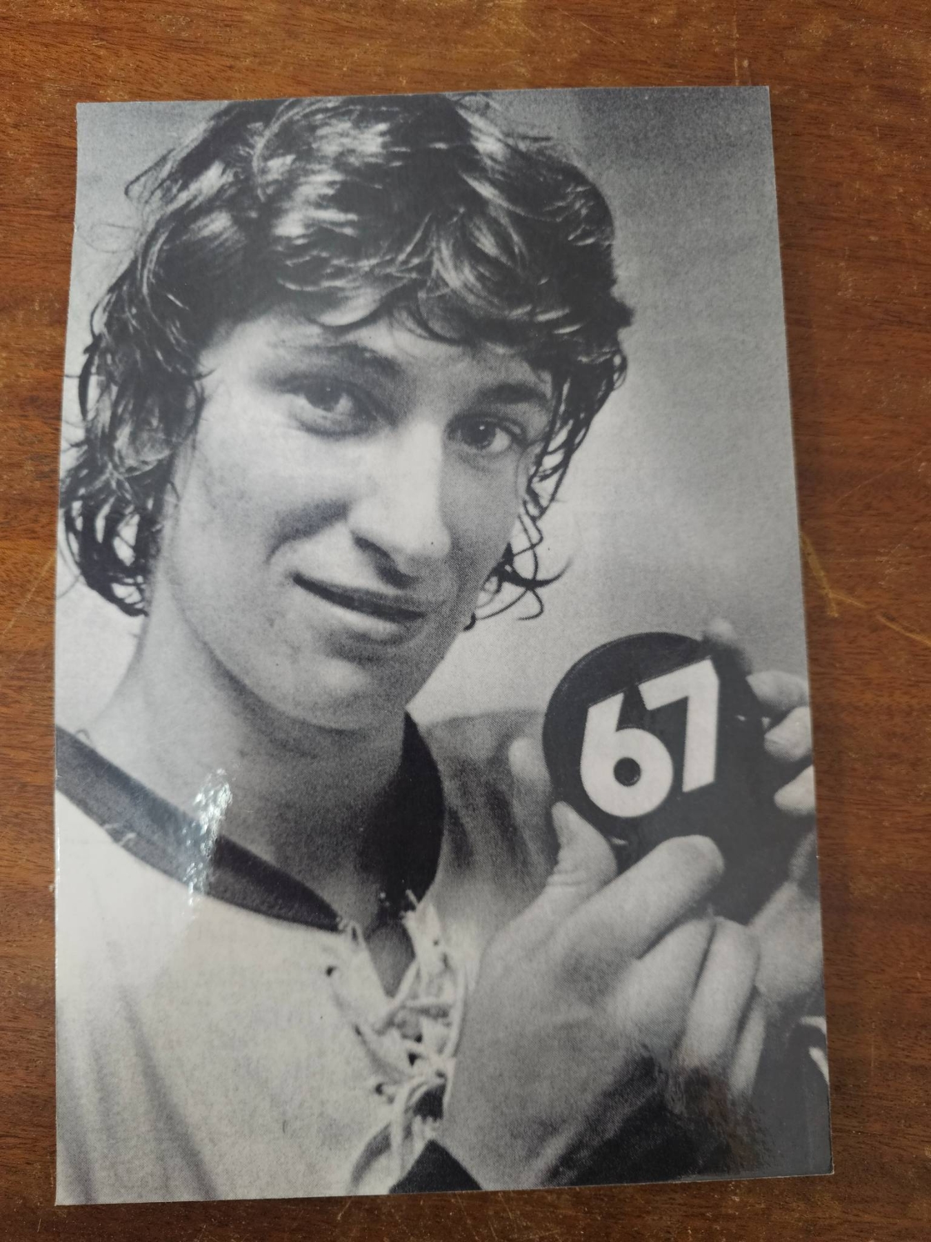 Five photographs, including color and black-and-white prints. The set contains hockey-related images, including a player in Soo Greyhounds attire and a posed headshot holding a puck, alongside non-sports-oriented personal photos, such as one on a tractor and group portraits. A handwritten note on the back references a Canadian sports TV event from the 1980s.