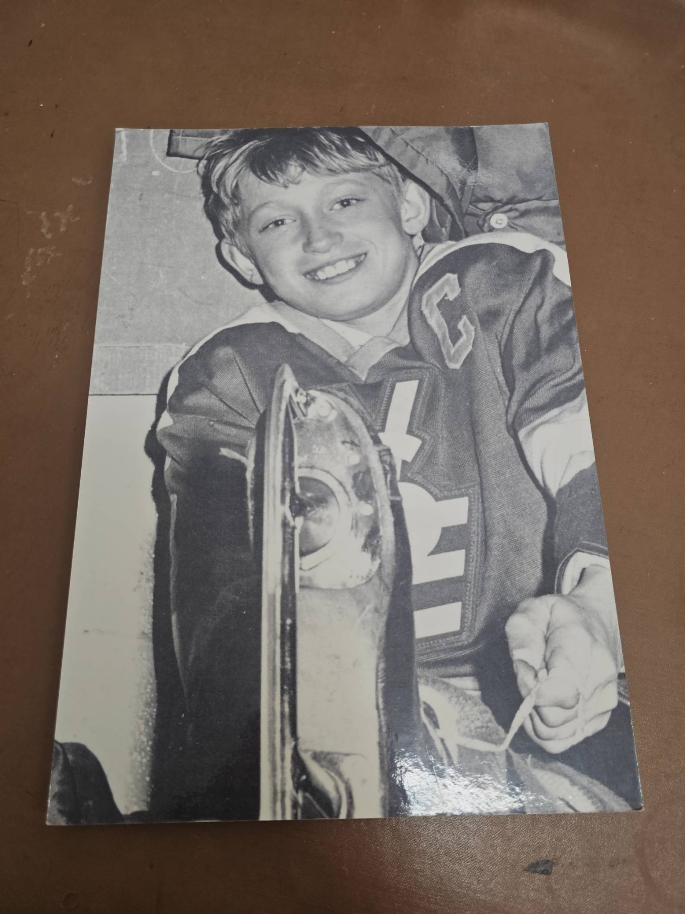 Two black-and-white photographs featuring a young Wayne Gretzky dressed in hockey gear with an 'NSE' team logo and wearing the 'C' for captain. One image showcases Gretzky smiling with a trophy, while the other offers a portrait-style view. Ideal for hockey memorabilia collectors and fans of 'The Great One.' Condition appears well-preserved, suitable for display.