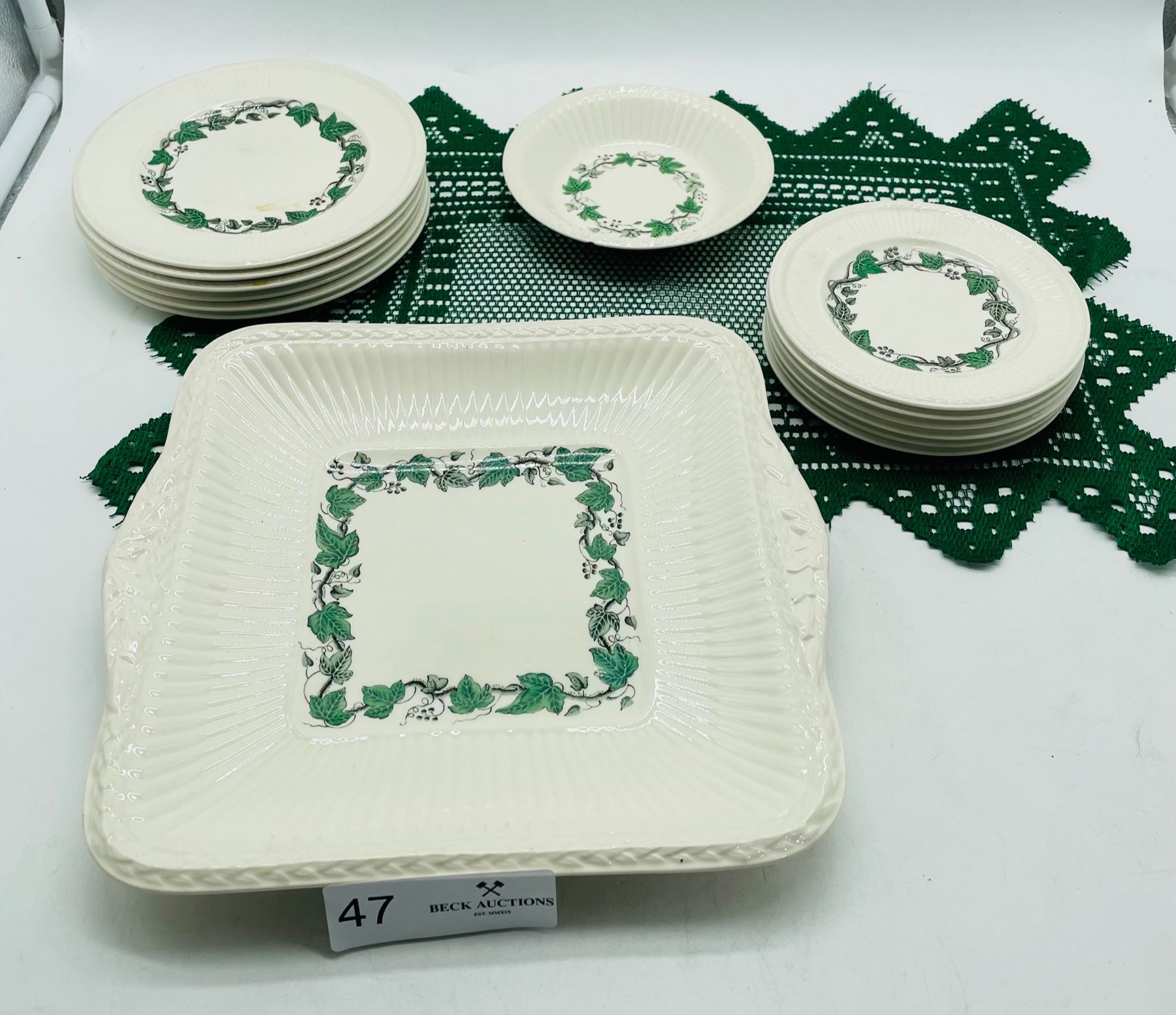 Lot of Wedgwood "Napoleon Ivy" dishes. The large plate is in excellent condition and measures 10 x 9 inches, 6 x small 5 inch saucers with no damage, 1 x small bowl with no damage, 6 x 6 - 1/2 inch dessert plates with one chip, and one small nappy bowl with a large chip.
