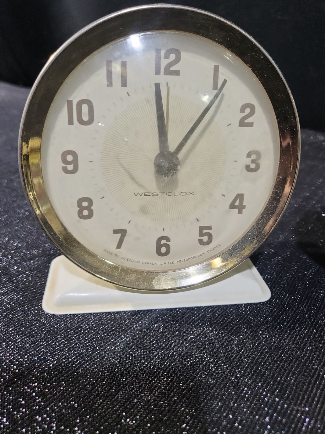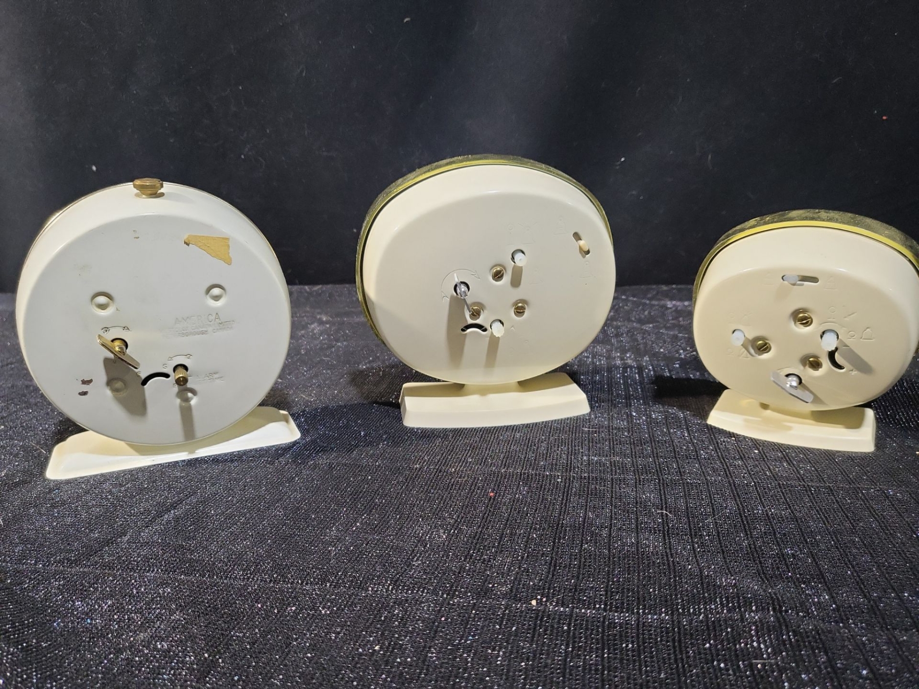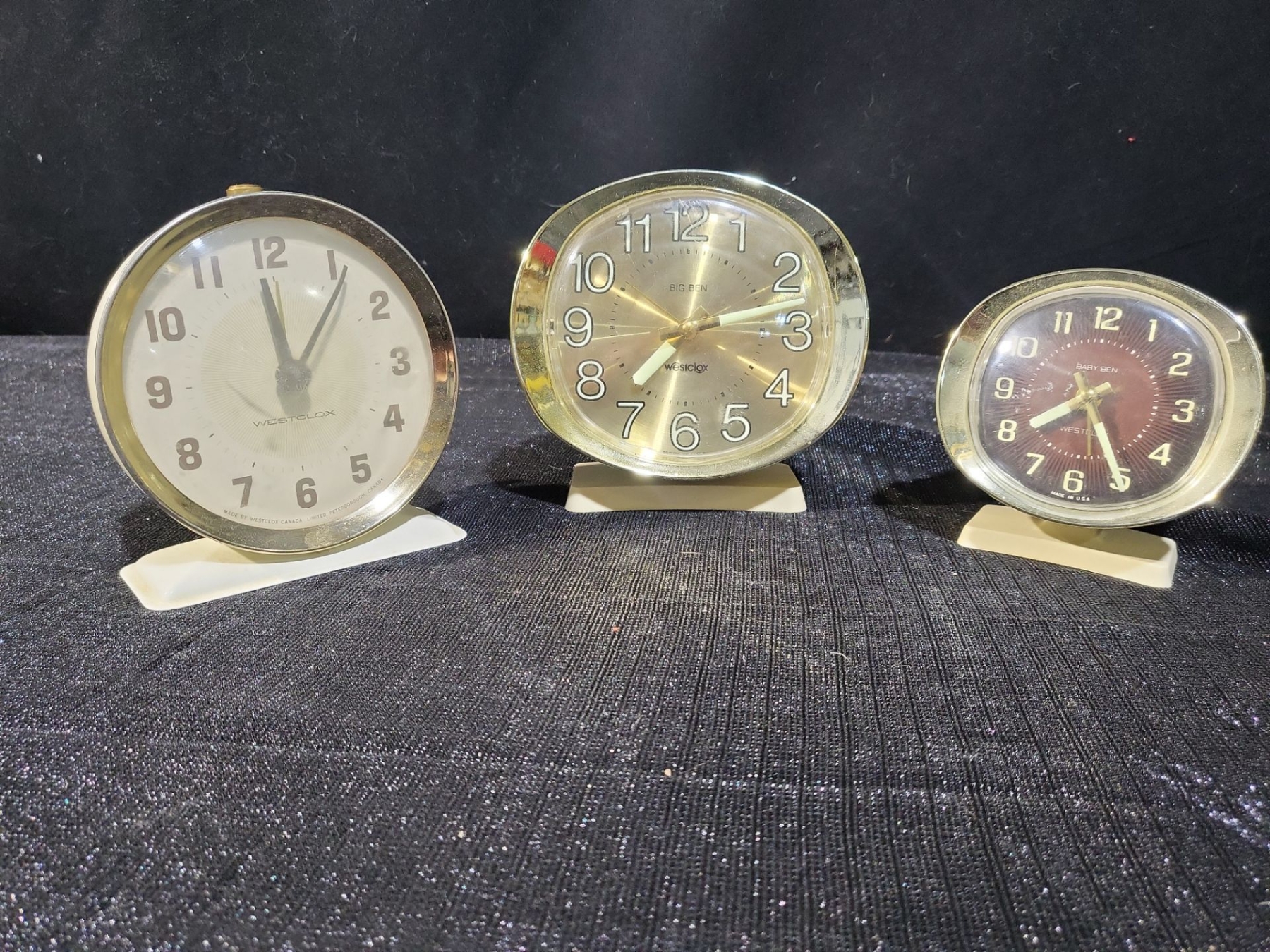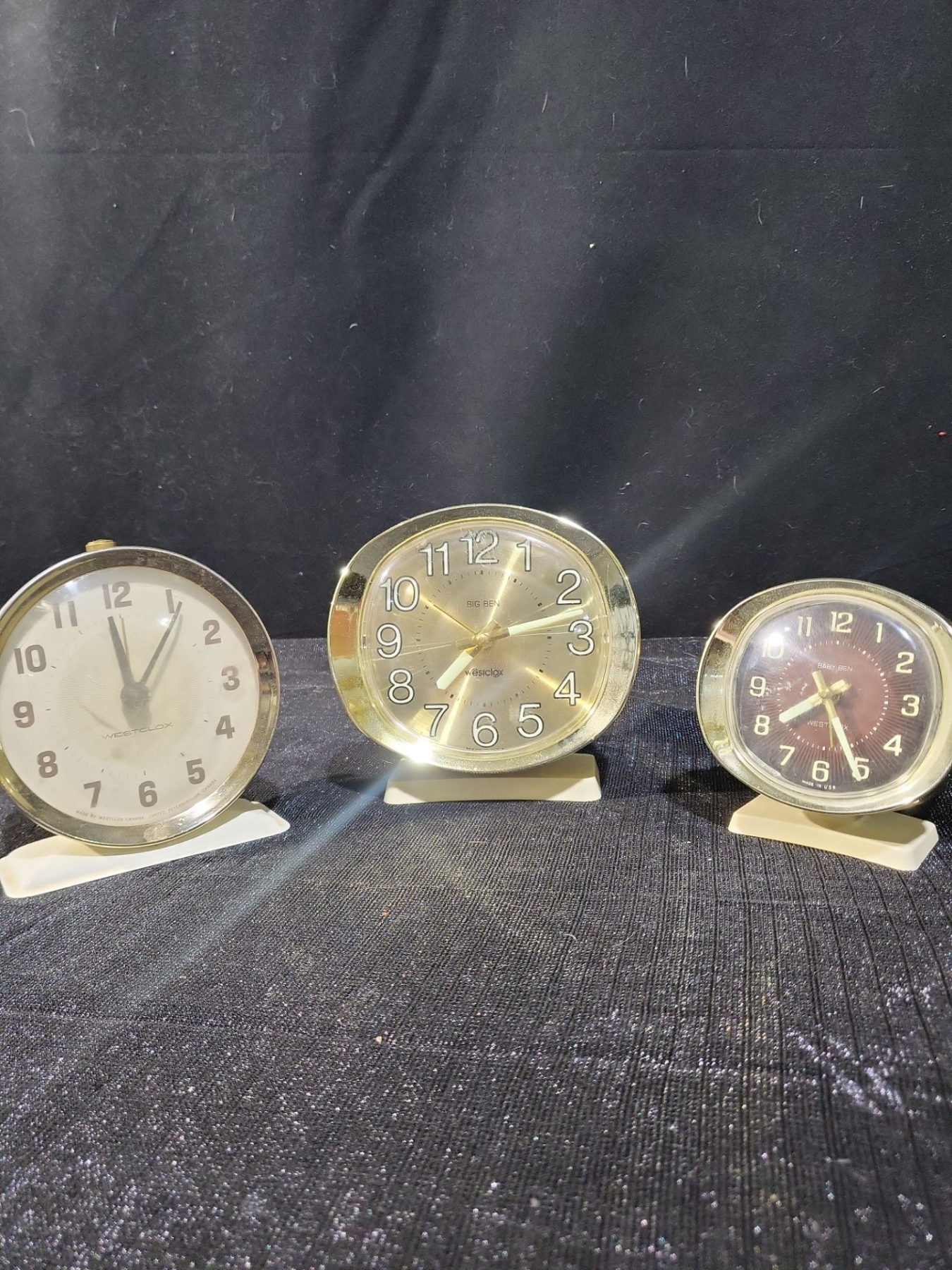 3 vintage West Clock wind up table alarm clocks. They offer a touch of vintage charm to your bed side table and work on simple mechanics to make sure you are up for your most important dates