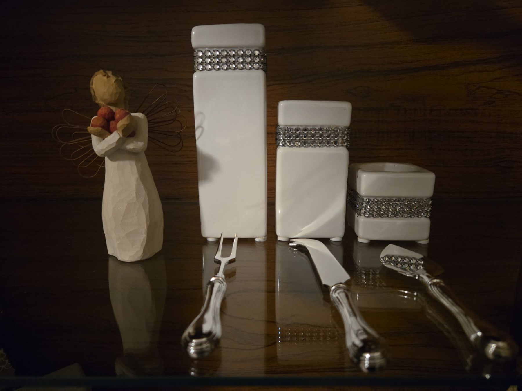 White Candle Holders Collection, Stainless Serving Utensils &  Willow Tree Hand Carved Figure