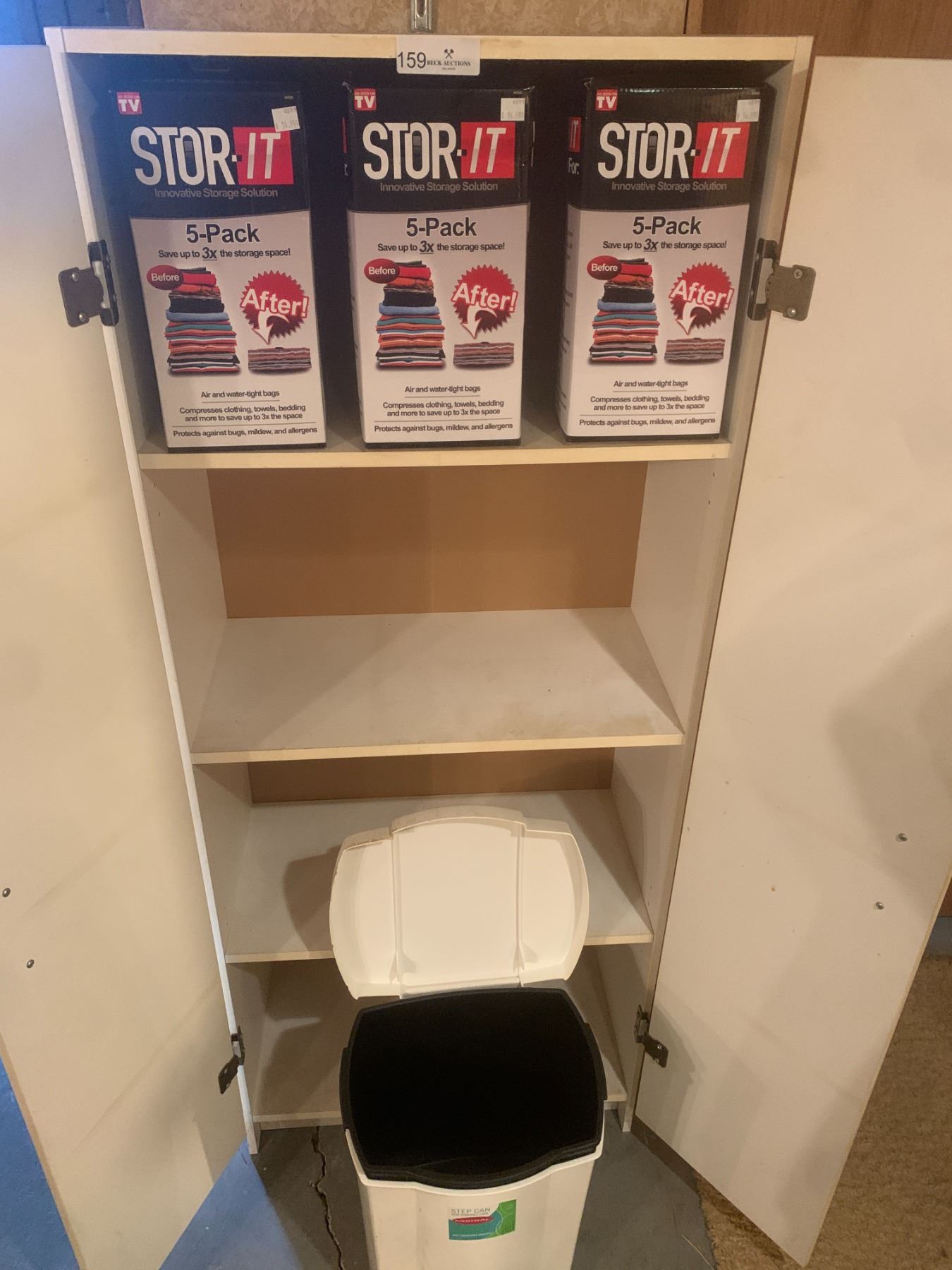 White Laundry Cabinet (59" x 24" x 13"), with Wastebasket, and 3 Sets Stor-It Bags (New in Box)