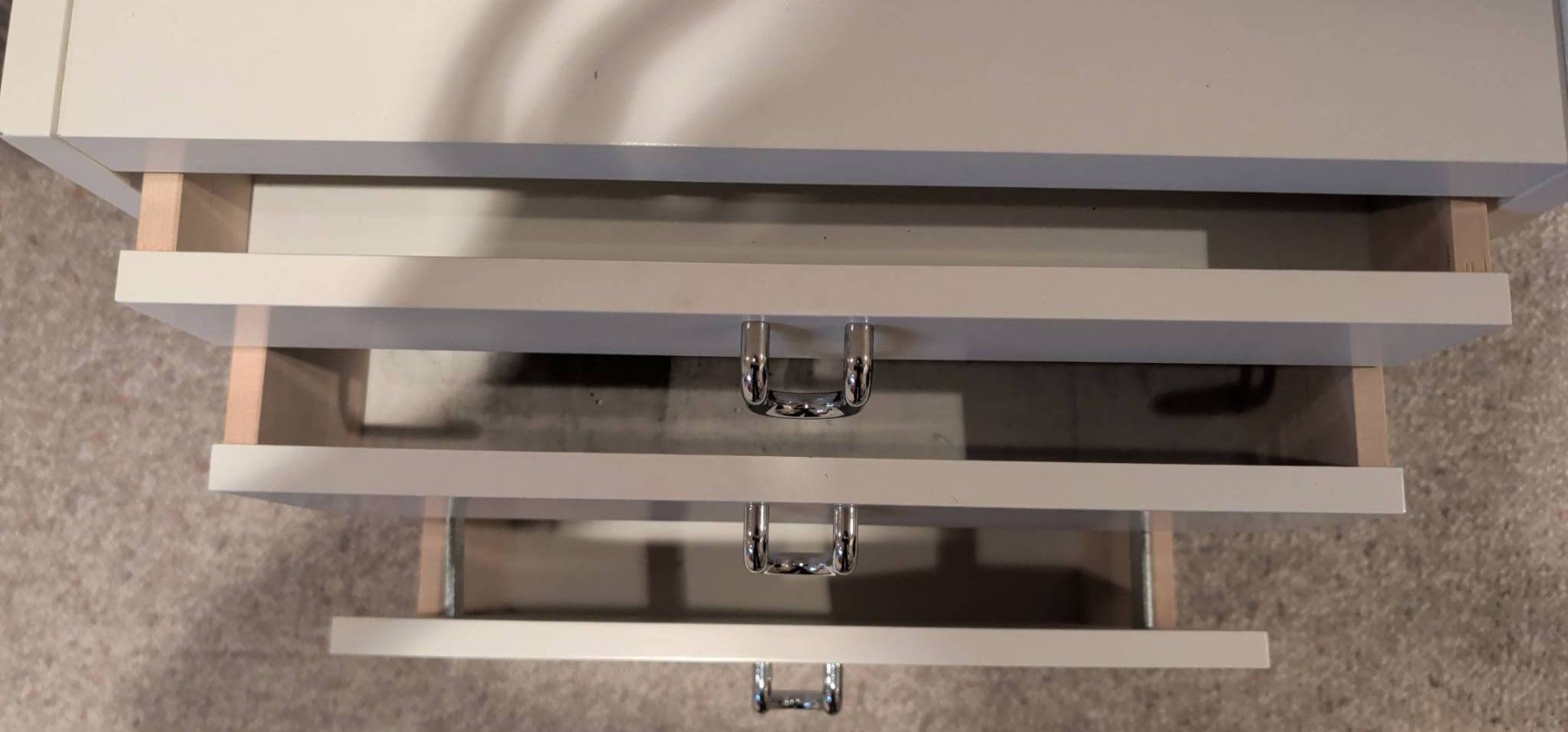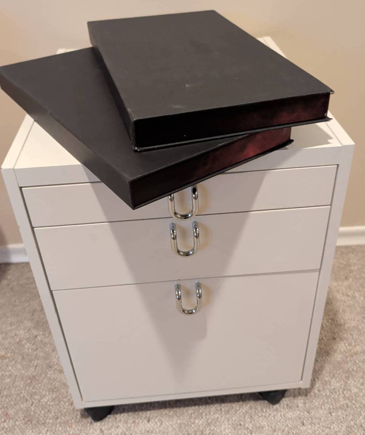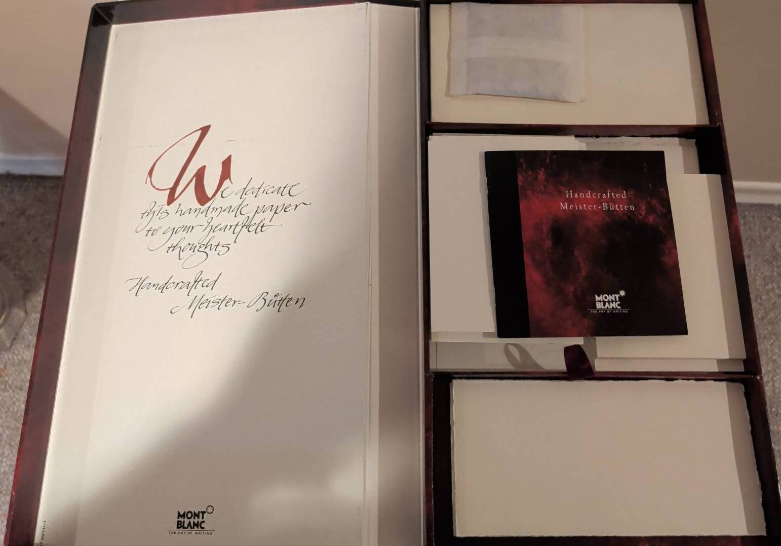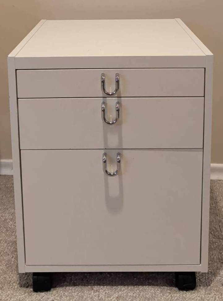 White rolling storage cabinet with three spacious drawers and chrome pull handles, ideal for organizing supplies or personal items. Includes a Montblanc writing set featuring handmade Meister-Bütten paper, presented in elegant black cases. Cabinet dimensions measure approximately 24 inches tall, 16 inches wide, and 16 inches deep, making it compact yet functional. Items are in excellent condition with visible quality craftsmanship.