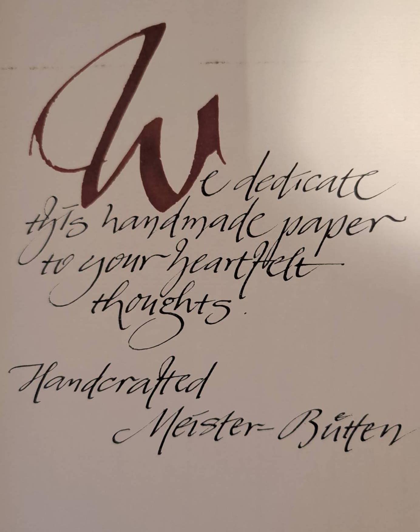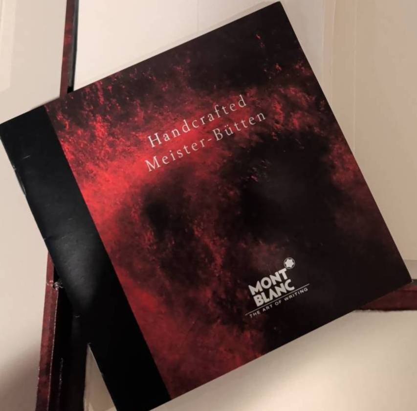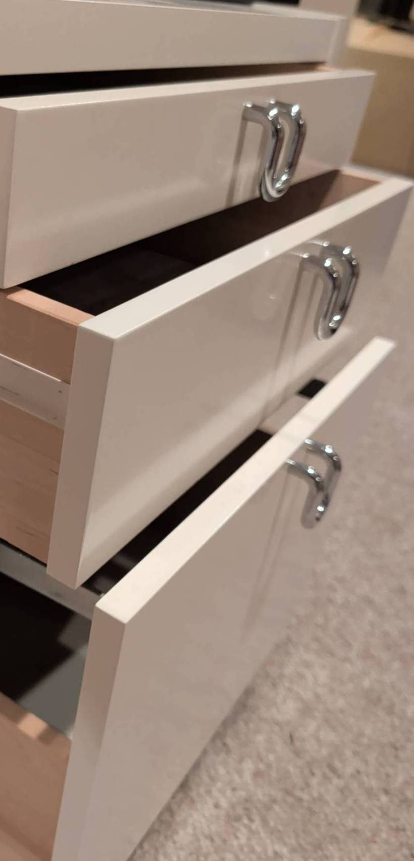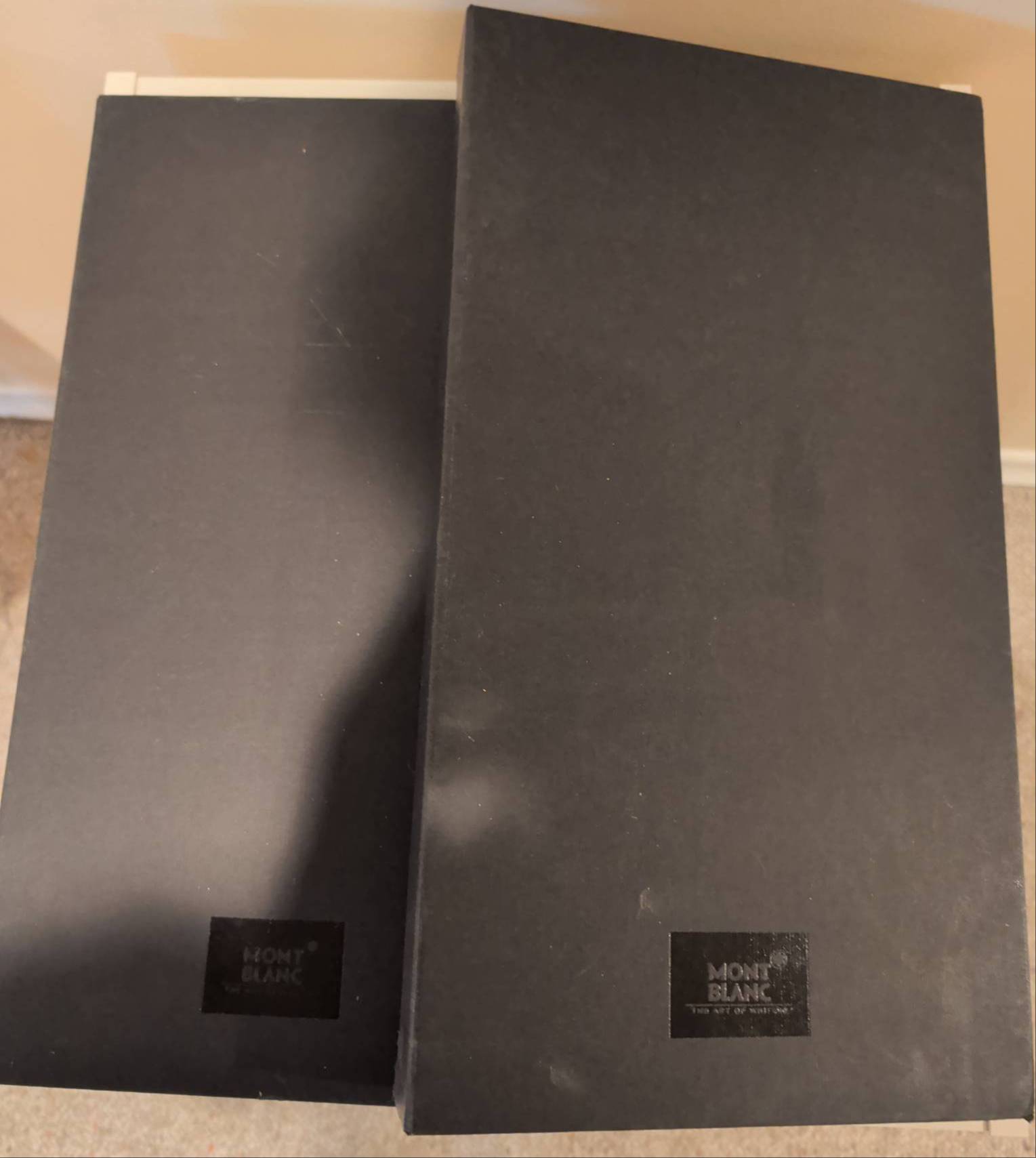 White rolling storage cabinet with three spacious drawers and chrome pull handles, ideal for organizing supplies or personal items. Includes a Montblanc writing set featuring handmade Meister-Bütten paper, presented in elegant black cases. Cabinet dimensions measure approximately 24 inches tall, 16 inches wide, and 16 inches deep, making it compact yet functional. Items are in excellent condition with visible quality craftsmanship.