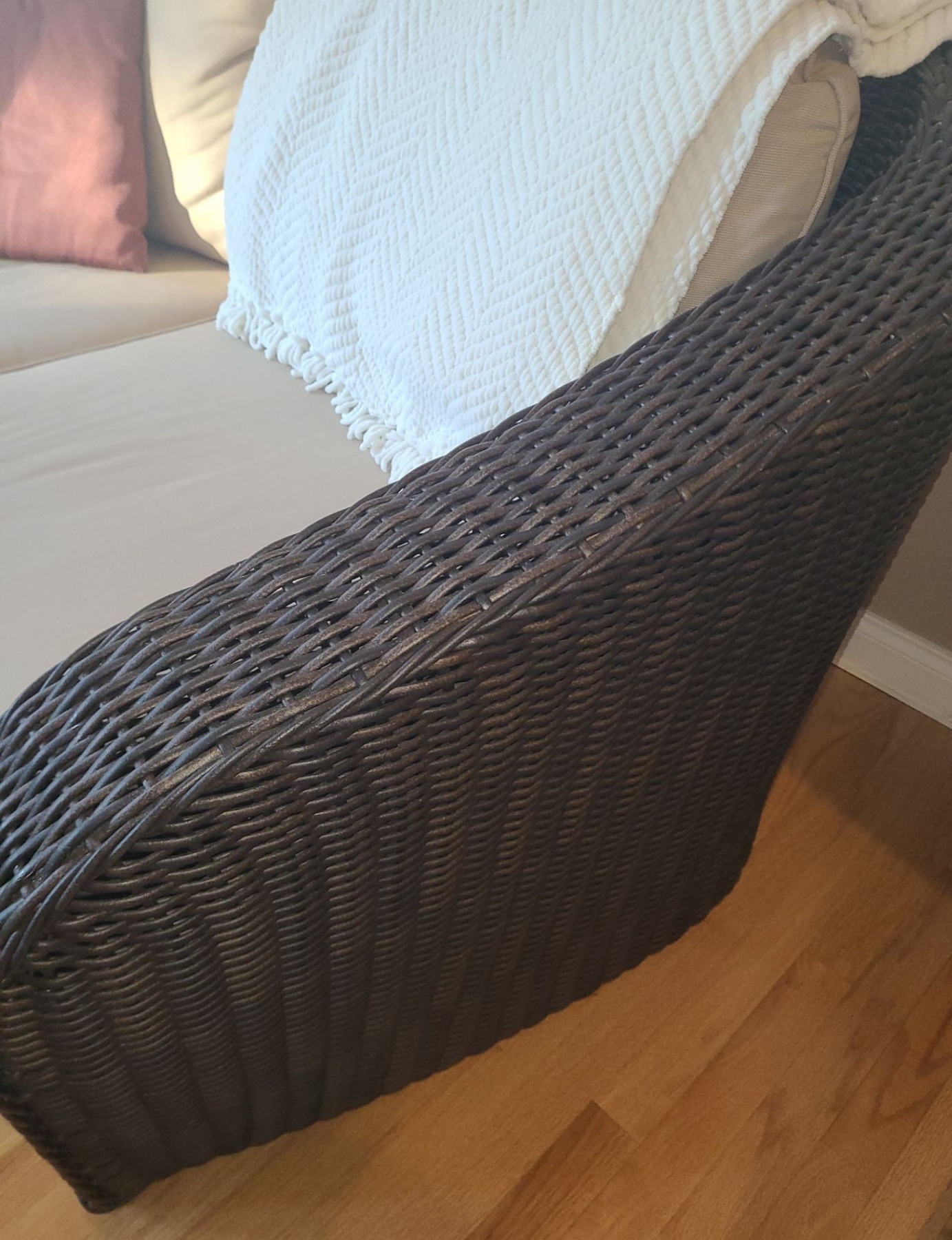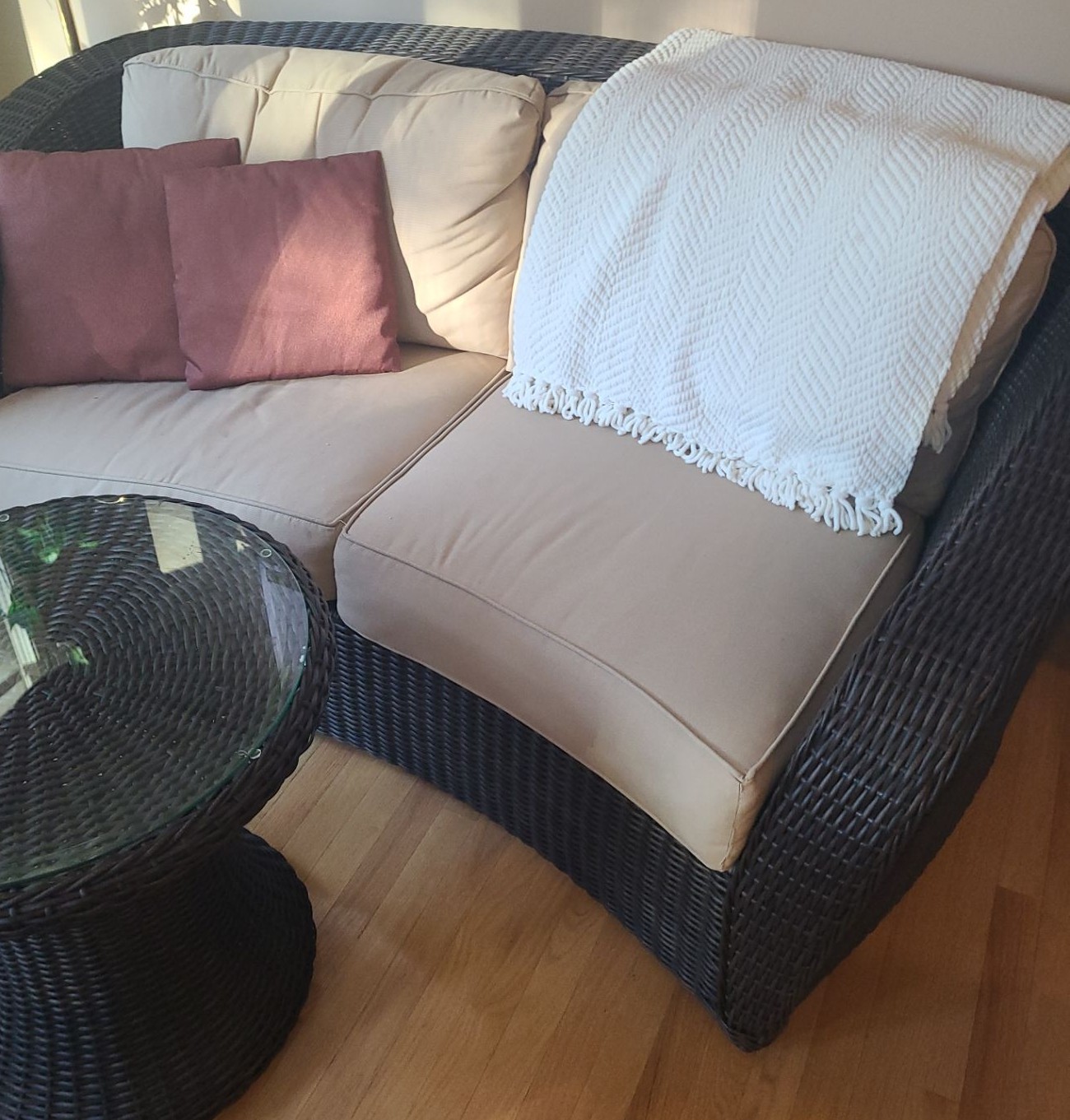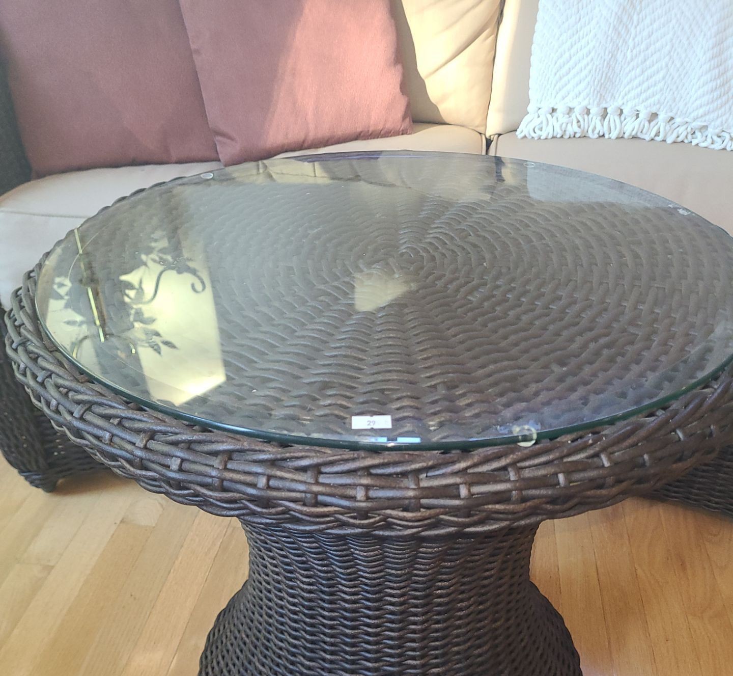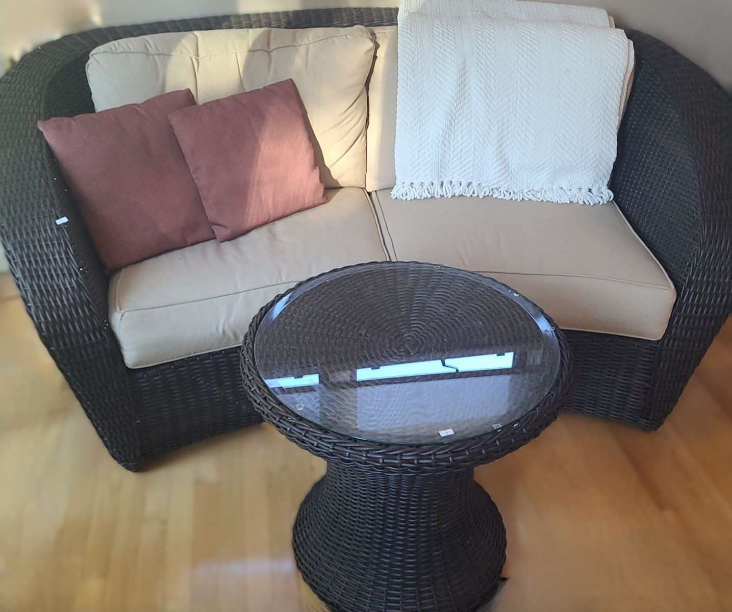 Wicker Look Two Seat Sofa 76 W, 35 D, 34 T and Table w/ Glass Topper 24" Diameter, 22 T