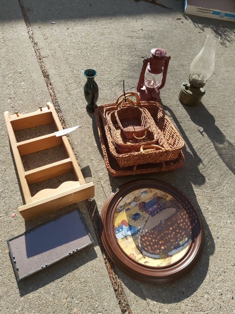 Wicker baskets (square, variety of sizes), wall hanging (with hooks), 2 hurrican lamps, glass/mirror tray, glass vase, farm painting/plate with wood frame