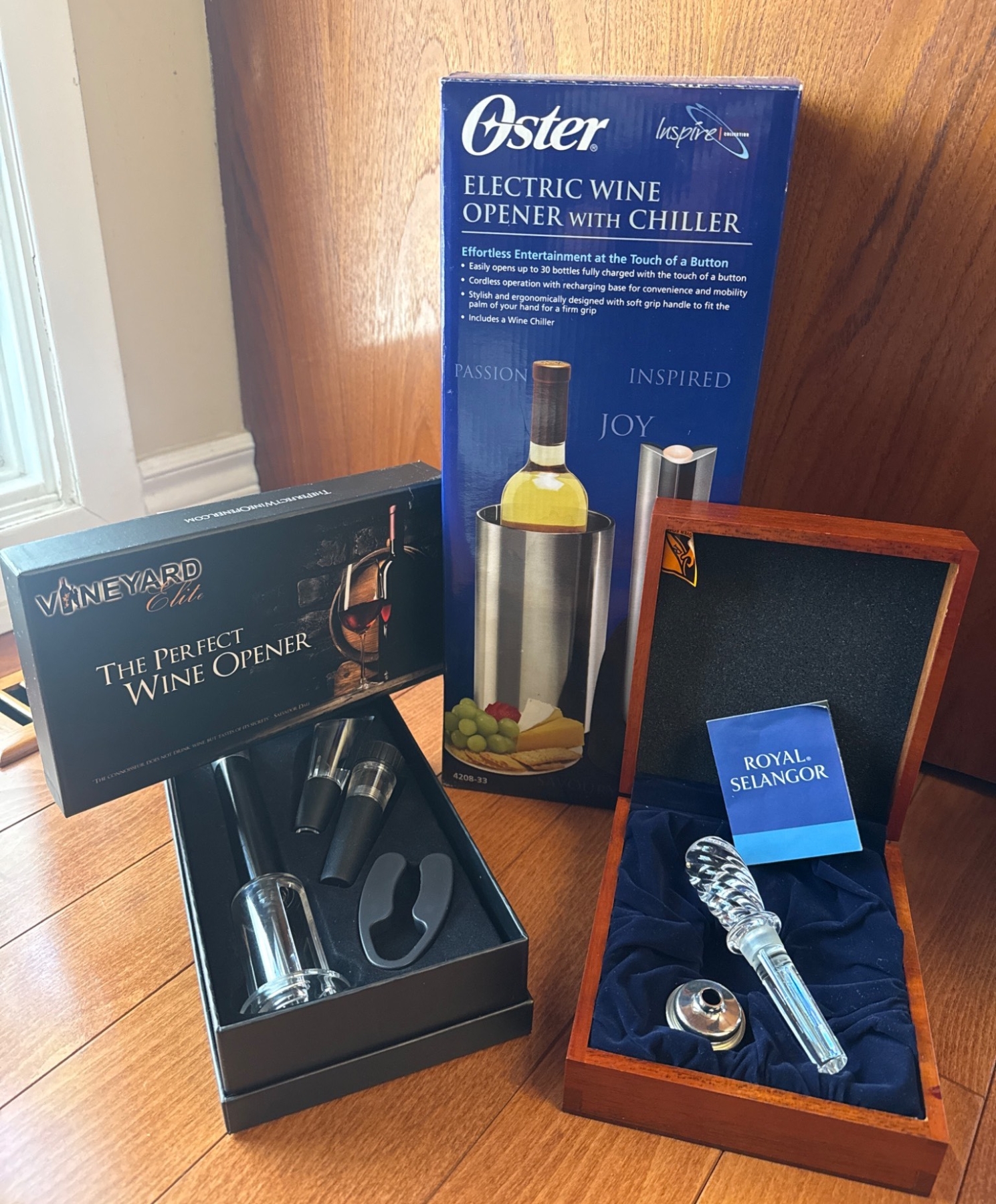Three-piece wine accessory set including an Oster electric wine opener with chiller (in box), a Royal Selangor crystal and pewter wine stopper presented in a lined wooden display box, and a Vineyard Elite set featuring a manual wine opener with foil cutter, aerator, and pourer. Dimensions: Oster boxed set approximately 10 x 5 x 5 inches; Royal Selangor stopper box 7 x 5 x 3 inches; Vineyard Elite box 8 x 5 x 2 inches.
