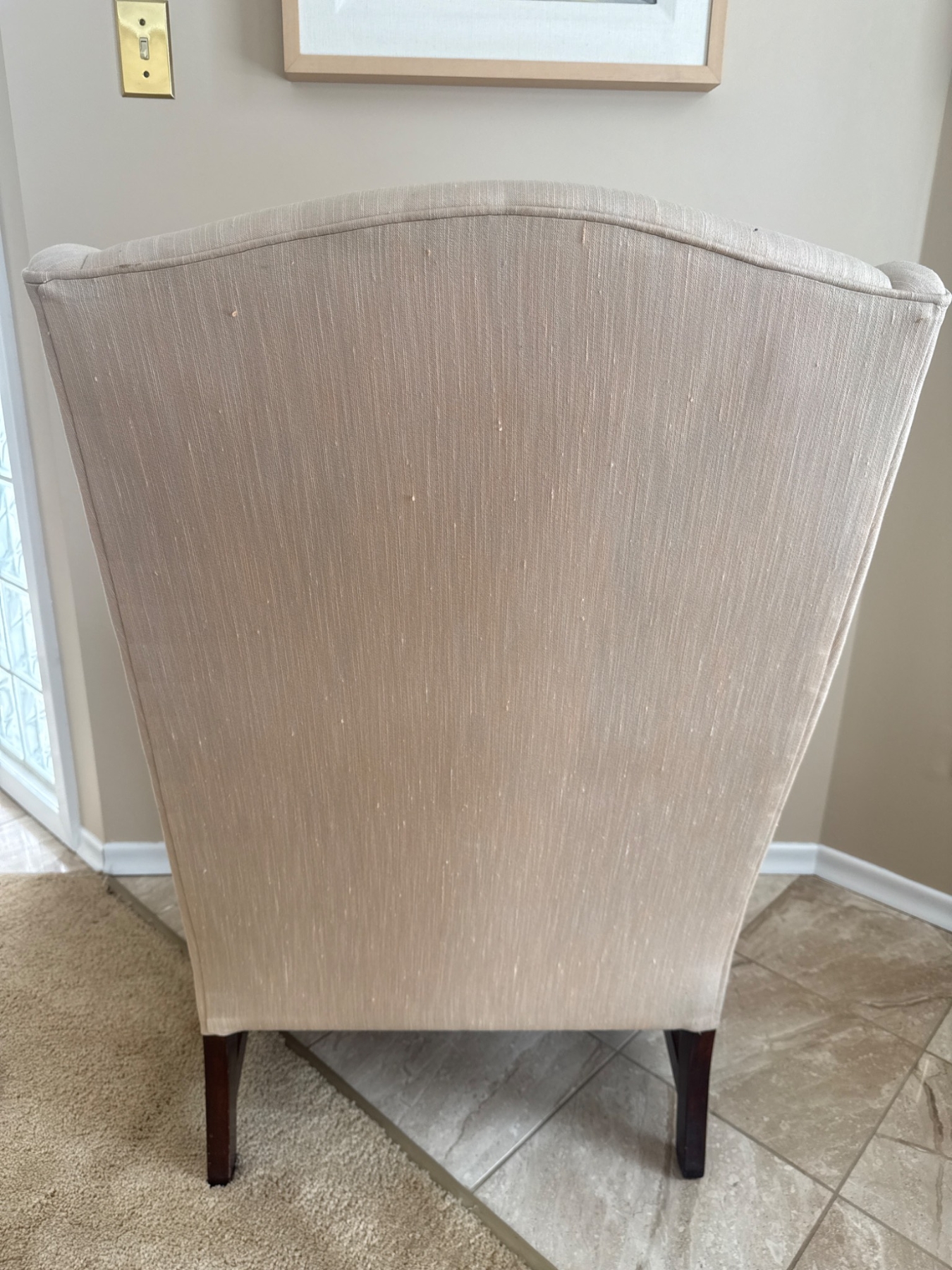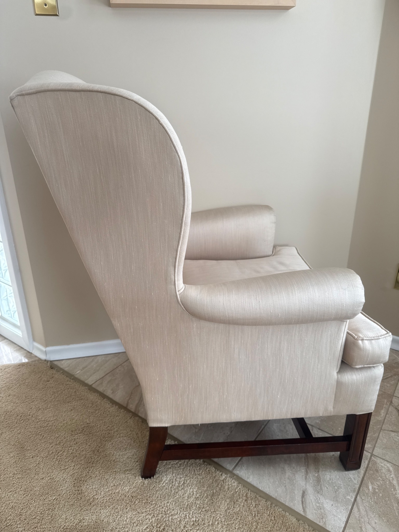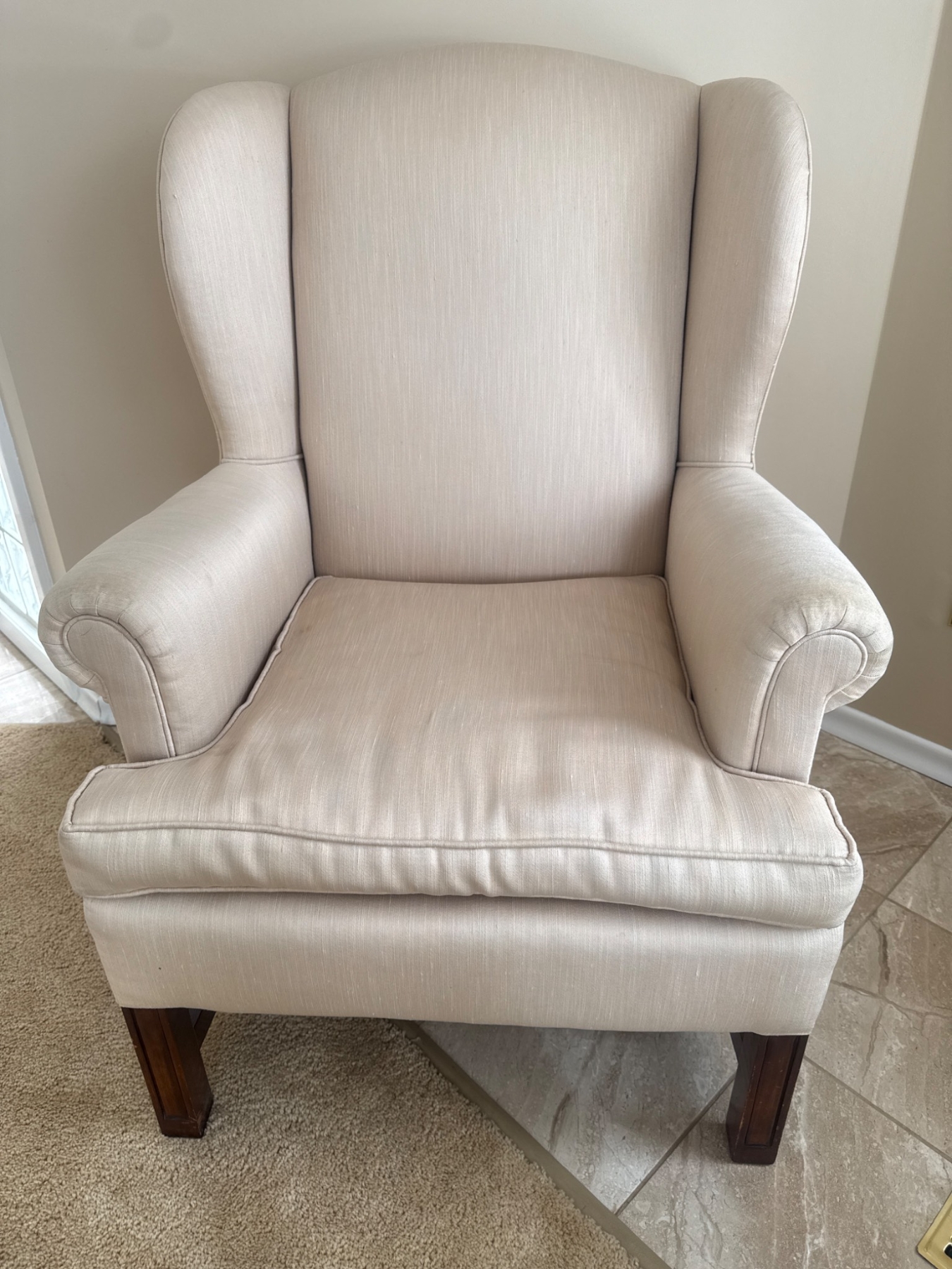 Classic wingback armchair featuring neutral beige upholstery and sturdy wooden legs. The piece has an inviting, timeless design suitable for both traditional and contemporary spaces. Upholstery and cushioning appear in good shape, ensuring both style and comfort. A functional and stylish addition to any living room, study, or bedroom.