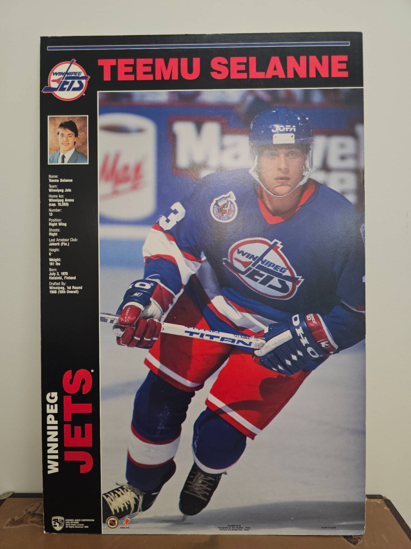 Celebrate hockey history with this vibrant poster featuring Teemu Selanne in his Winnipeg Jets uniform. Measuring 22 inches wide by 33 inches high, the poster captures an iconic moment from his legendary career. A must-have for sports enthusiasts or Winnipeg Jets fans, this piece is perfect for framing or display in any sports collection.