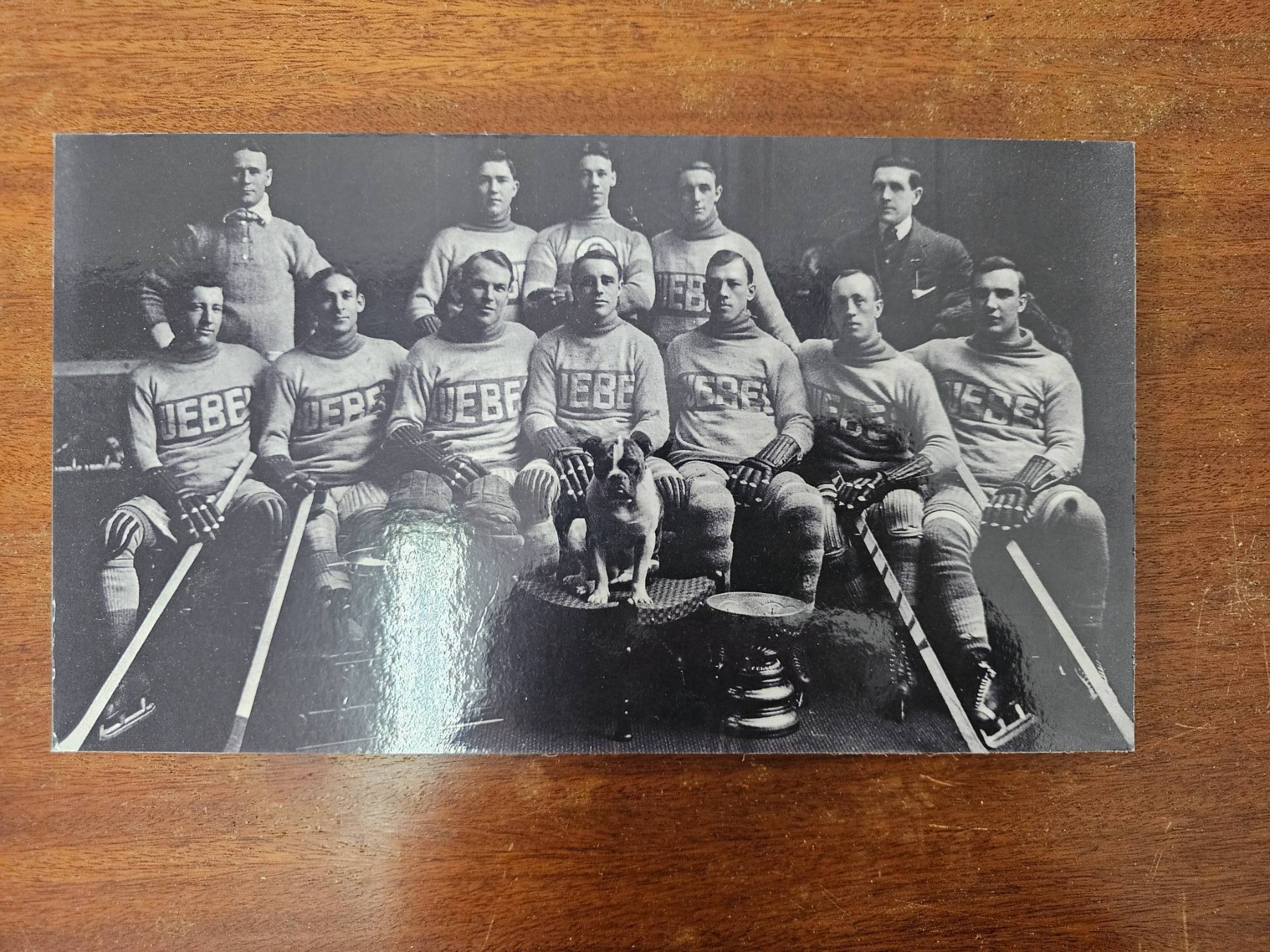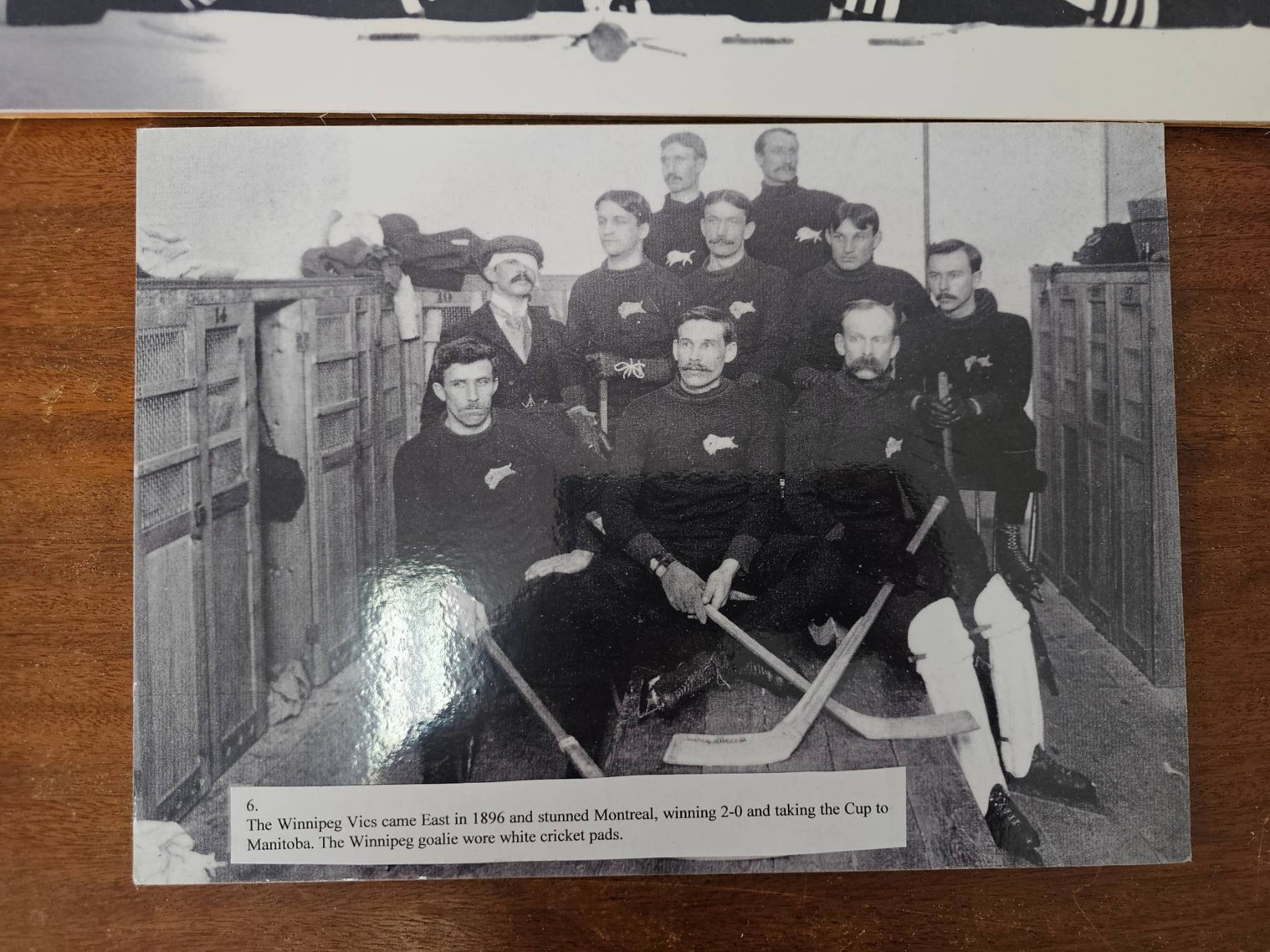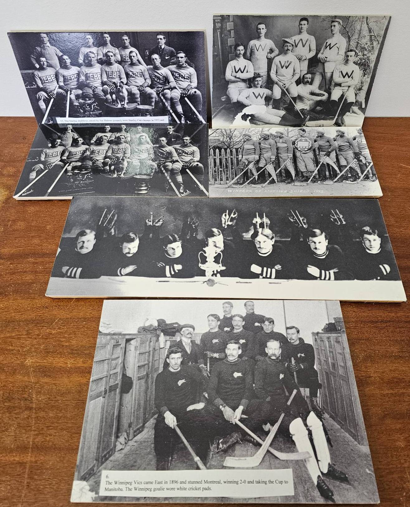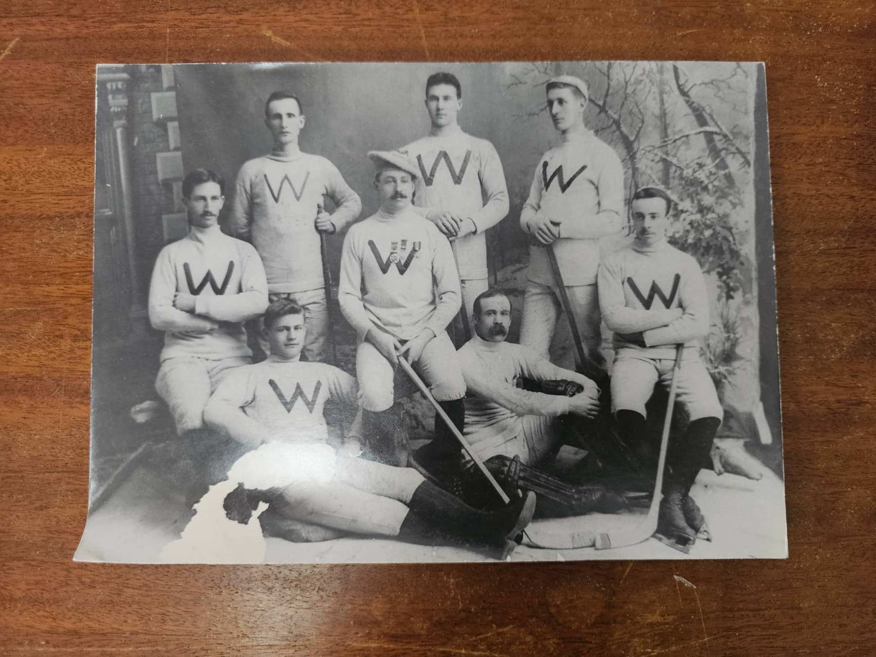 Lot comprises a collection of vintage black-and-white photographs depicting ice hockey teams in various group poses. The images include teams holding hockey sticks, trophies, and wearing uniforms with visible markings such as "W" and "SEB" Condition varies, with some photographs showing surface wear or damage. Includes captions and details handwritten or typed on the reverse.