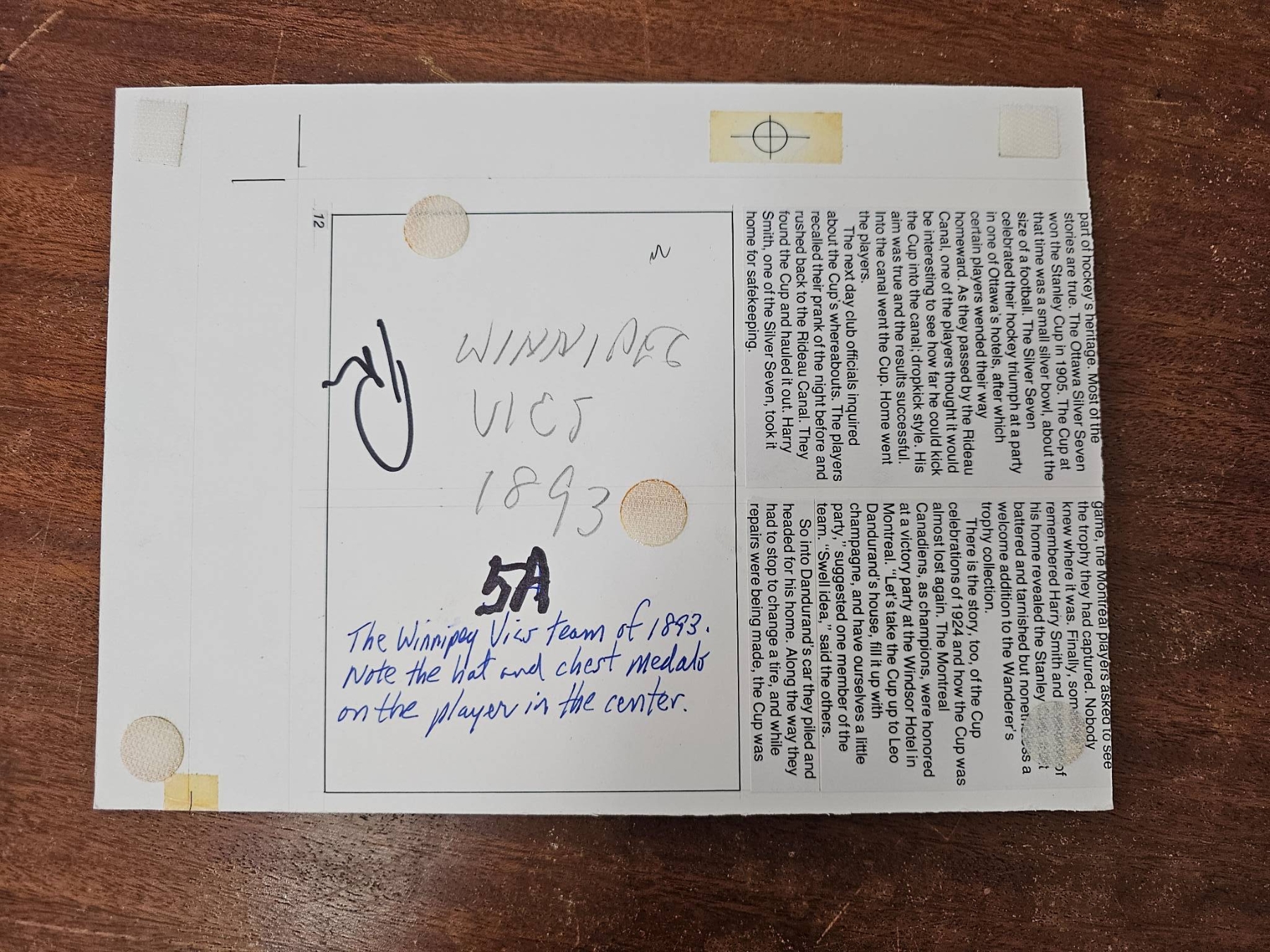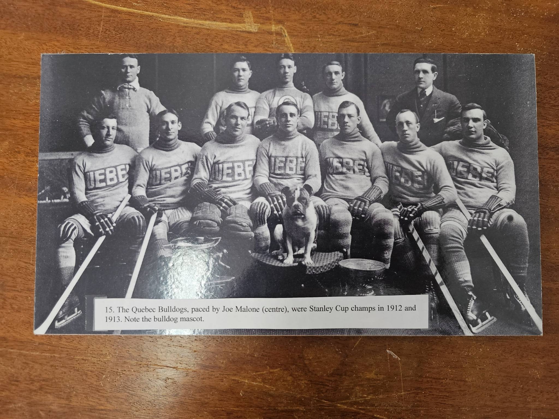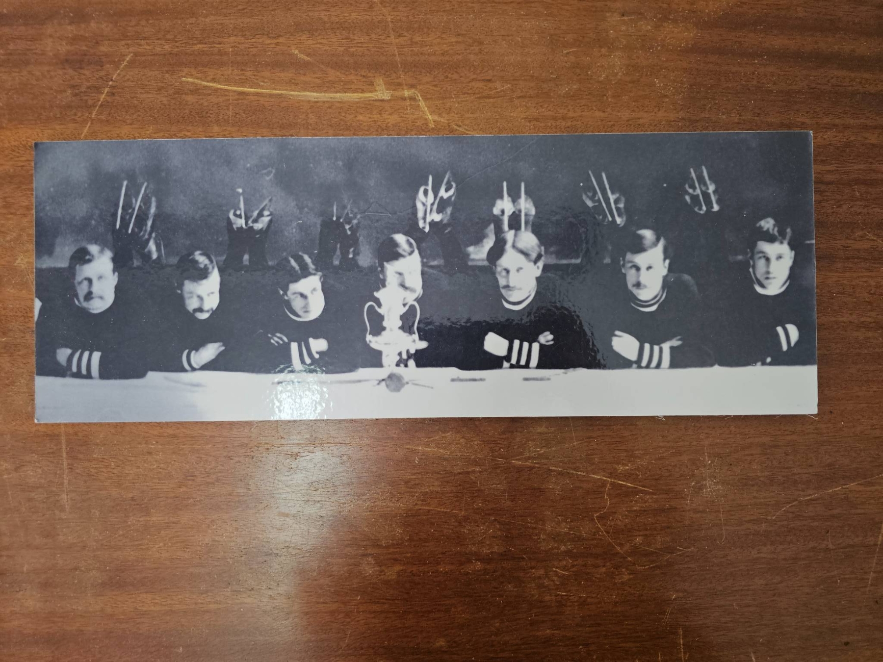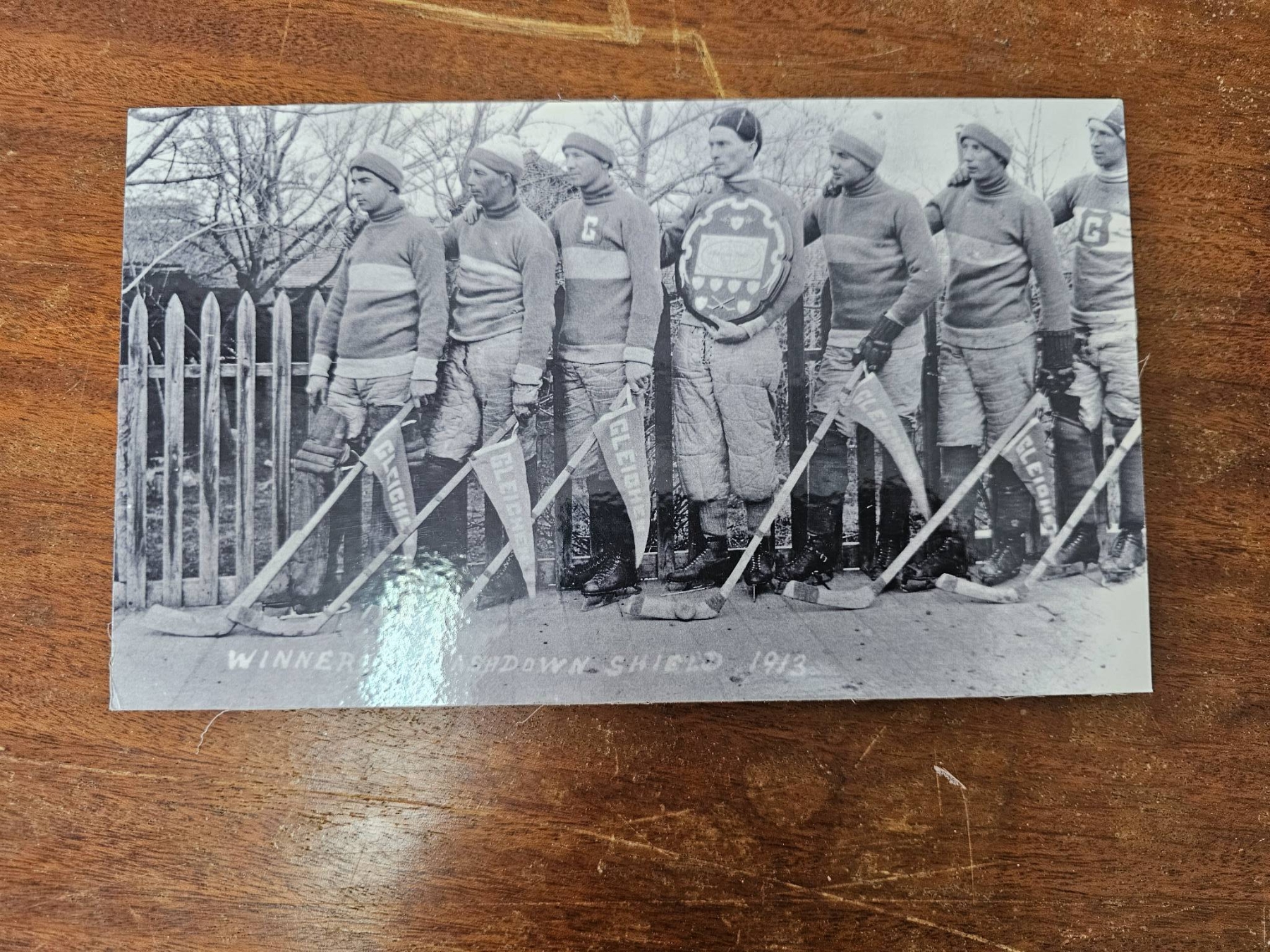 Lot comprises a collection of vintage black-and-white photographs depicting ice hockey teams in various group poses. The images include teams holding hockey sticks, trophies, and wearing uniforms with visible markings such as "W" and "SEB" Condition varies, with some photographs showing surface wear or damage. Includes captions and details handwritten or typed on the reverse.