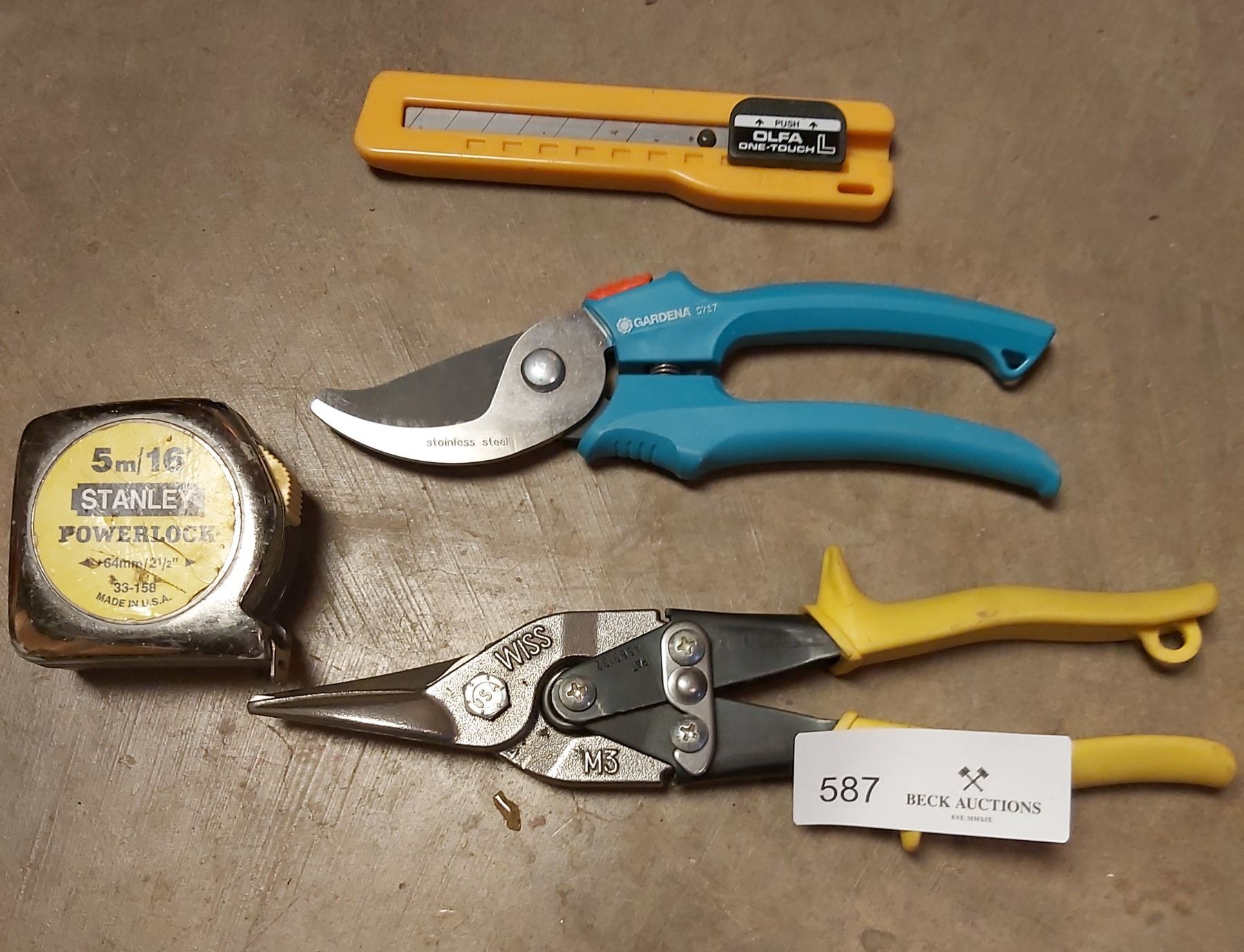 Wiss M3 Tin Snips, Gardena Pruning Shears, Utility Knife and Tape Measure