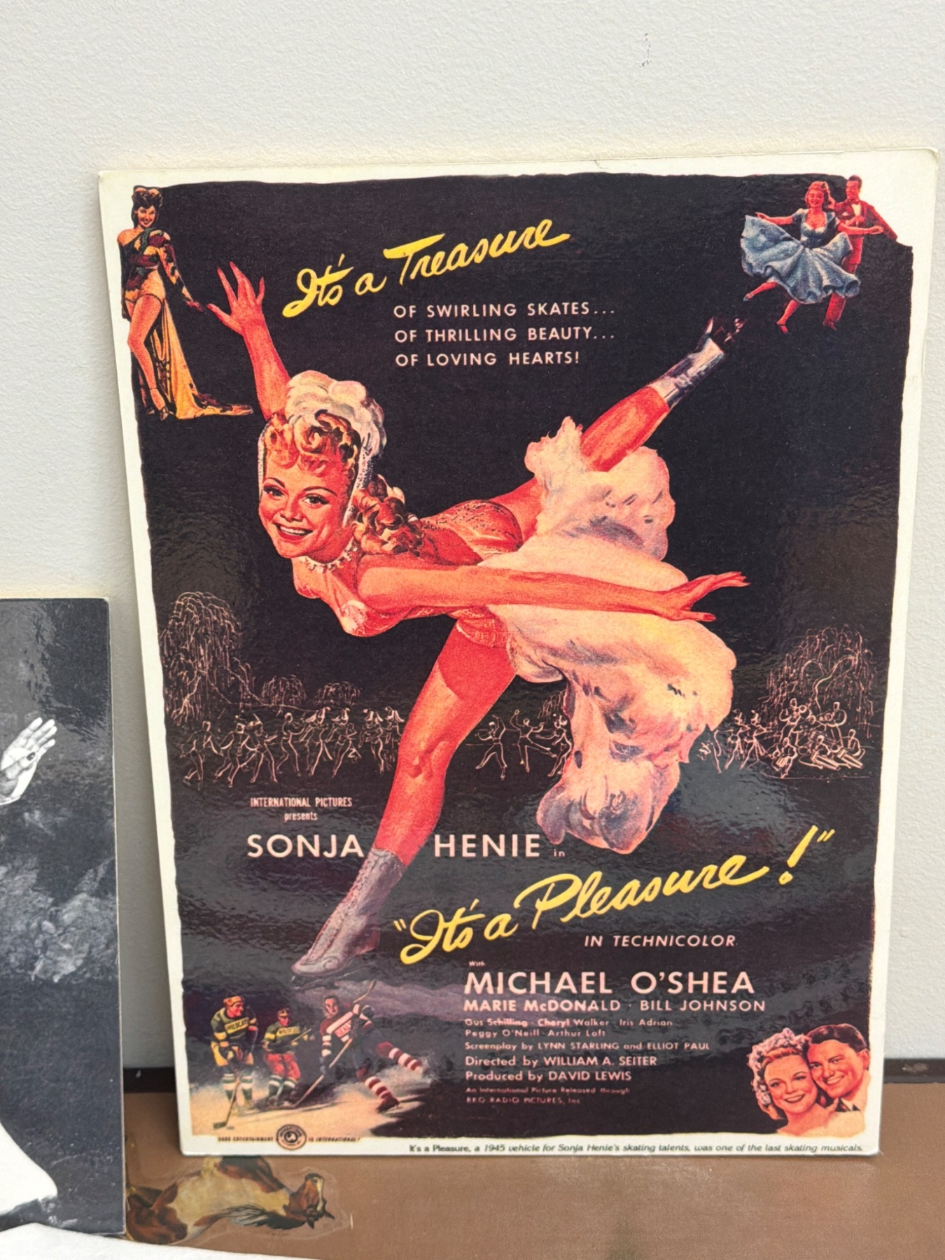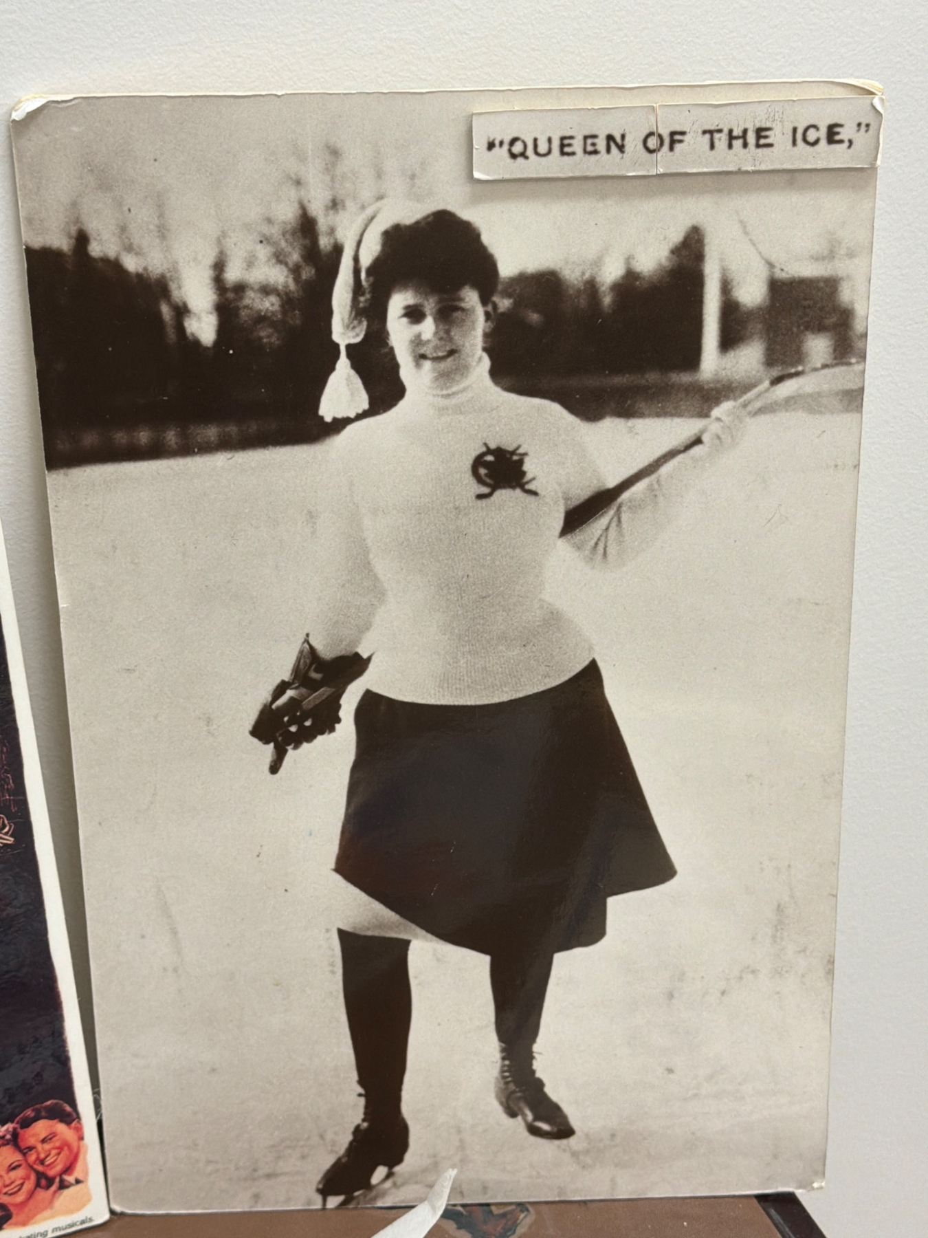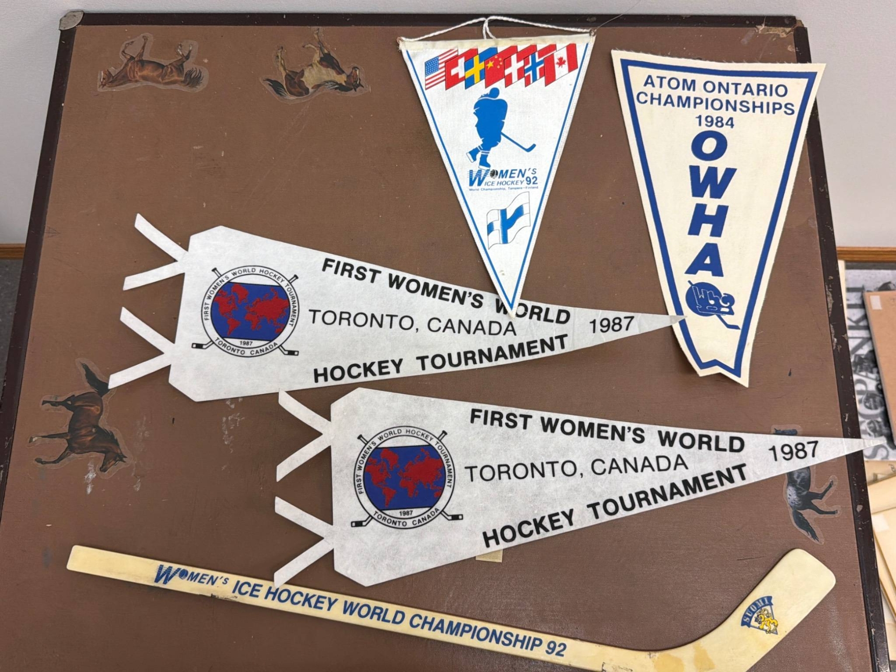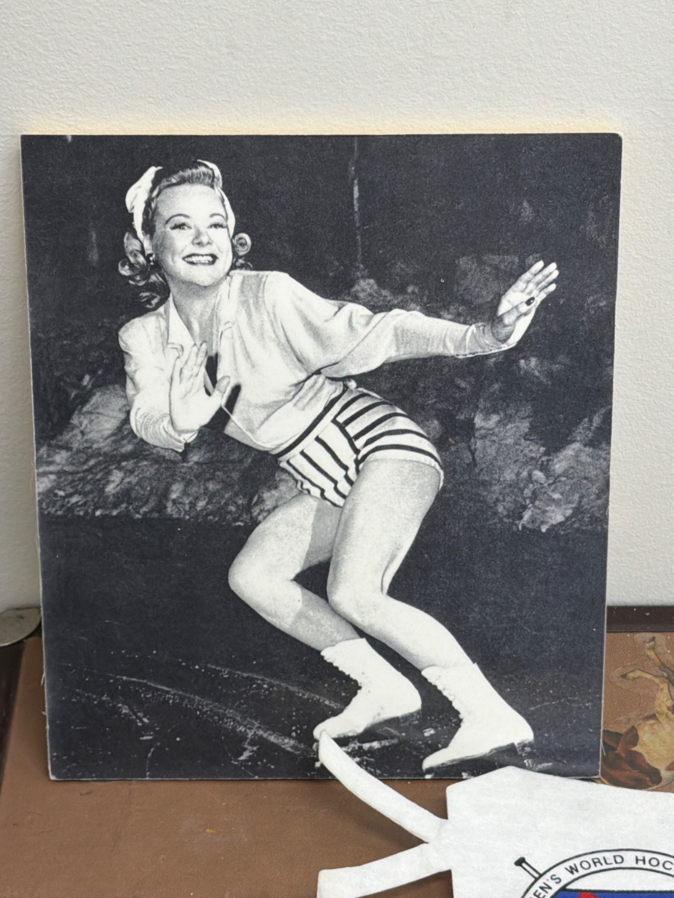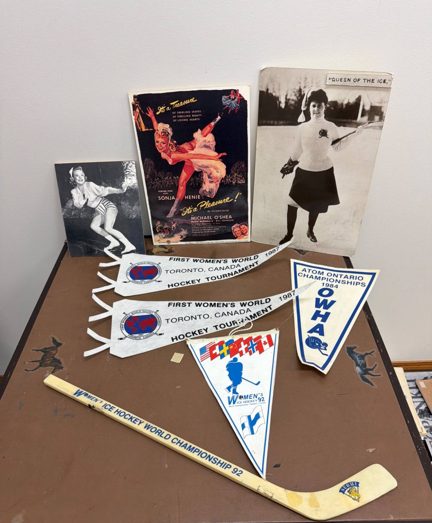A unique collection of women's ice hockey and skating memorabilia, featuring items such as posters, including a Sonja Henie film promotion, historic photographs, and international hockey tournament banners. Also included is a commemorative mini hockey stick from the 1992 Women's Ice Hockey World Championship. Perfect for fans of women's sports history or ice skating enthusiasts.