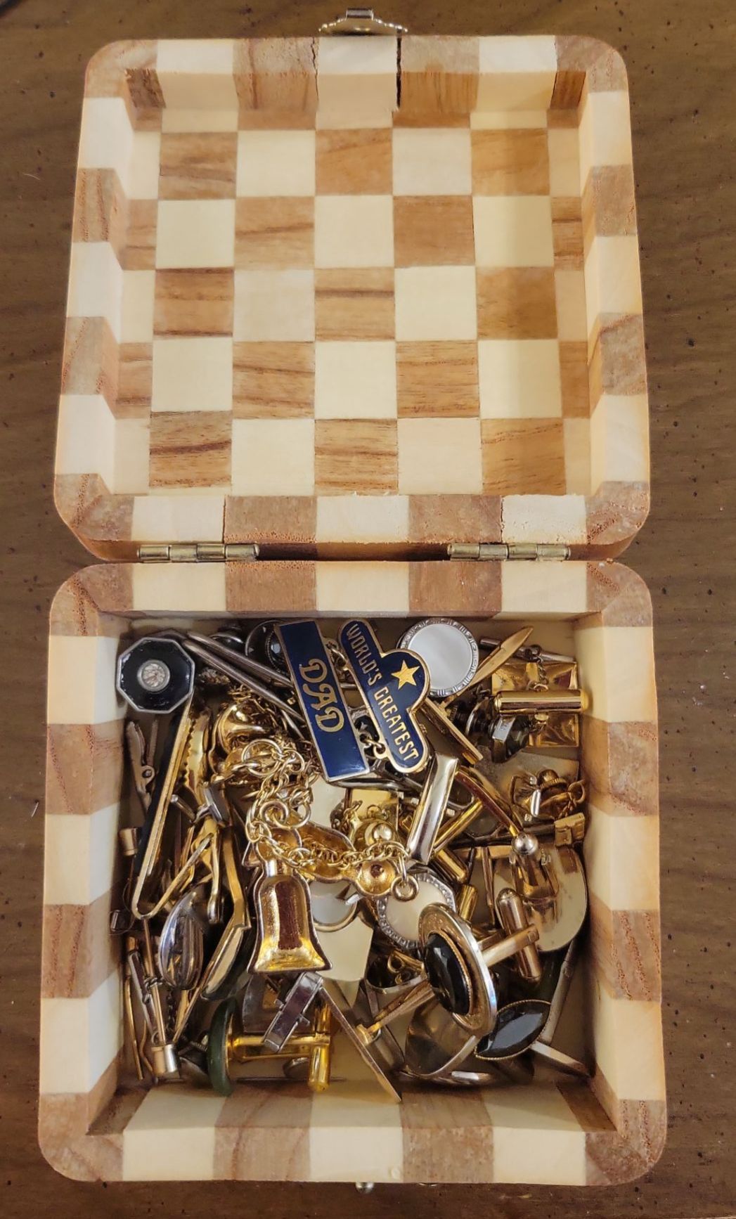 Wood Checkered Keepsake Box Jam Packed w/ Cufflinks Tie Pins & More
