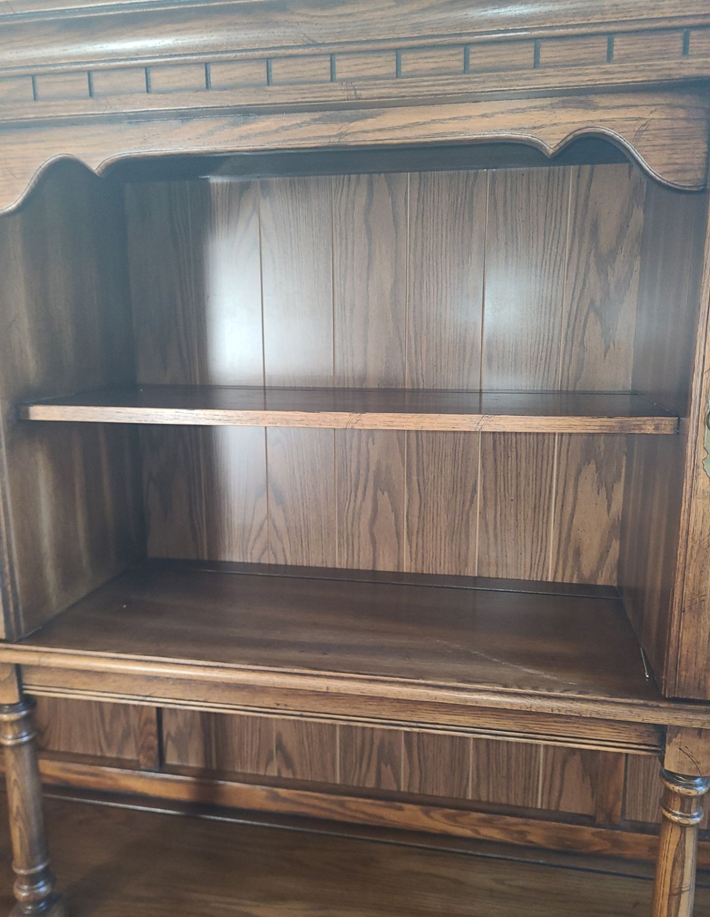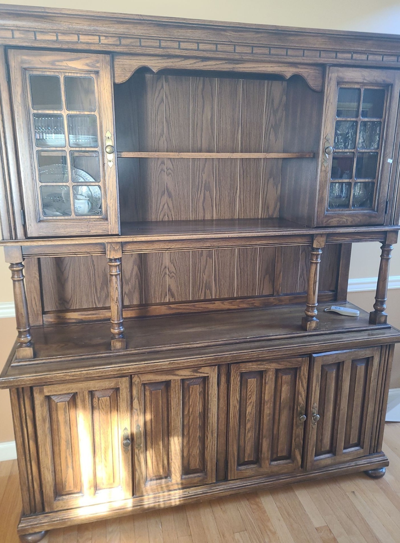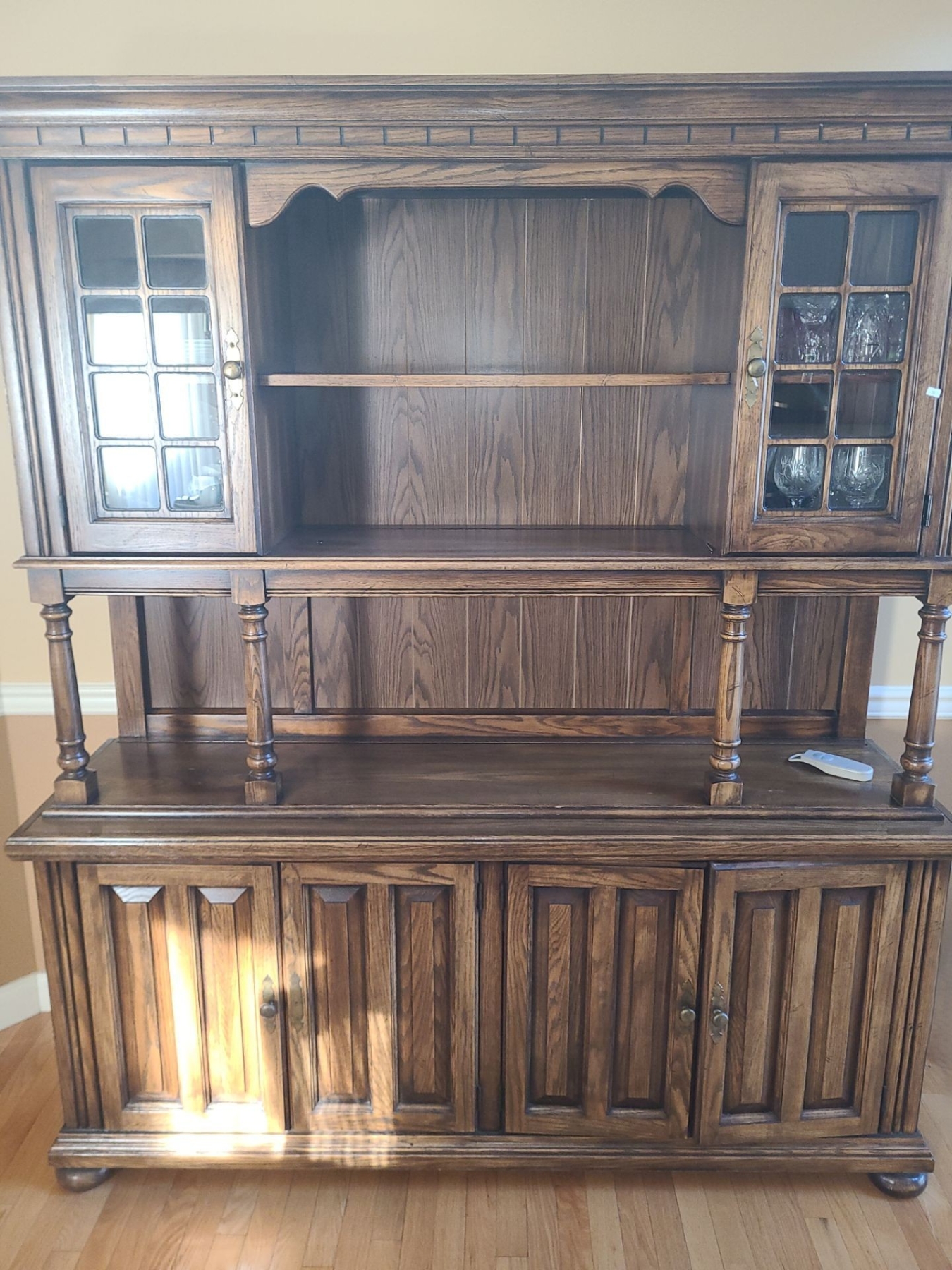 Very Heavy, Bring Assistance to Move, 1 Knob Missing as Shown- Glassware in Upper Cabinet Shown is Included, Bottom Contents Blurred/ Not Included