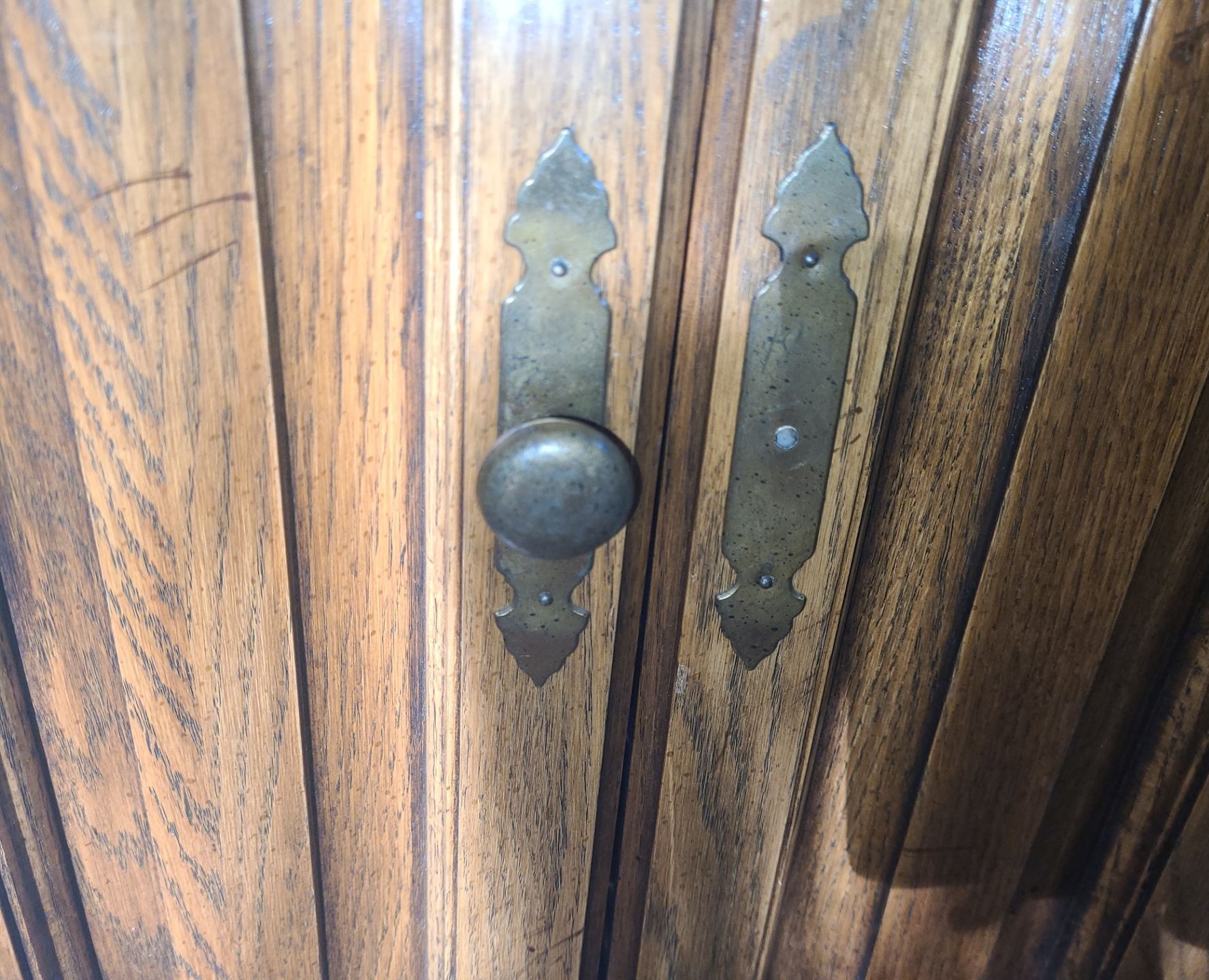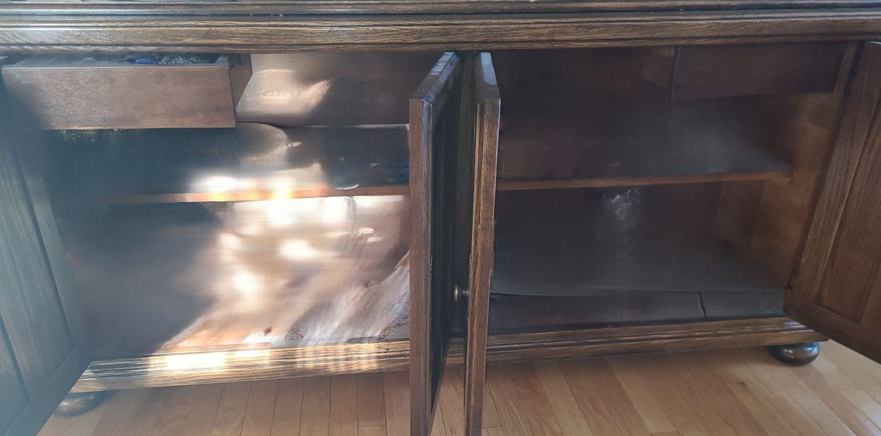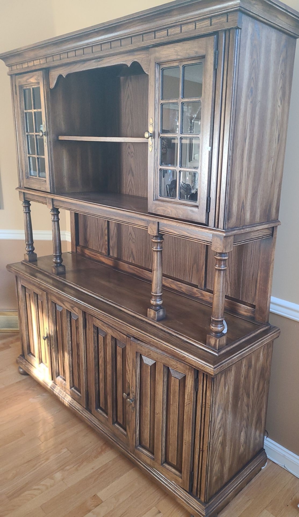 Very Heavy, Bring Assistance to Move, 1 Knob Missing as Shown- Glassware in Upper Cabinet Shown is Included, Bottom Contents Blurred/ Not Included