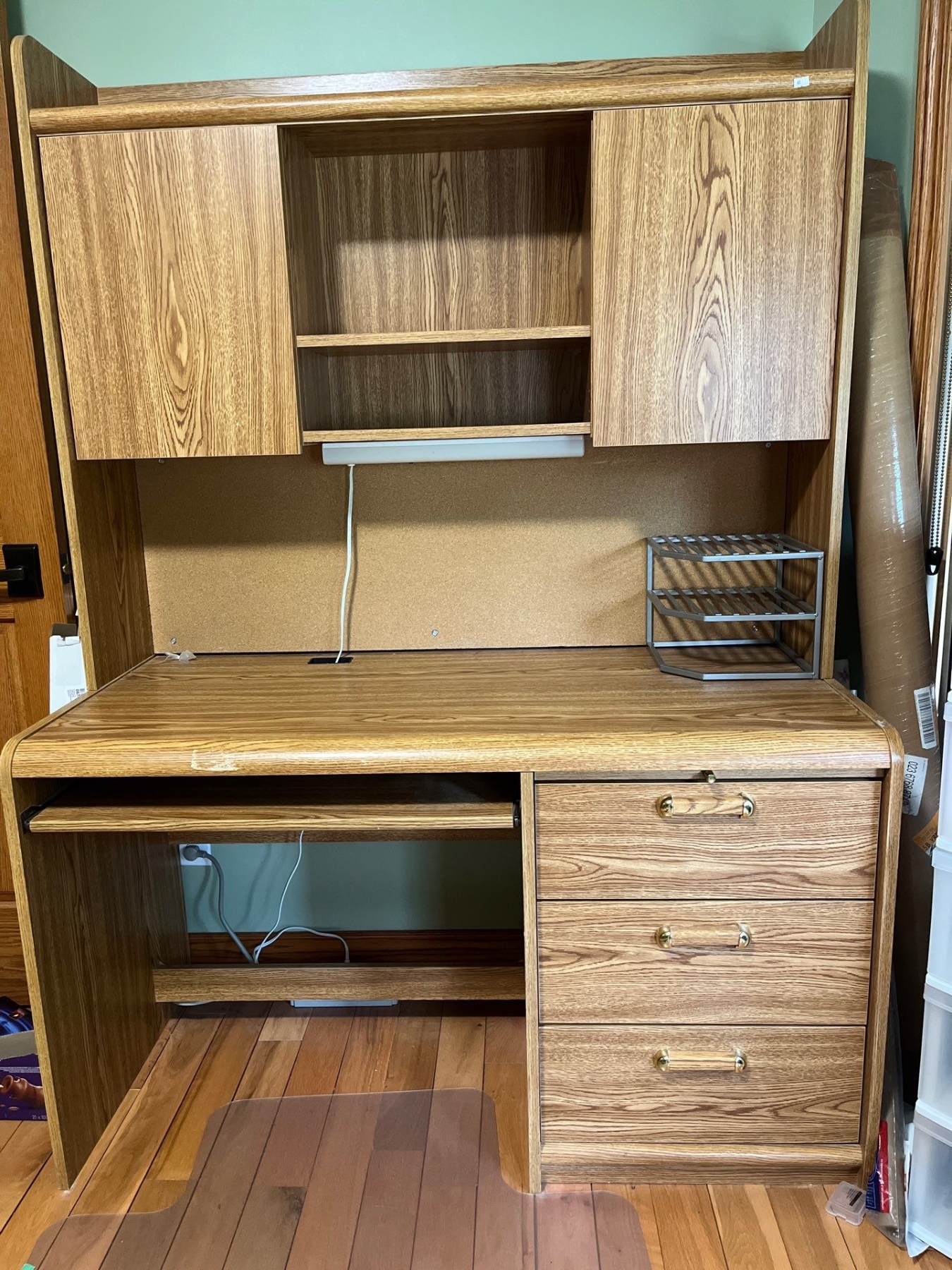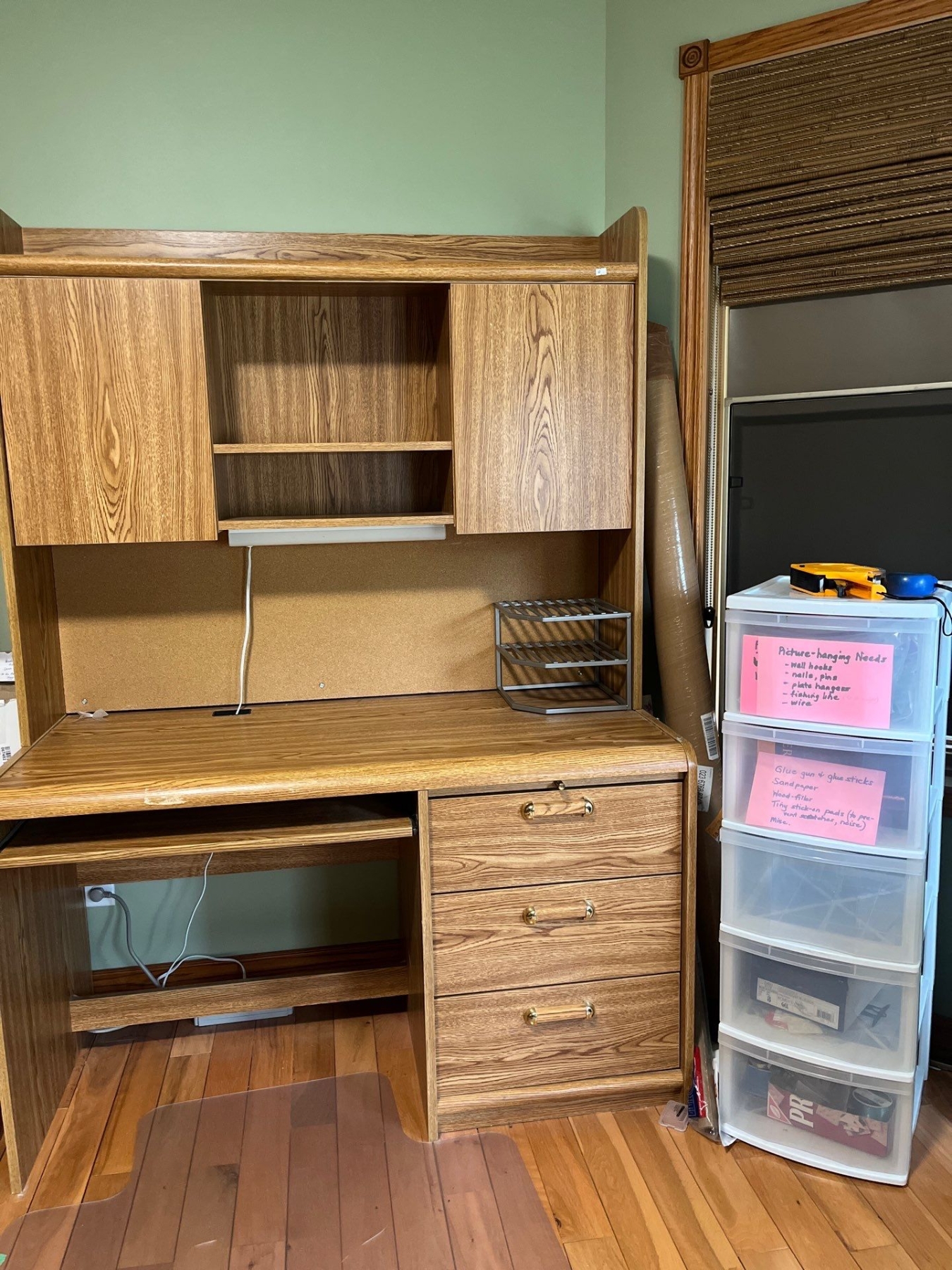 Wood Desk With Plastic Storage Shelves and Office Supplies Desk L50" W24" H70"