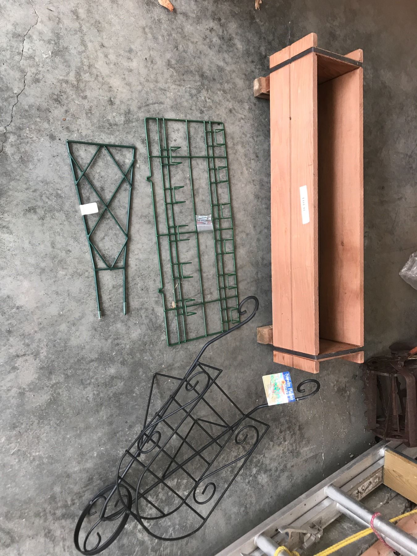 Wood Flower Box, Metal Wheelbarrow & Hangers