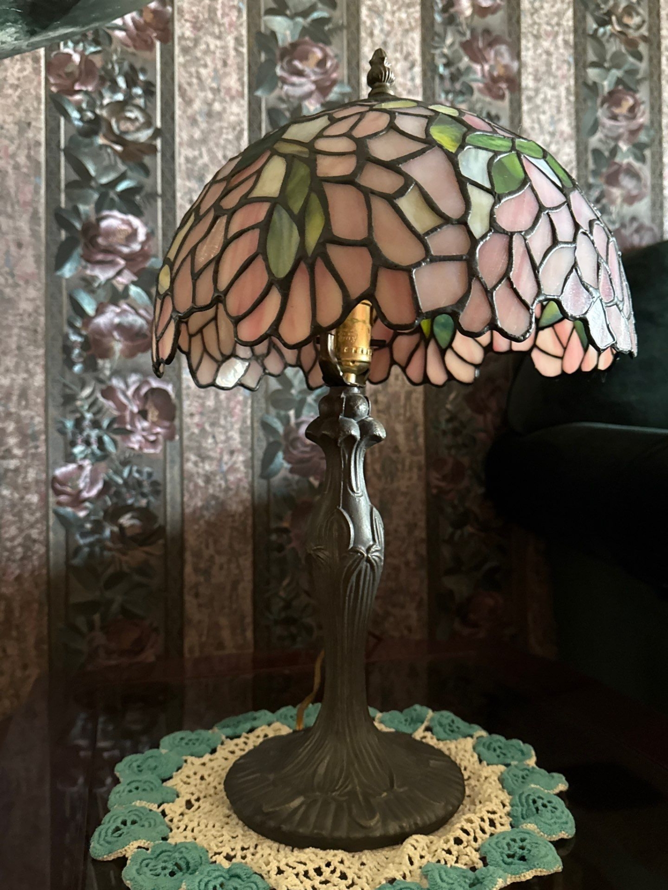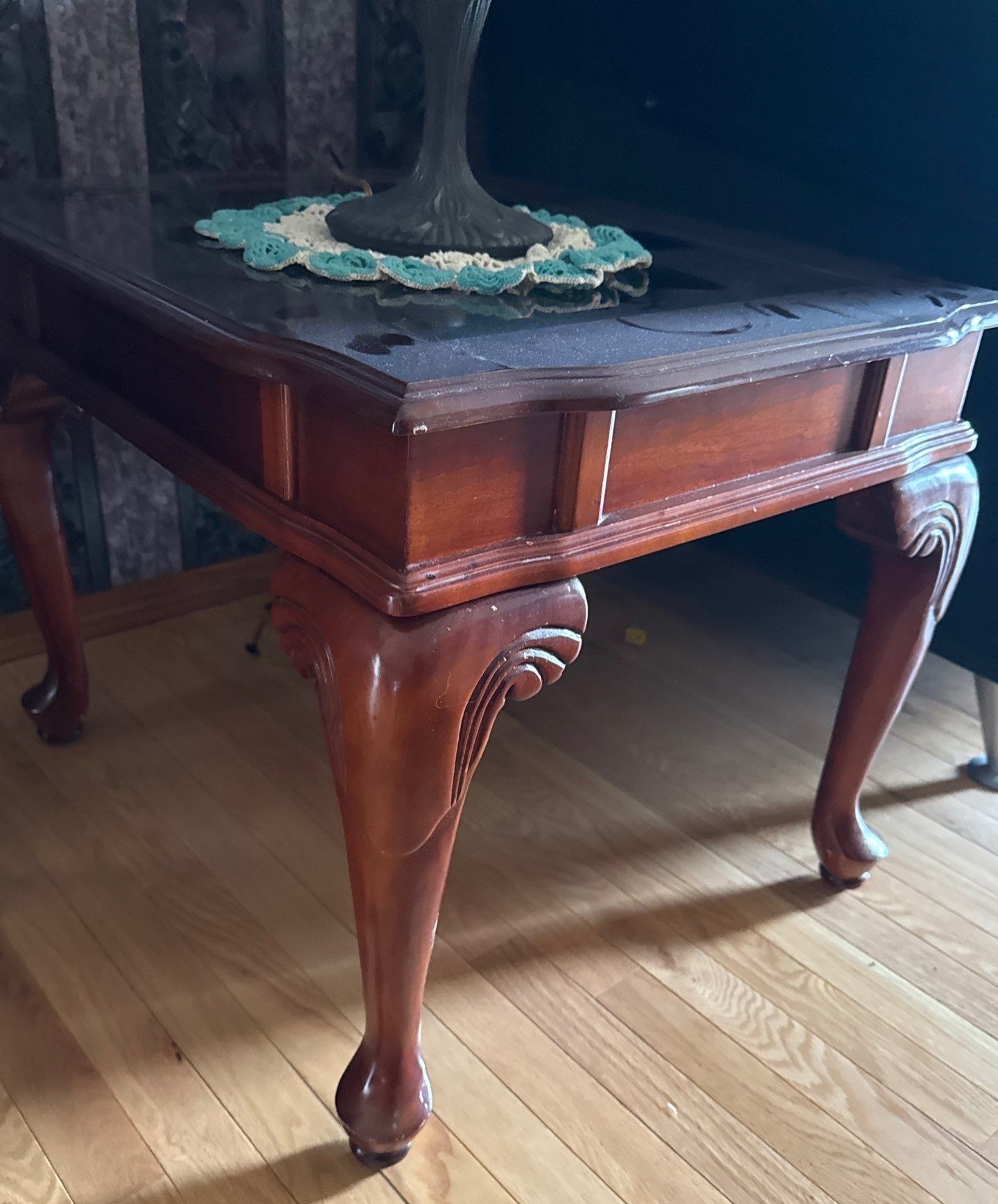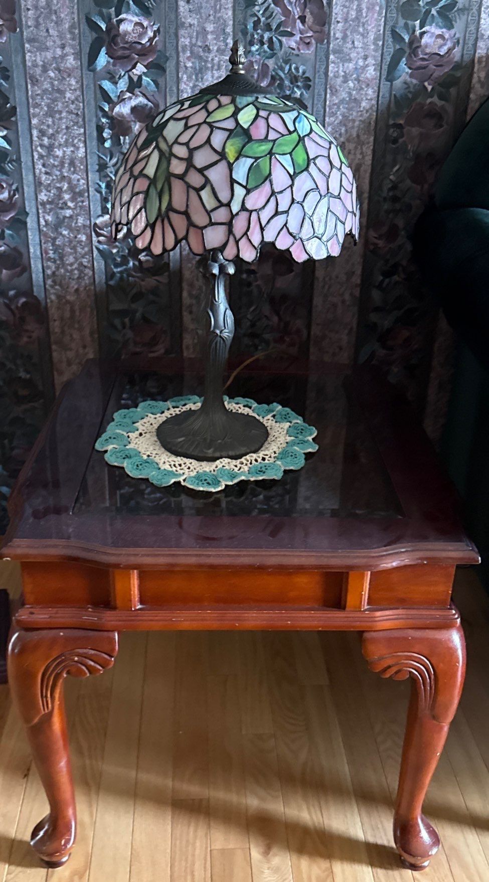 Wood & Glass Table w/ Tiffany Style Lamp, Table is 23W, 27D, 22T