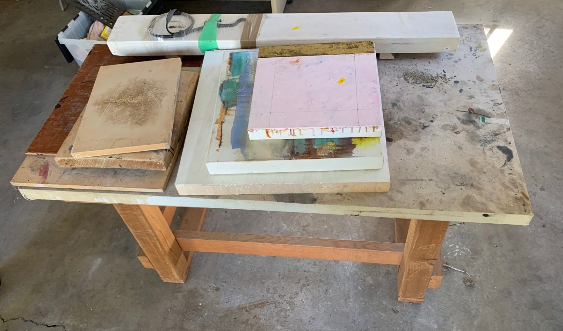 Wood Shop Table With Art Supplies Canvasses