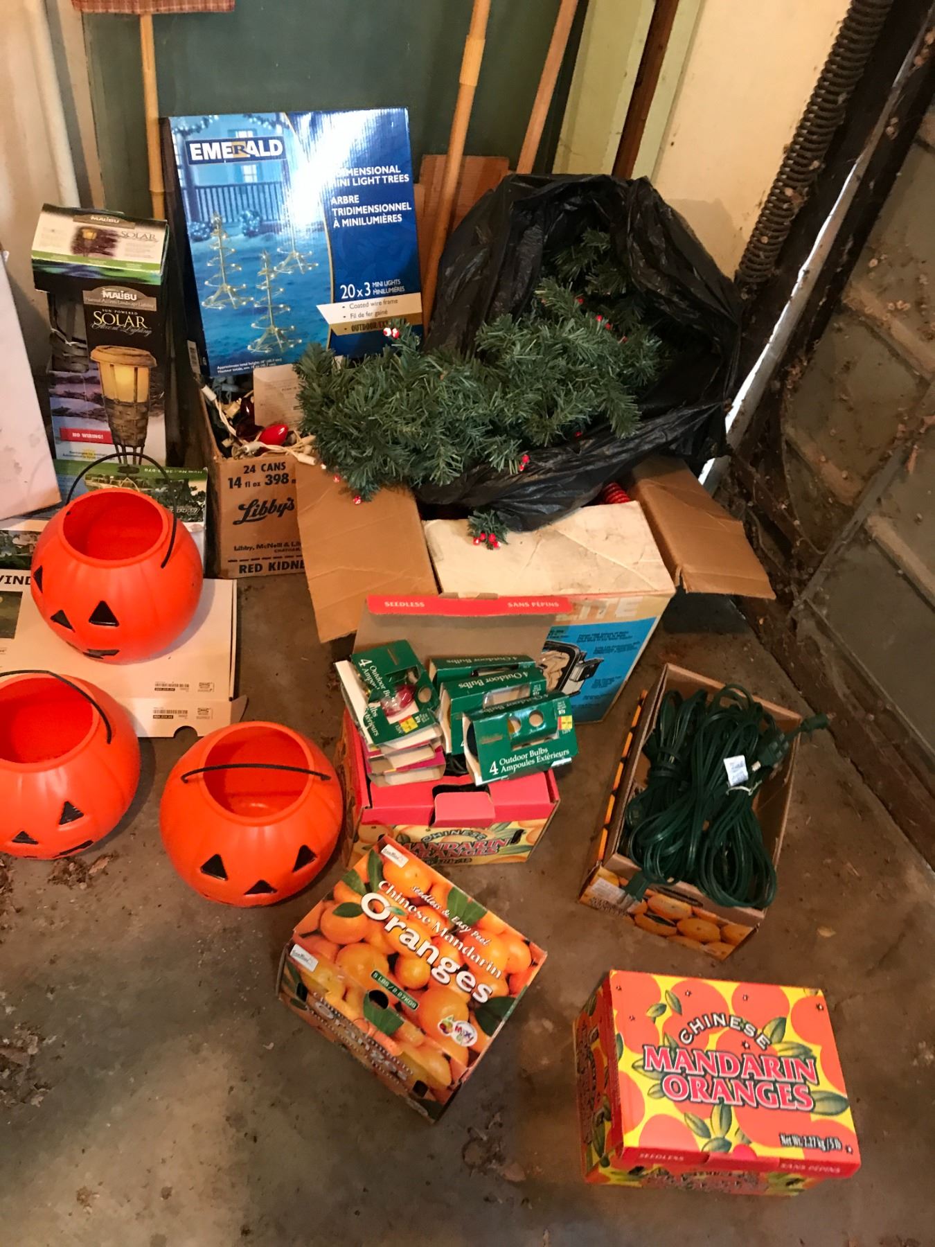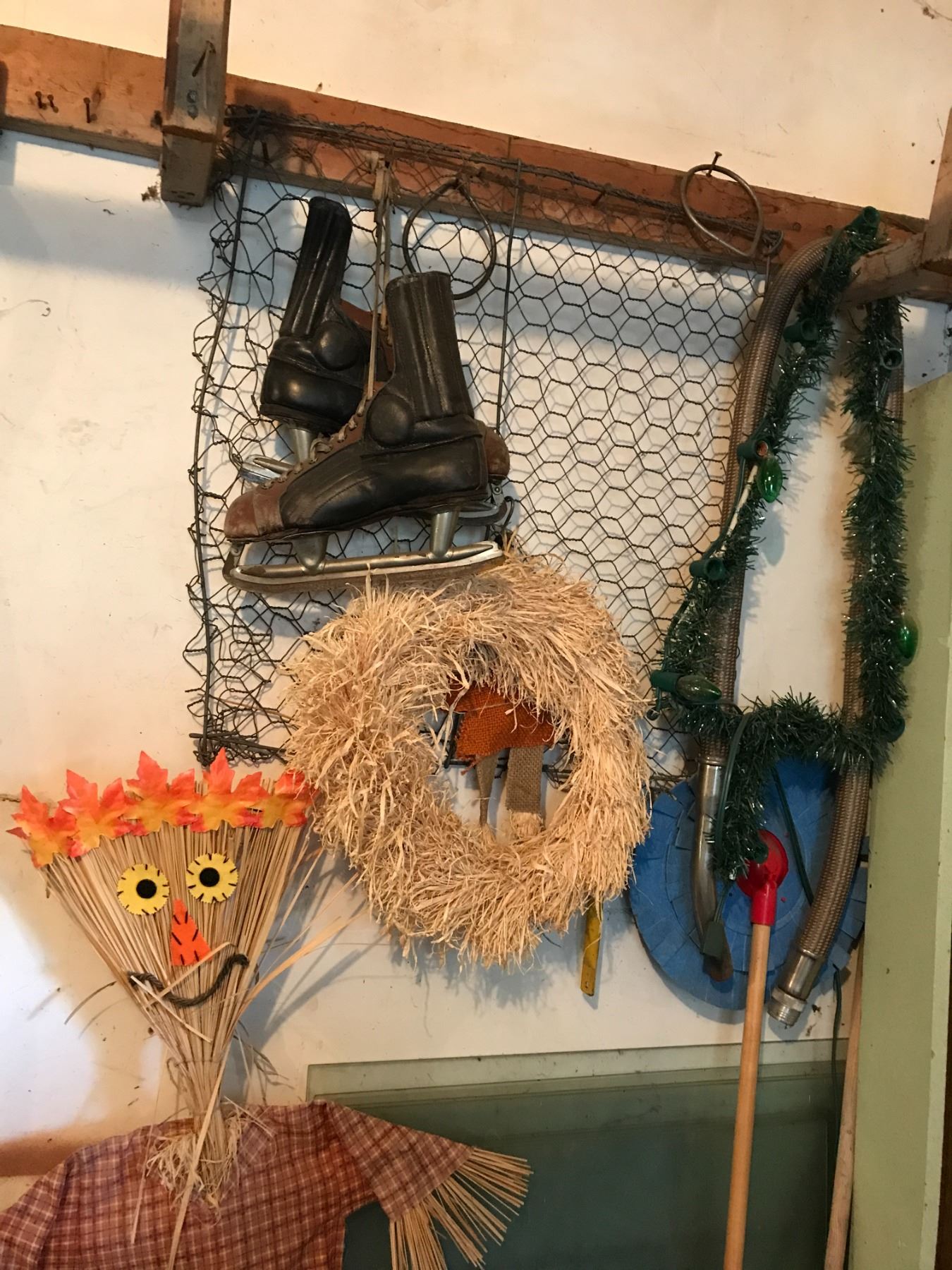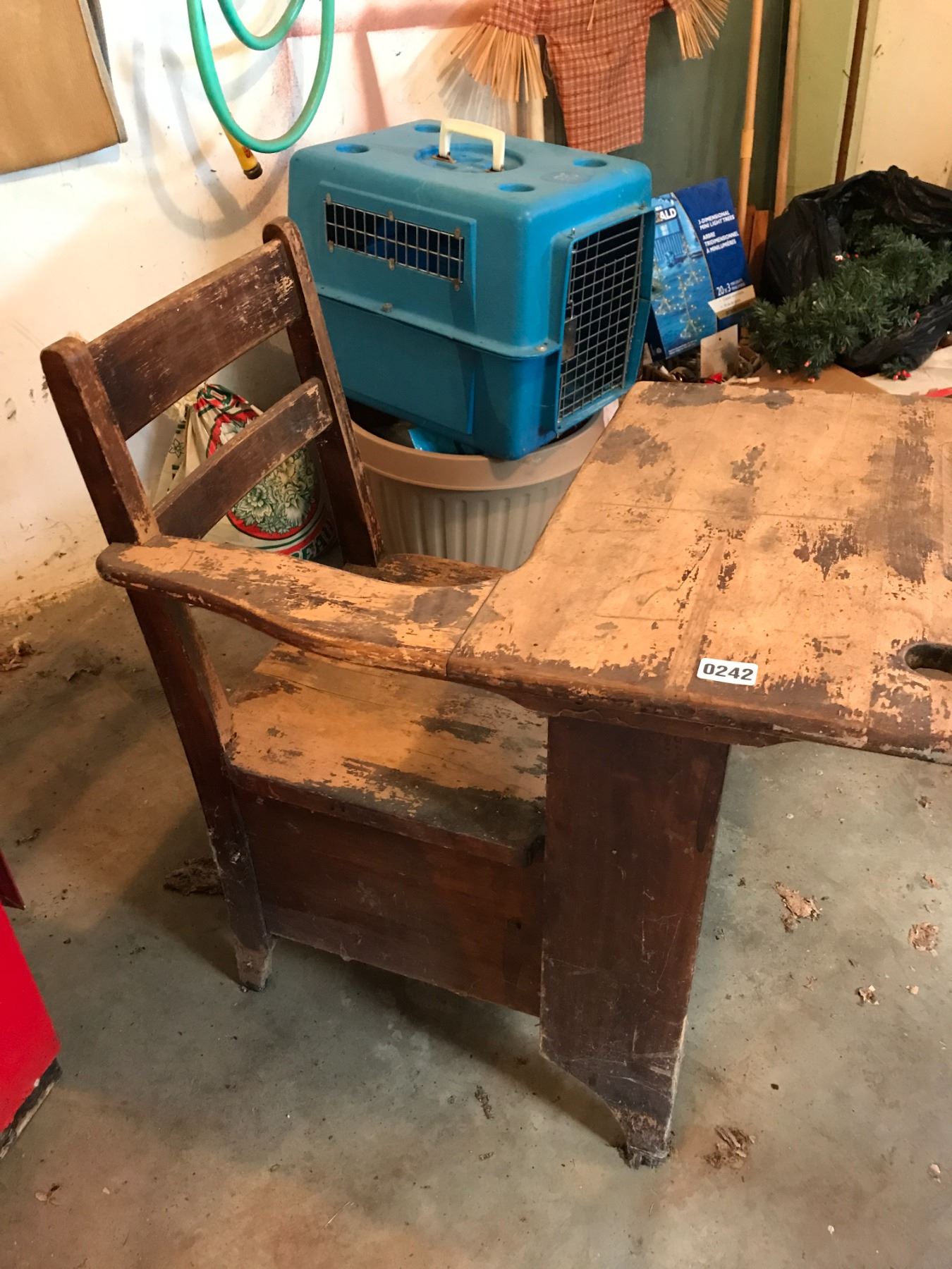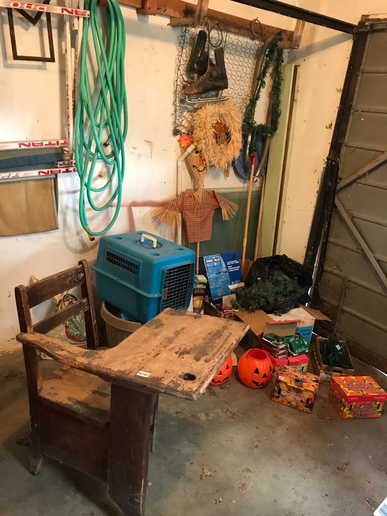 Wood Vintage School Desk, Skates, Pet Carrier, Christmas/Halloween Decorations & Homelite Easy Start Pump